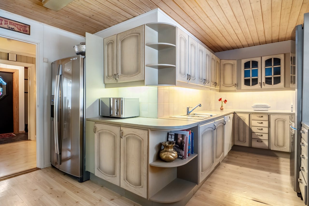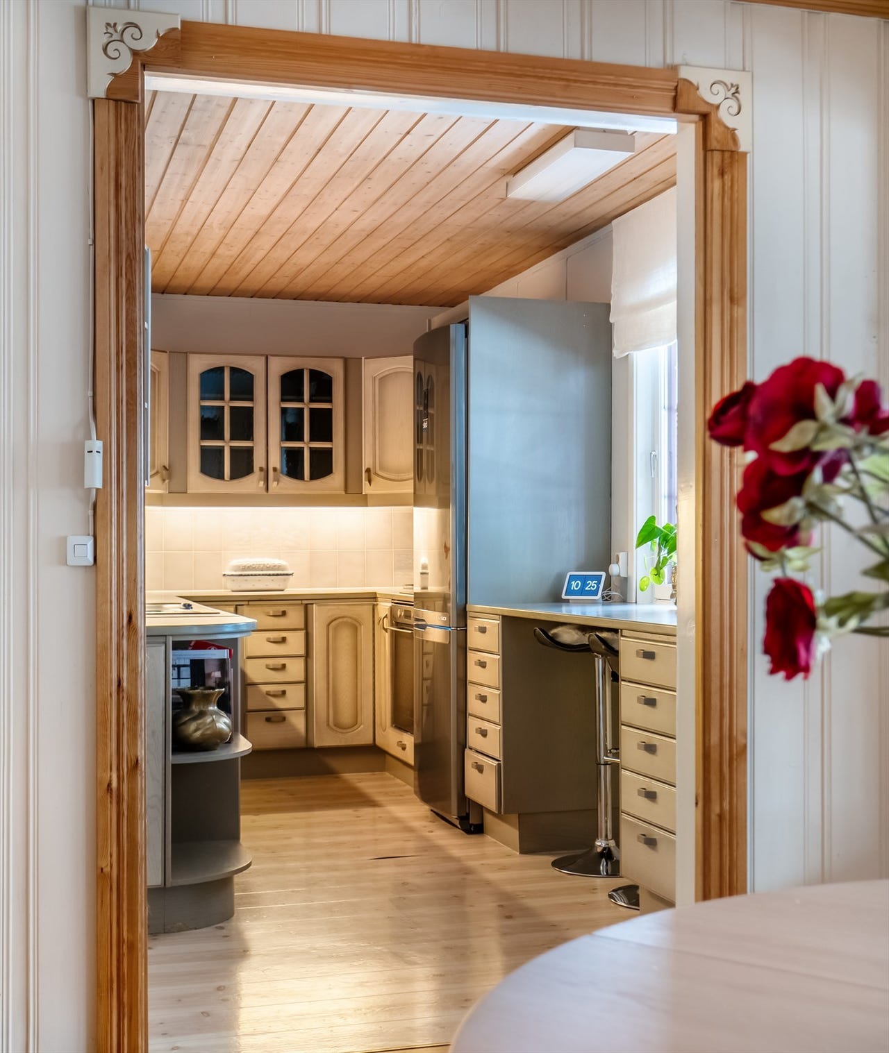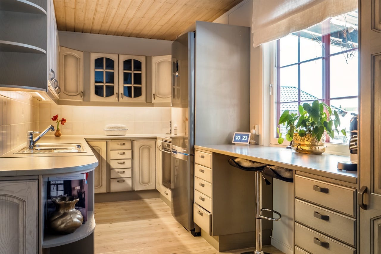 Stort kjøkken med innredning av malte fronter og laminerte skrog. To overskap med glassfelt. benkeplate i laminat. Fliser på vegg over benkeplater. Kjøkkenet er innredet med integrerte hvitevarer som koketopp og stekeovn. Øvrige hvitevarer er montert i nisjer. Godt med skap- og benkeplass. Plass for to barkrakker ved vinduet for spiseplass. Ikke montert lekkasjevakt eller komfyrvakt. Ventilator over koketopp, med avkast ført via yttervegg direkte til friluft.