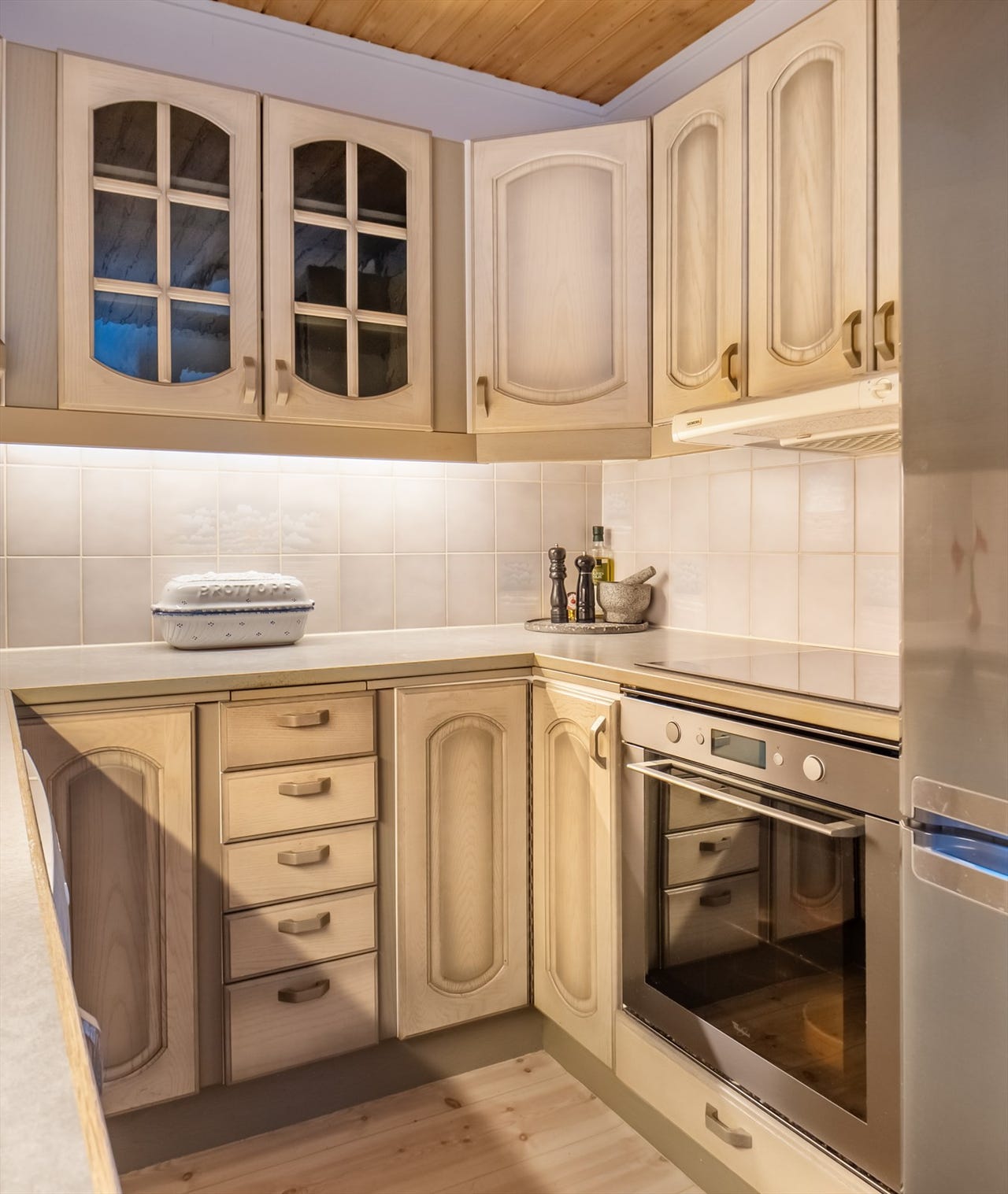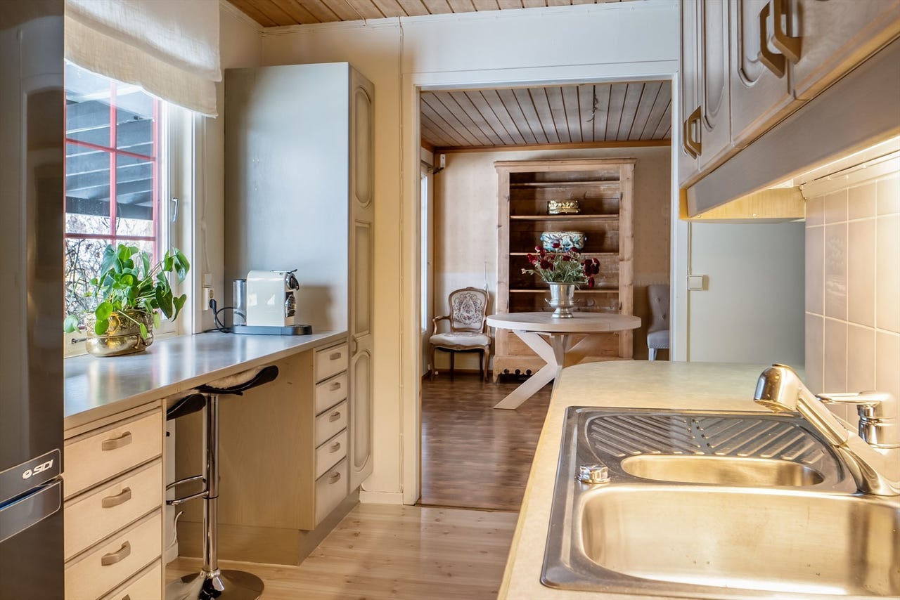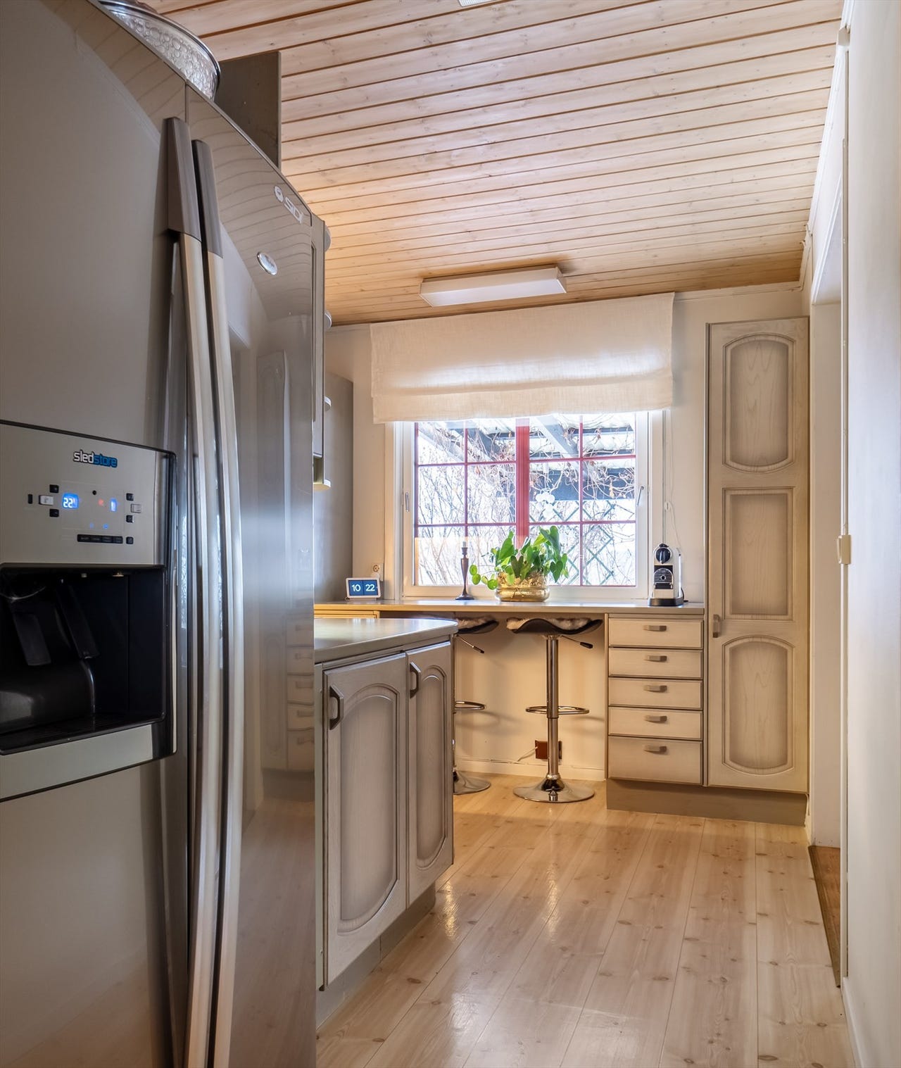 Stort kjøkken med innredning av malte fronter og laminerte skrog. To overskap med glassfelt. benkeplate i laminat. Fliser på vegg over benkeplater. Kjøkkenet er innredet med integrerte hvitevarer som koketopp og stekeovn. Øvrige hvitevarer er montert i nisjer. Godt med skap- og benkeplass. Plass for to barkrakker ved vinduet for spiseplass. Ikke montert lekkasjevakt eller komfyrvakt. Ventilator over koketopp, med avkast ført via yttervegg direkte til friluft.