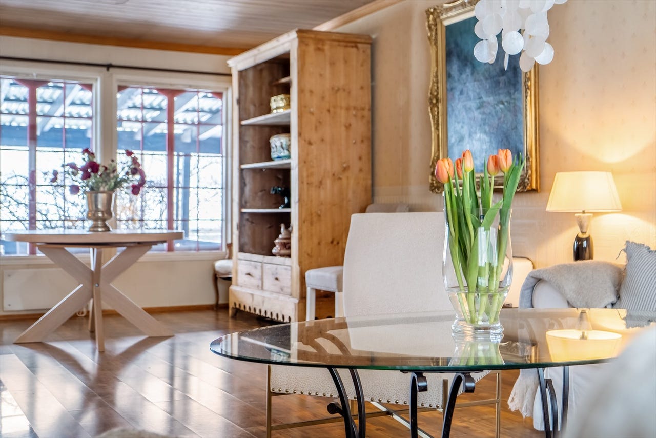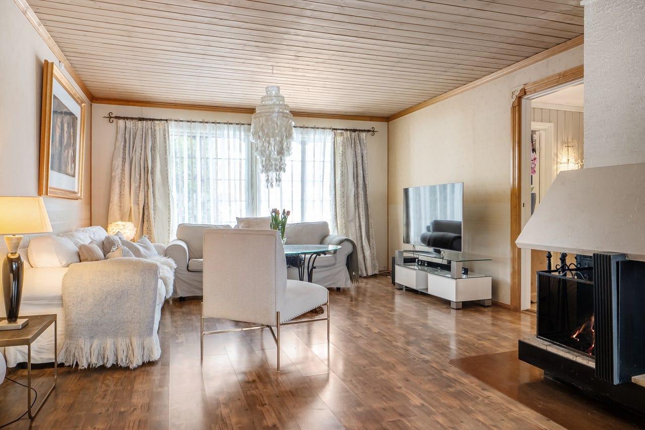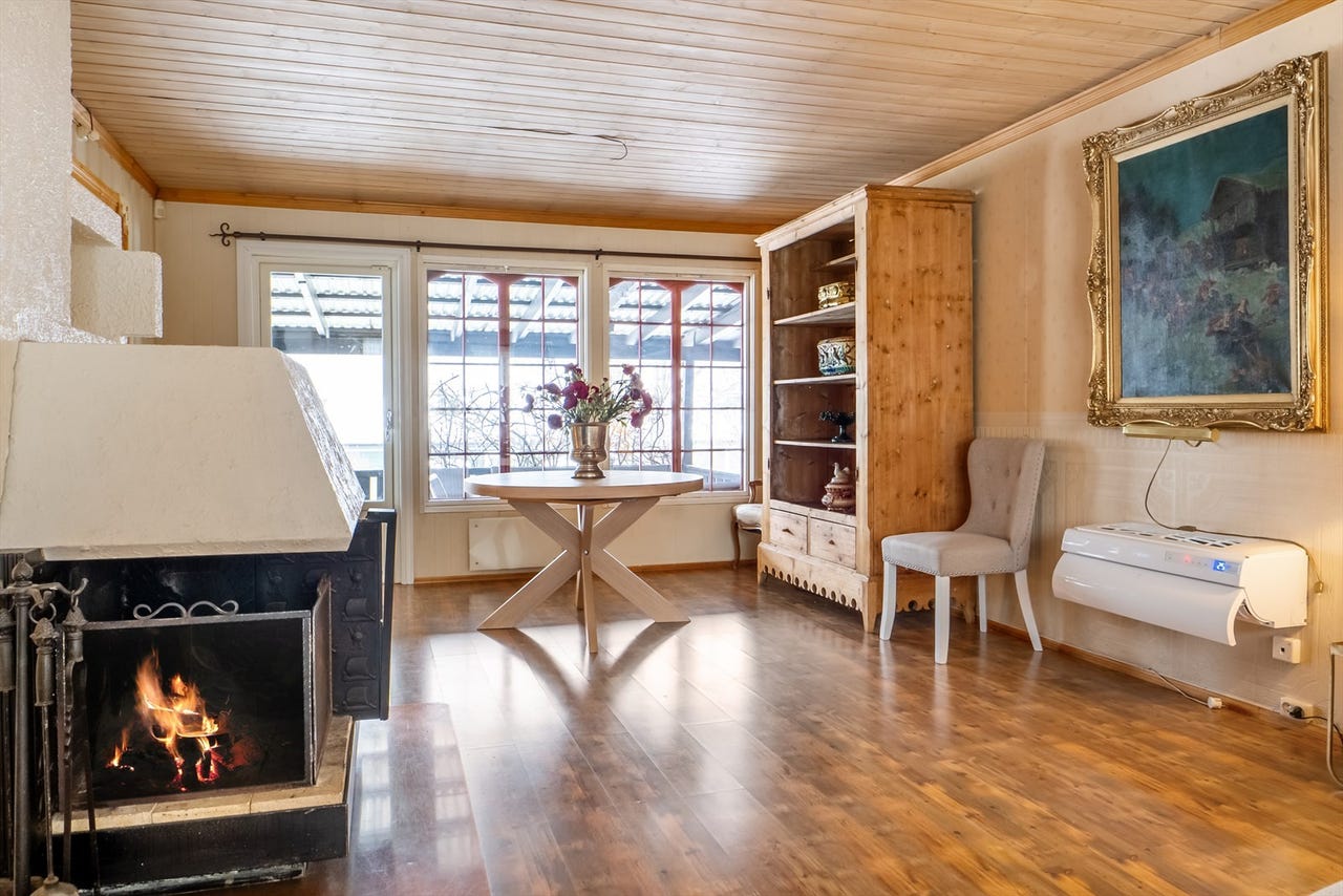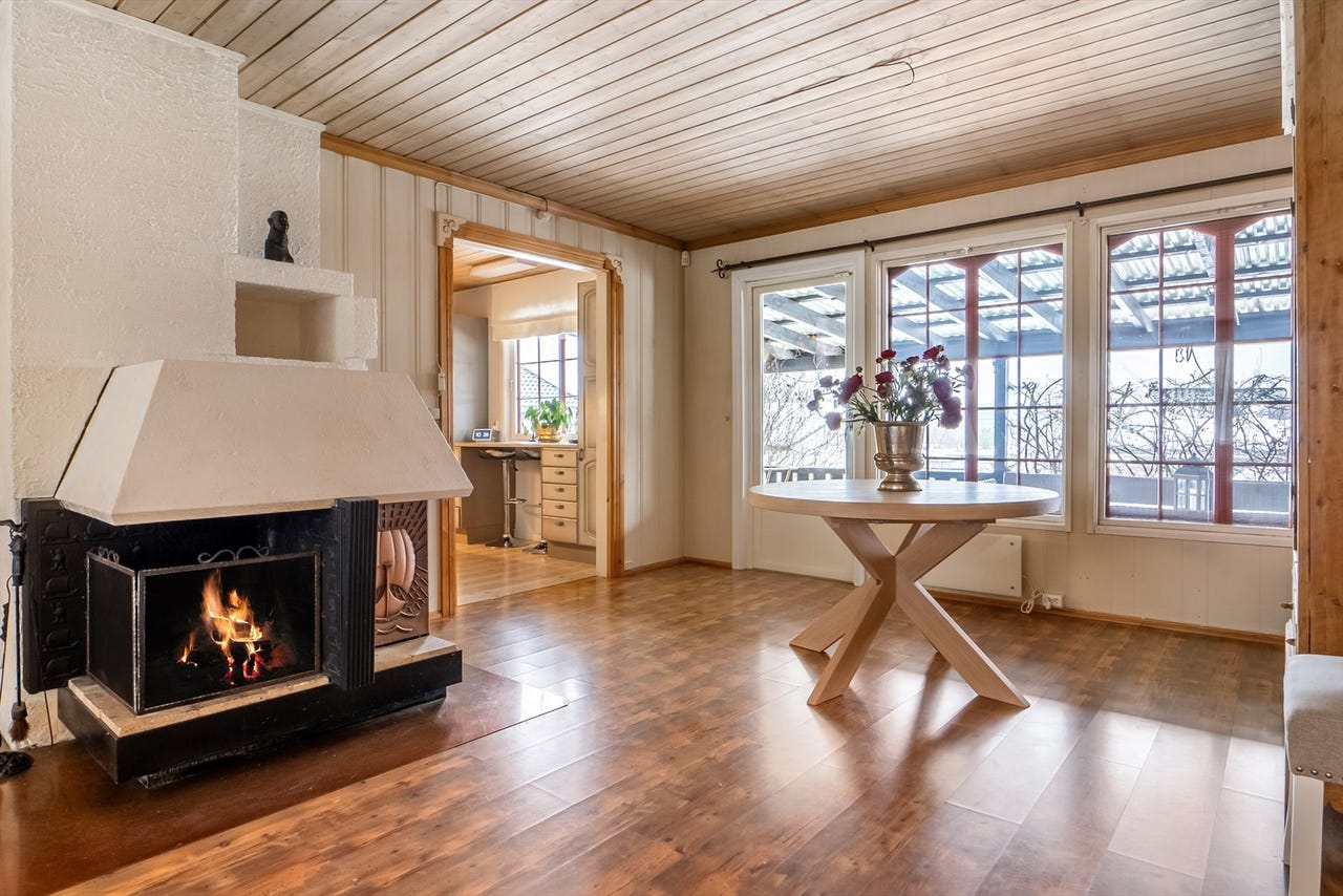 Romslig, lys stue med god plass til sofagruppe og tv-bord. Åpen løsning med spisestue. Oppvarming med blant annet vedfyring og varmepumpe. Adkomst til overbygget terrasse. Dels åpen løsning fra spisestue mot kjøkkenet.