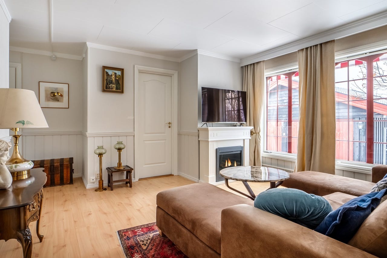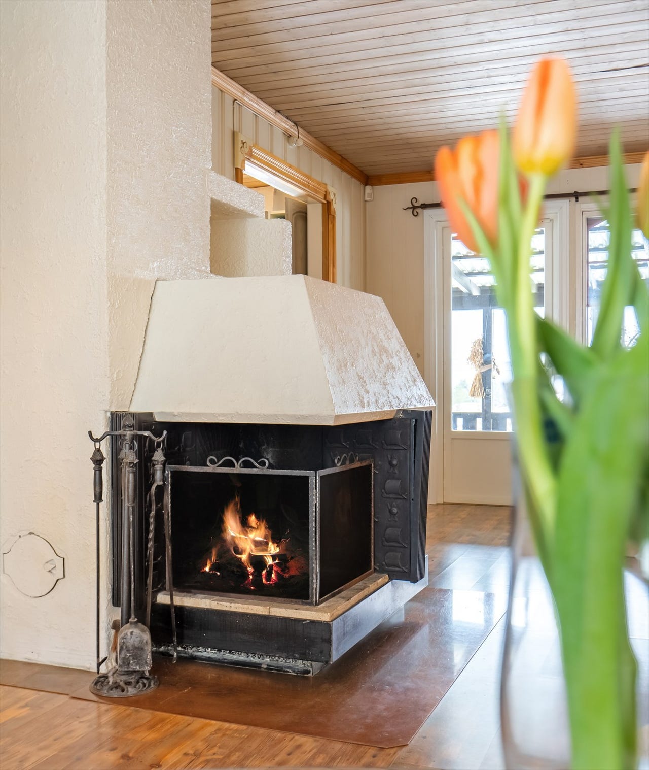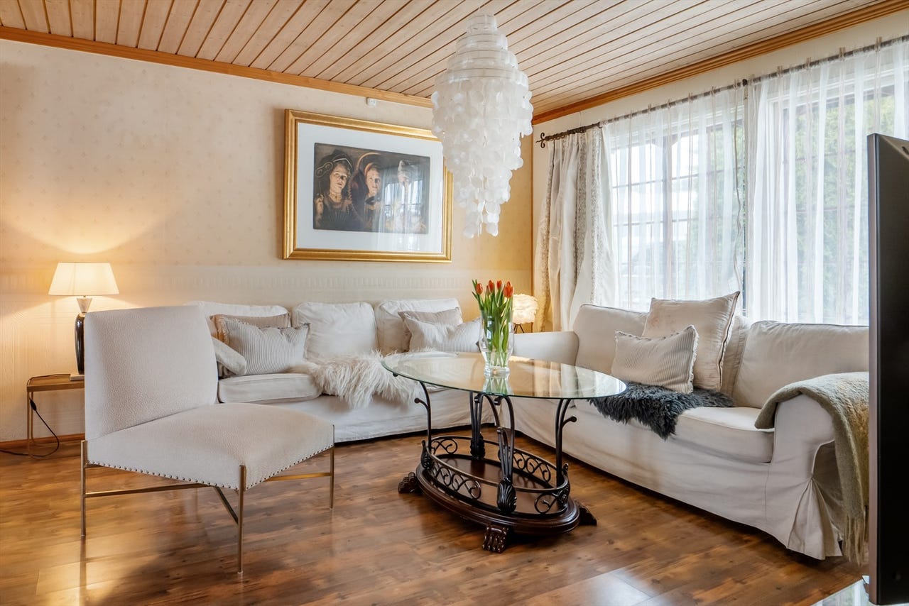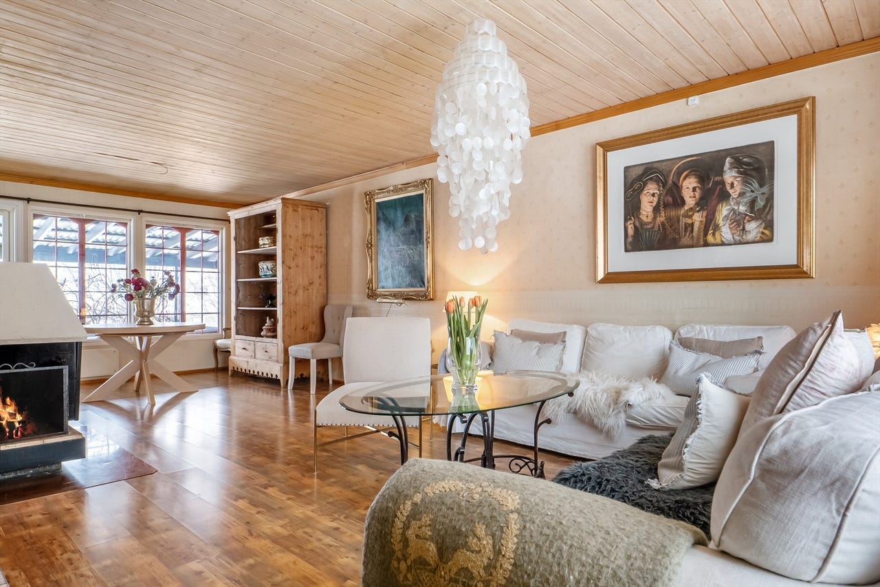 Romslig, lys stue med god plass til sofagruppe og tv-bord. Åpen løsning med spisestue. Oppvarming med blant annet vedfyring og varmepumpe. Adkomst til overbygget terrasse. Dels åpen løsning fra spisestue mot kjøkkenet.