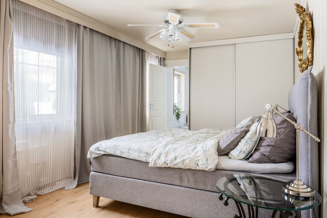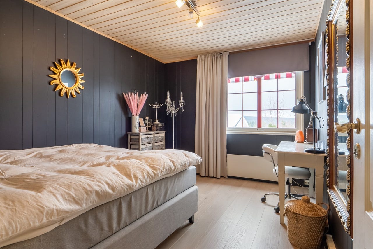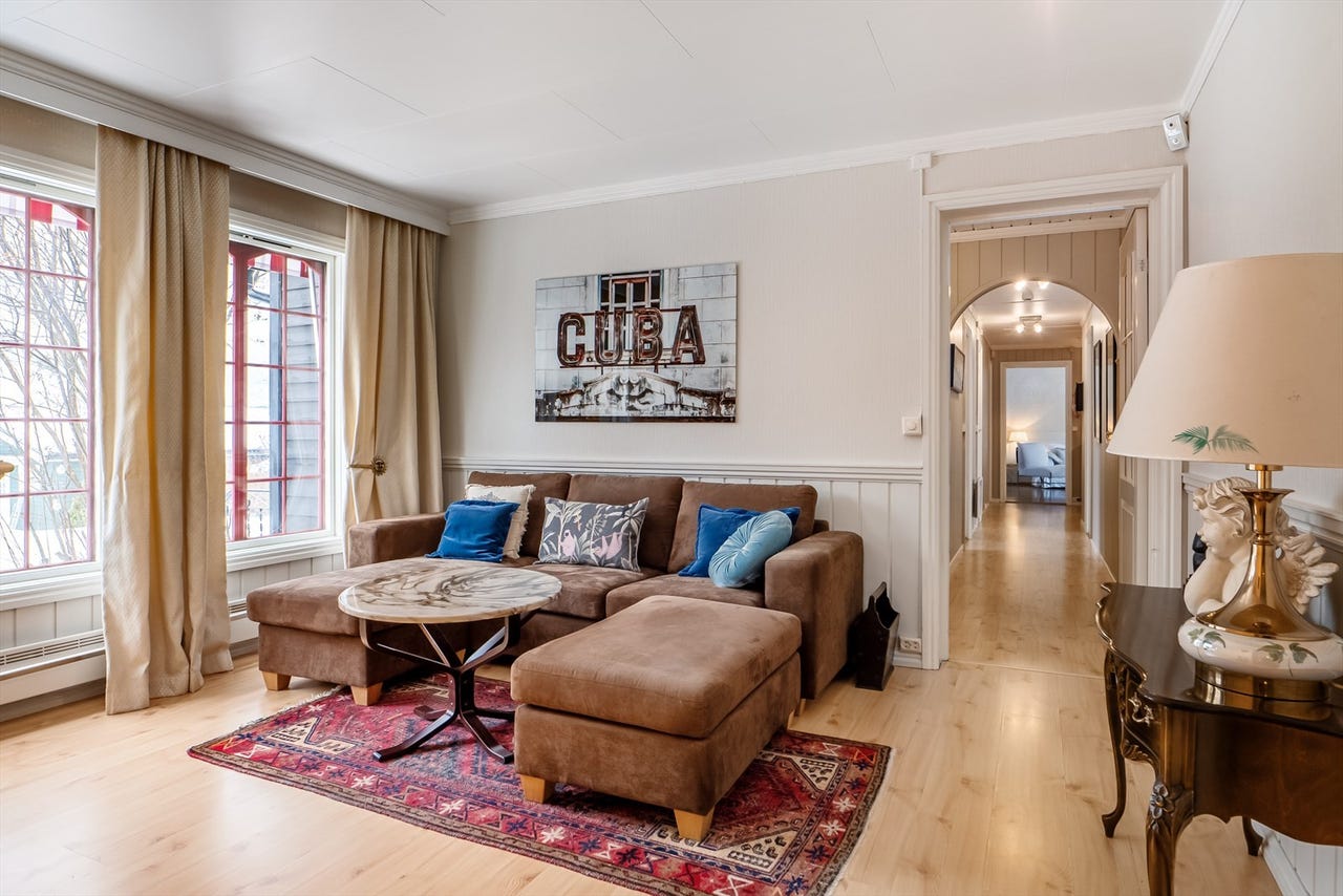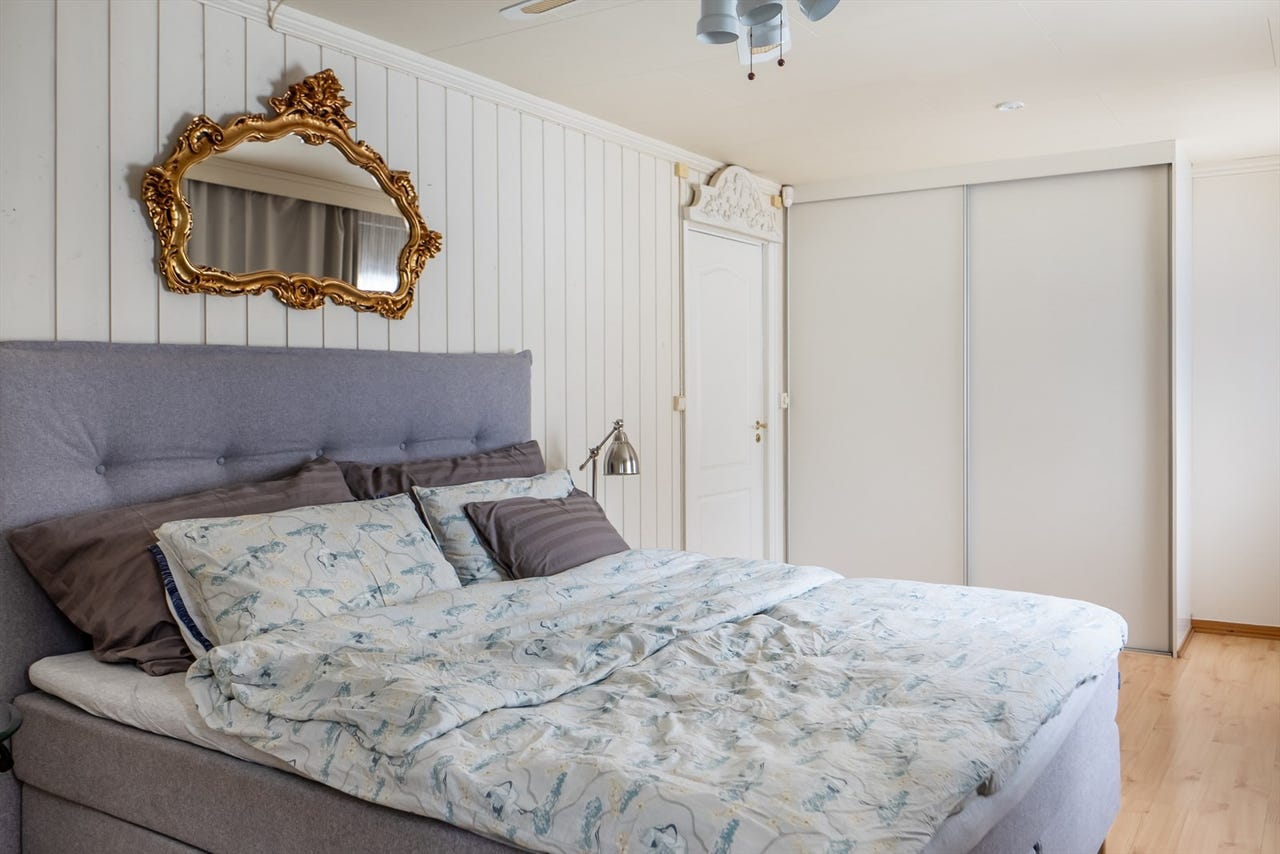 Boligen har tre romslige og fine soverom. Lyst hovedsoverommet har godt plass til dobbeltseng. Integrerte skyvedørsgarderober. Direkte adkomst til badet. Det andre soverommet er malt i noe mørkere fargetoner og har god plass til soveromsmøblement og evt. kontormøblement dersom en ønsker det. Det tredje soverommet er i dag innredet og benyttet som stue, og har også direkte adkomst til badet.