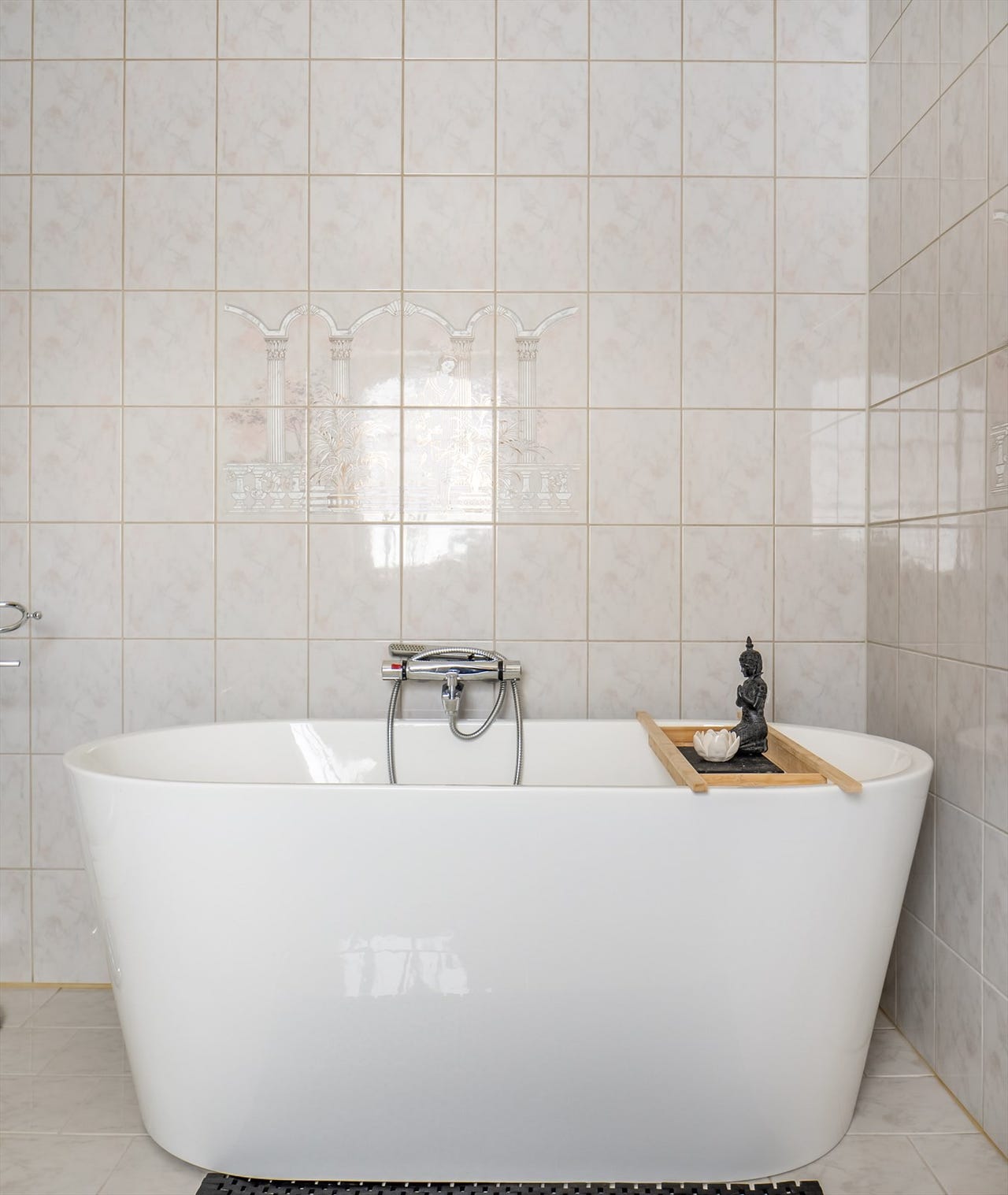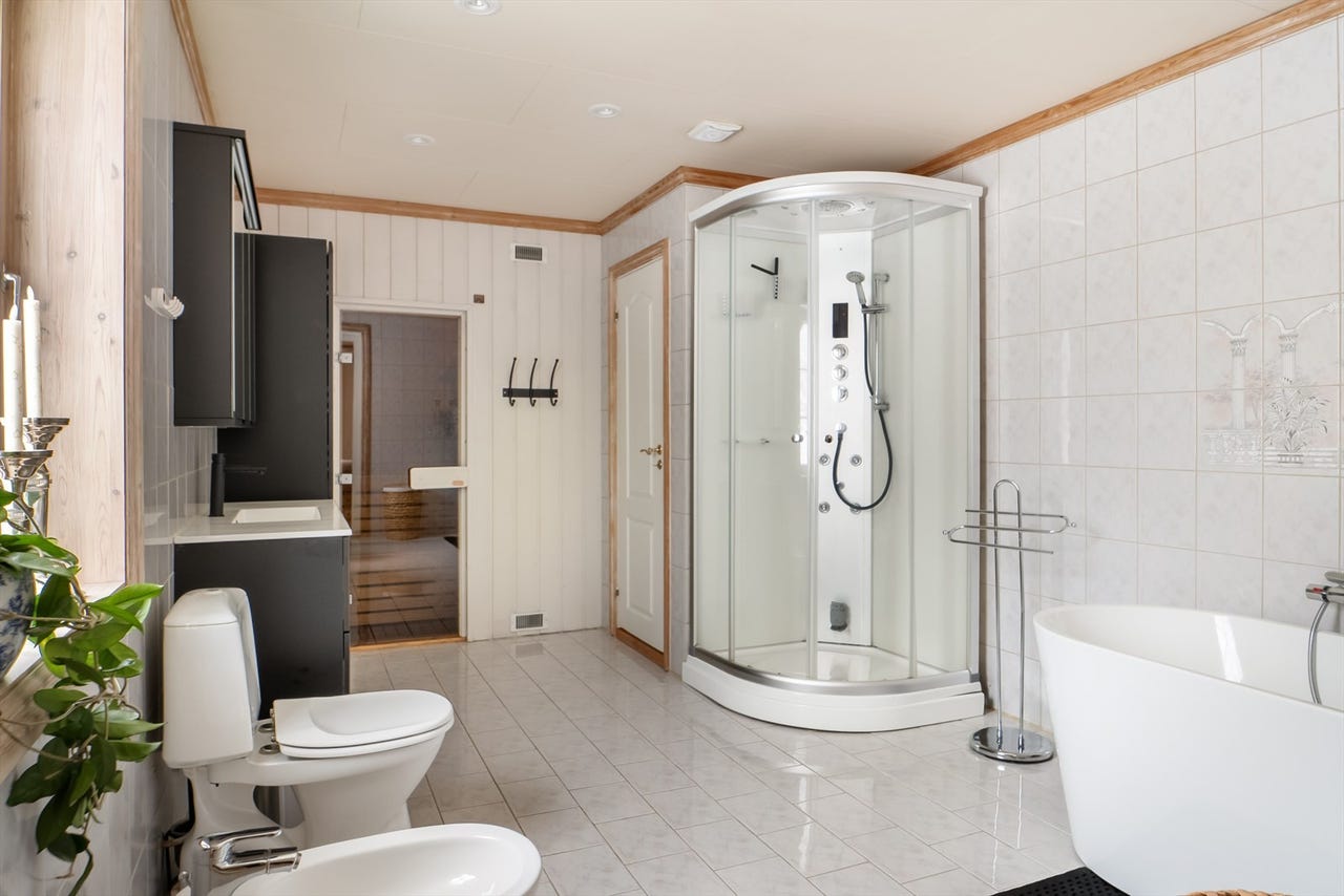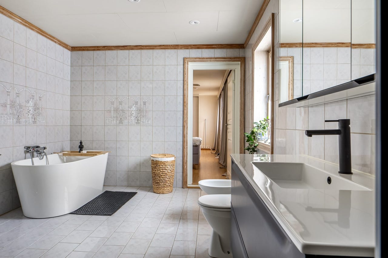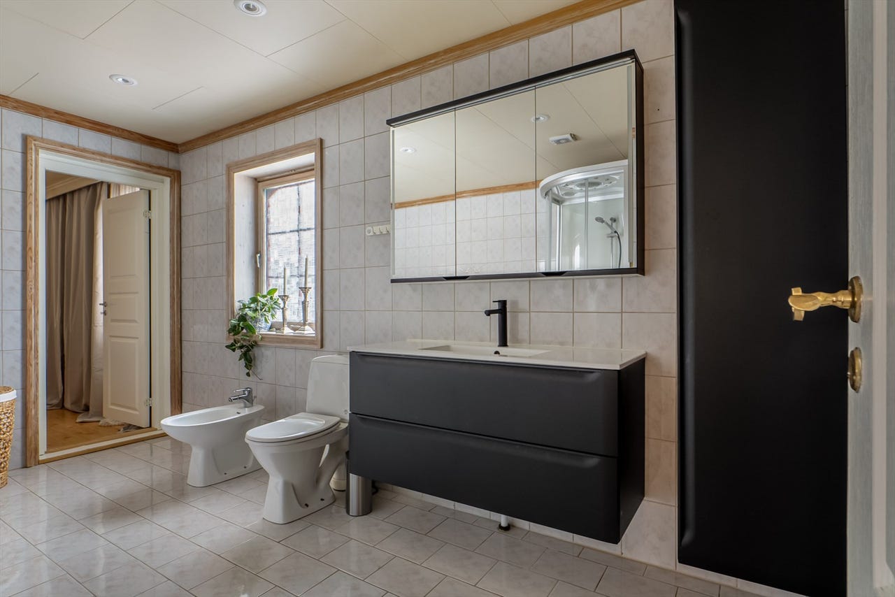 Bad med flislagt gulv og vegger fra ca. 1995. Badet er innredet med toalett, bide, servant på innredning, badekar og dusjkabinett. Opplyst at baderomsinnredningen er fra 2023. Mekanisk avtrekk med avkast ført direkte over tak, med tilluft via spalte under dørblad.