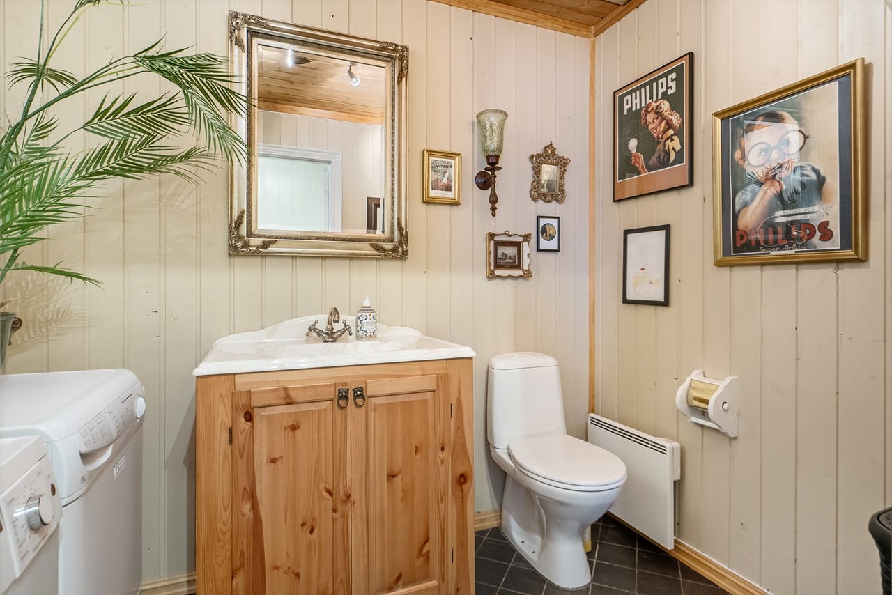 Toalettrom med flislagt gulv og vegger med behandlet panel. Oppvarming med panelovn. Rommet er innredet med toalett og servant på innredning. Opplegg for vaskemaskin og tørketrommel. Naturlig avtrekk via himlingsventil, med tilluft via spalte under dørblad.