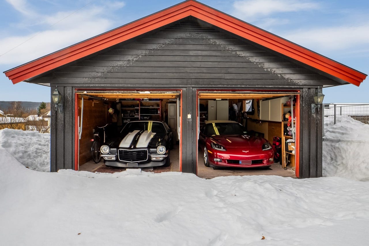 Frittstående dobbelgarasje: Oppført i 1990. Gulv med støpt såle på mark. Yttervegger i bindingsverk med utvendig liggende kledningsbord. Fullisolert i himling og yttervegger. Saltakkonstruksjon. Ukjent vedrørende tekking. Renner og nedløp i metall. Vinduer med isolerglass fra byggeåret. Montert to leddporter med automatisk styring. Innlagt strøm.