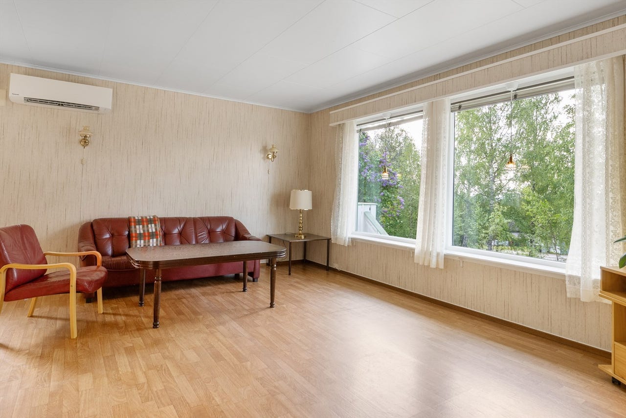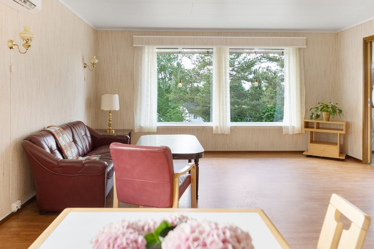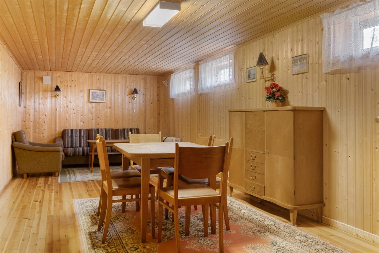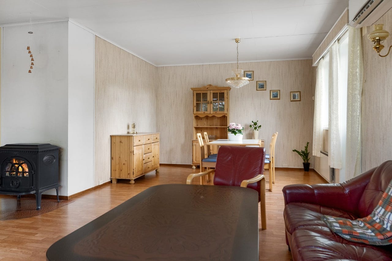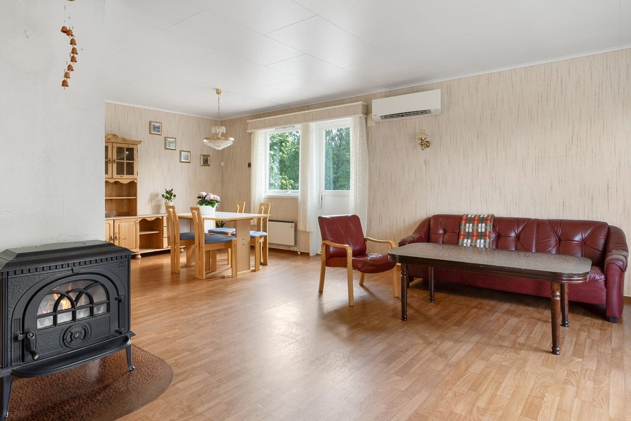 Stue i 1.etasje med god plass til sofagruppe og spisebord. Oppvarming med både vedfyring og varmepumpe.