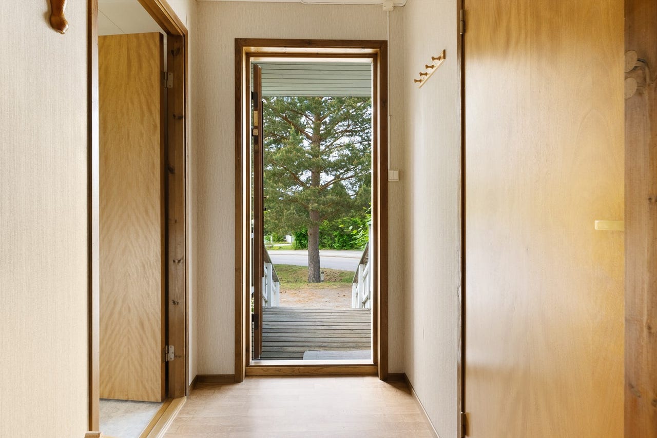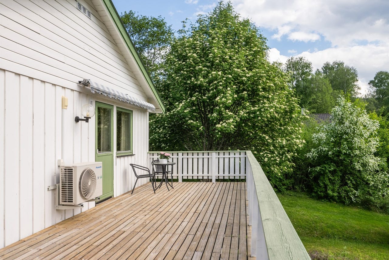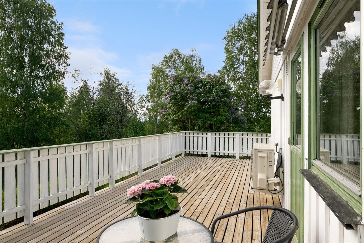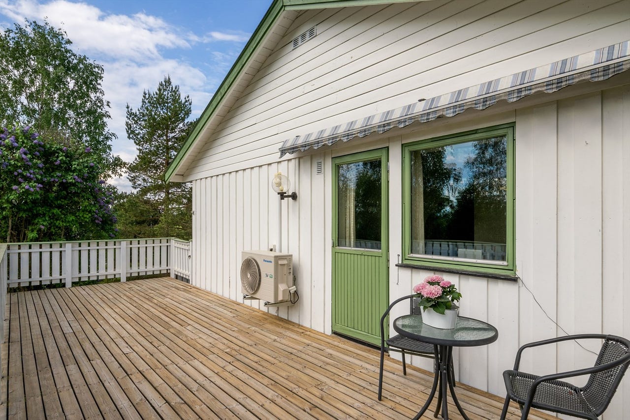 Veranda ved entreen som er punktfundamentert med pilarer av tre ned i bakken og bygget i trekonstruksjoner. Ukjent med frostsikring.