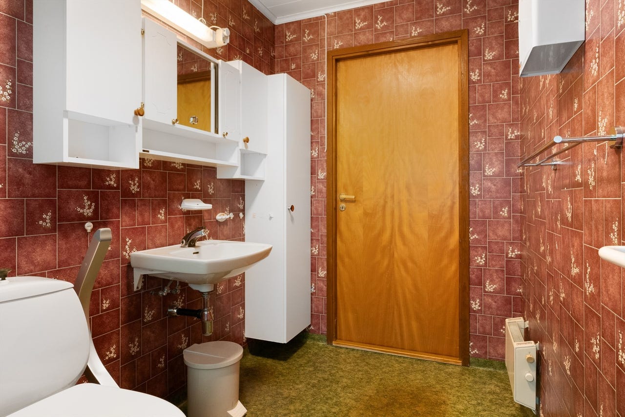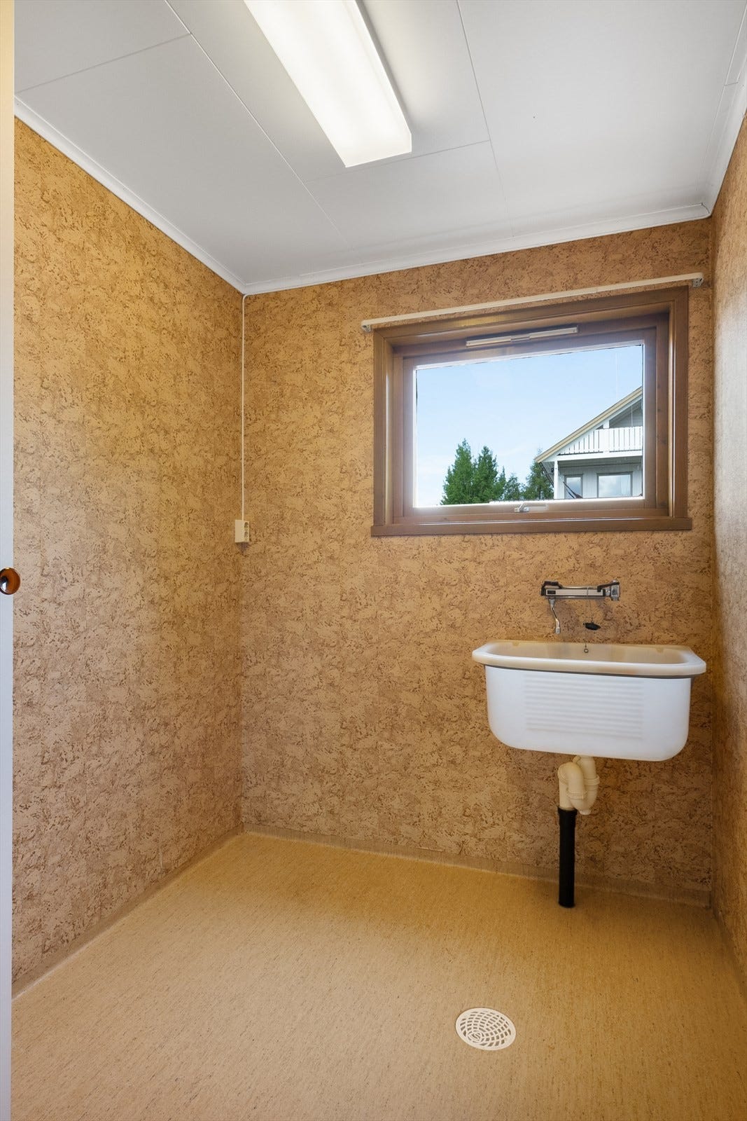 Vaskerom fra byggeåret med tapet på vegger og gulvbelegg på gulv med oppbrett på vegger. Rommet er innredet med utslagsvask og vannkran montert på vegg. Mekanisk avtrekk fra sentral vifte, med tilluft via dør. Opplegg for vaskemaskin.