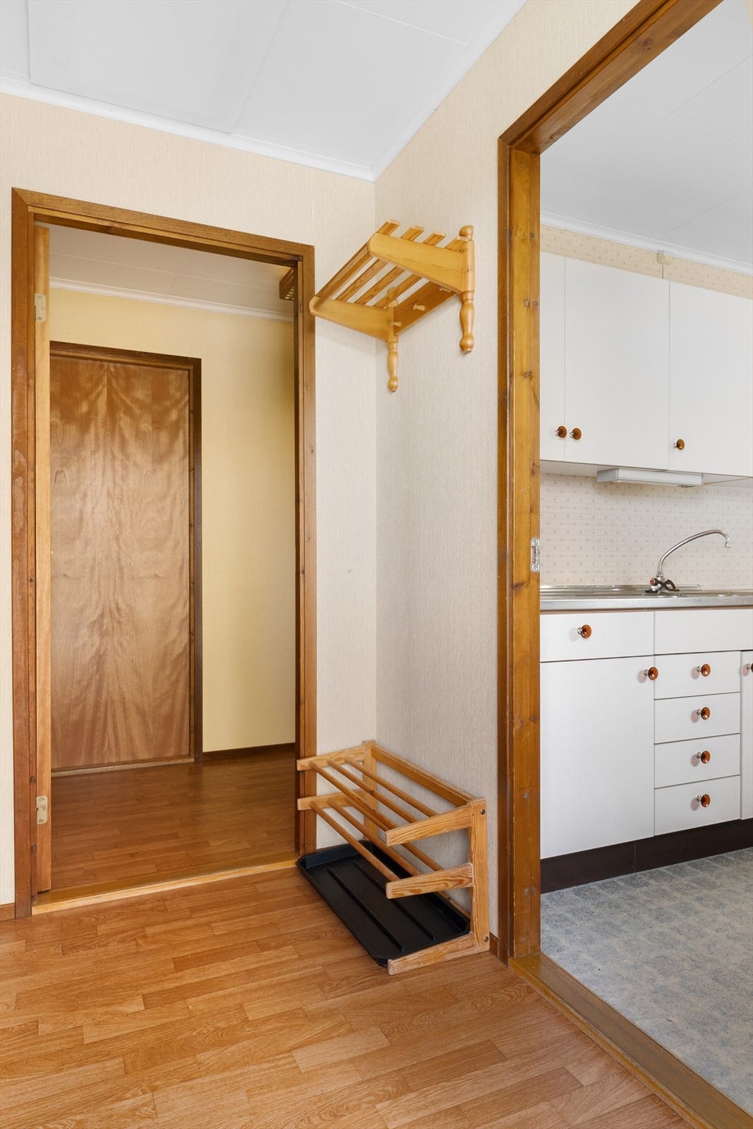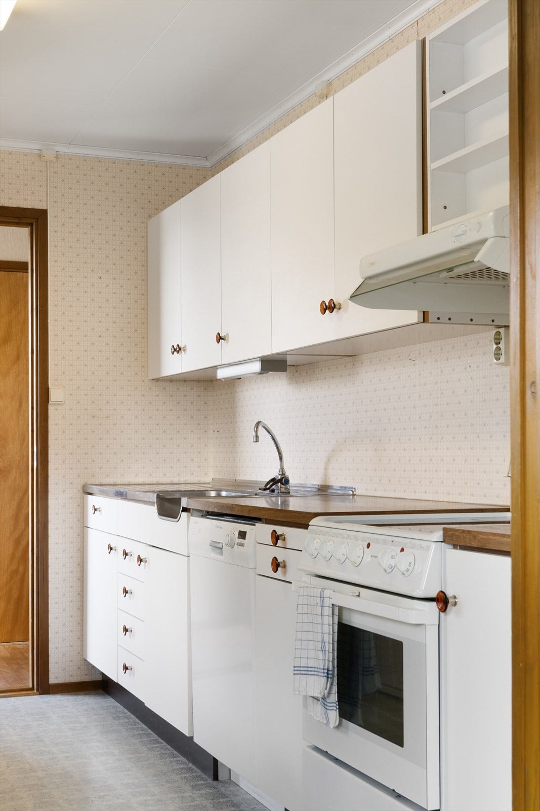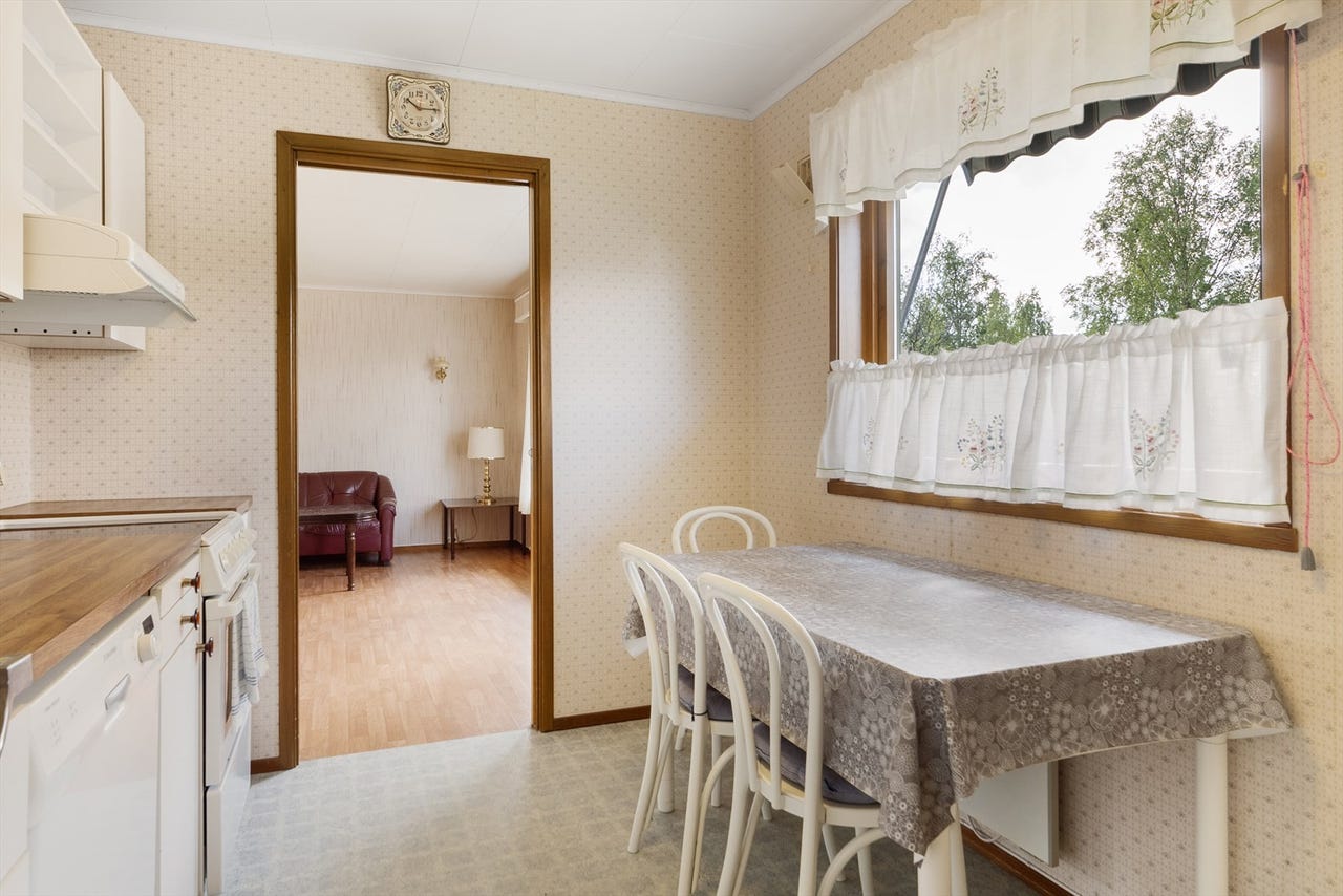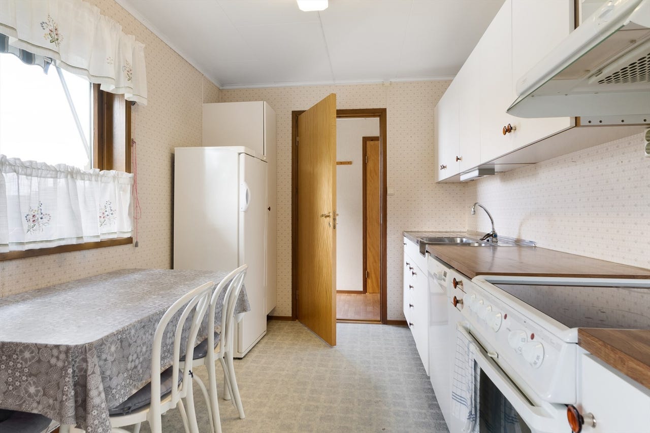 Kjøkkenet har plass til spisebord. Innredning med slette fronter og laminerte benkeplater. Åpen løsning for hvitevarer. Kjøkkenventilator med avtrekk ut.