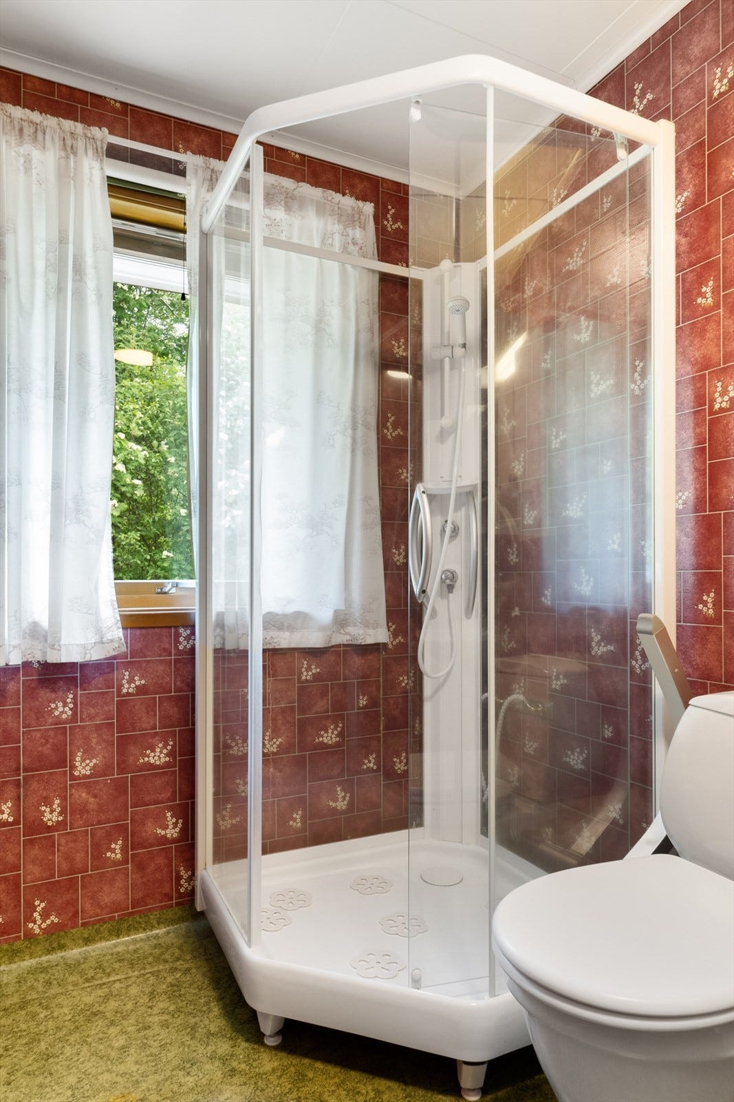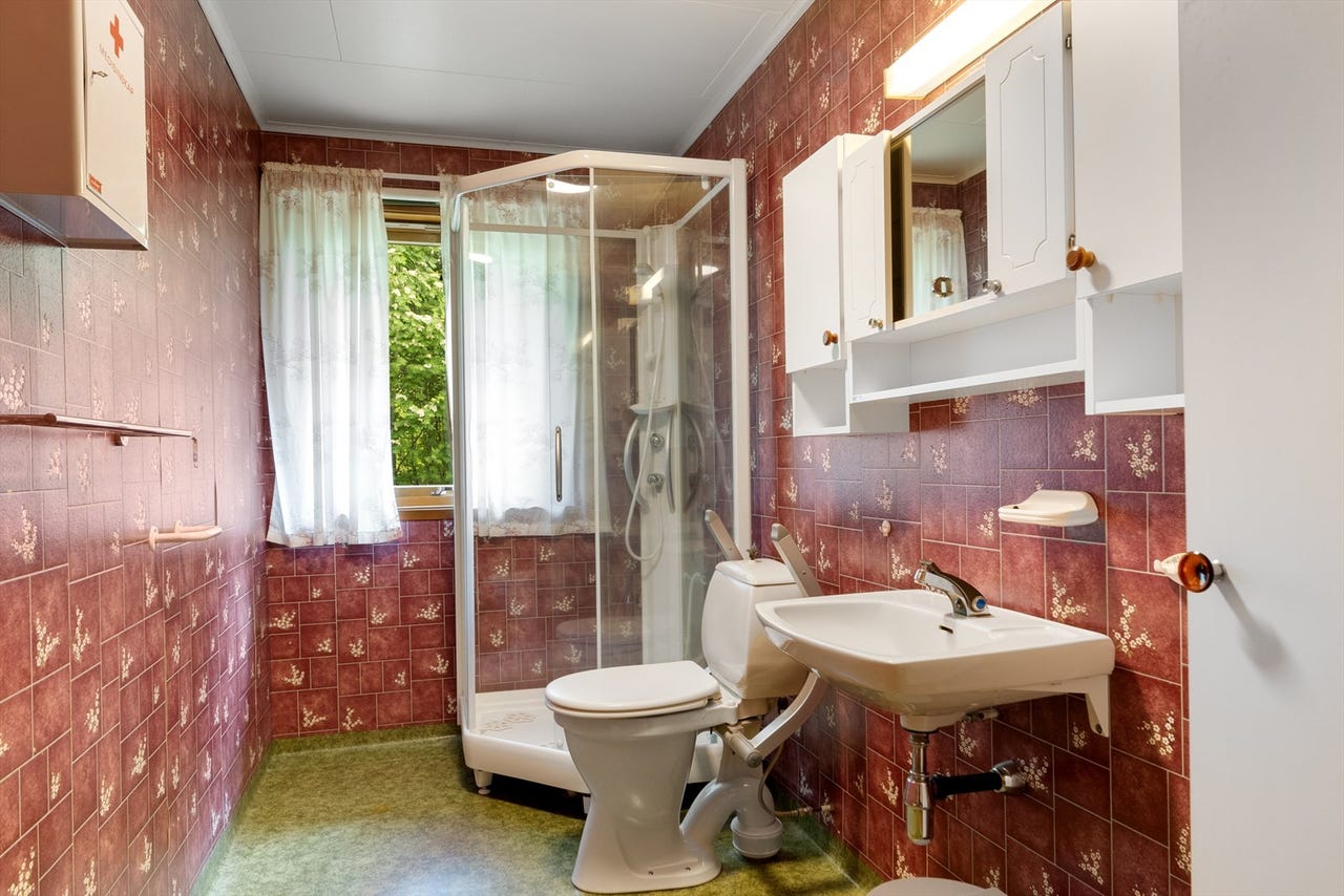 Bad fra byggeår med tapet på vegger og gulvbelegg på gulv med oppbrett på vegger. Badet er innredet med dusjkabinett, servant, toalett og veggskap. Mekanisk avtrekk fra sentral vifte, med tilluft via spalte under dør.