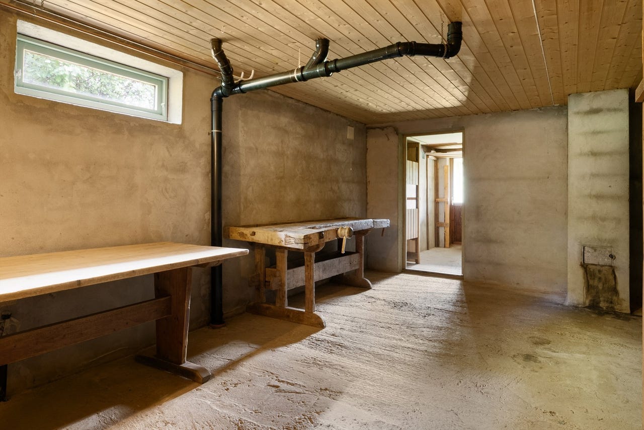 Rom under terreng, da det er noen steder mindre tegn til fuktpåkjenninger i vegghjørner og noen steder nede ved gulv, det er noen riss og sprekker i overflater og bruksmerker i himling i kjellerinngang, det er noen mindre tegn til fuktpåkjenninger i himling ved gjennomføringer til bad, det oppleves stedvis svikt og knirk under gange i kjellerstue, det er stedvis glippe mellom gulvlist og gulvbord og kraftig svikt ved tråkk inne ved vegg mot sør. Dette indikerer at det kan være en underliggende skade i gulv. Det ble ikke registrert skadelig fuktinnhold i vegg på kontrollpunktet.