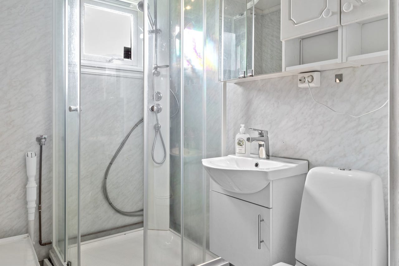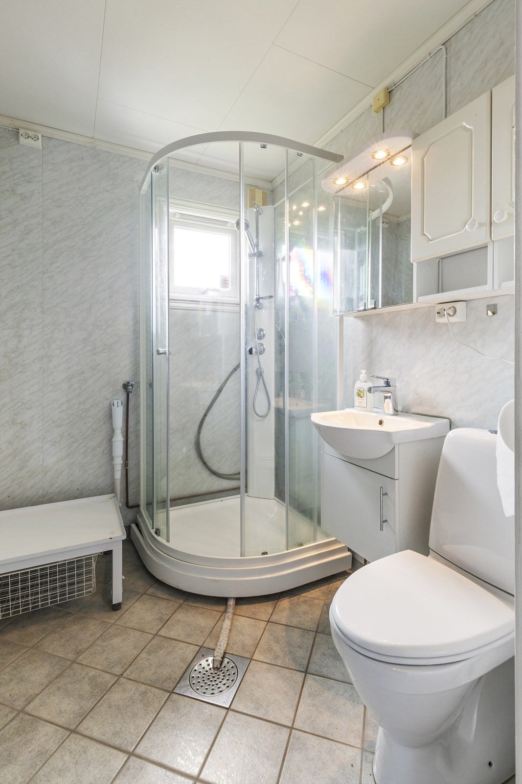 Eldre bad med baderomsinnredning og nyere gulvmontert toalett fra 2022, servant i innredning, dusjkabinett og opplegg for vaskemaskin, avløp fra dusj ført via gulv direkte til sluk. Badet har fliser på gulv, vegger med sokkelflis og laminerte plater. Oppvarming med elektrisk gulvvarme og ventilasjon med mekanisk avtrekk ført via himlingsventil og tilluft via spalte under dør. Det er foretatt hulltaking med 73 mm. hulbor fra tilstøtende soverom og foretatt fuktsøk og visuelle observasjoner på overflater på badet, uten å registrere symptomer på avvik.