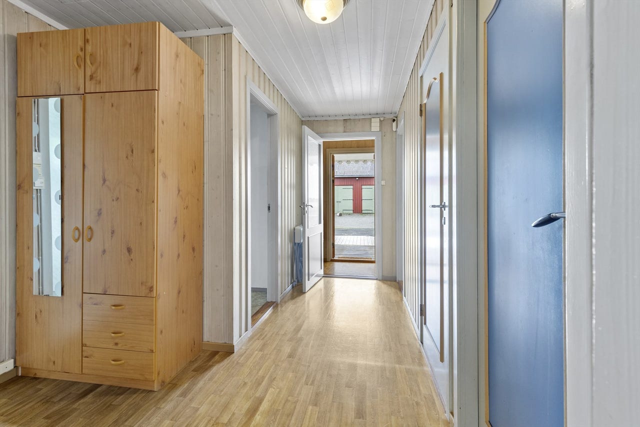 Gangen er romslig med dobbelt garderobeskap og har tilkomst il soverom 1 og 2, badet, kjøkkenet, trapperom til kjeller og innvendig bod. Det er belegg på gulv, panel på vegg og malt panel i himling.