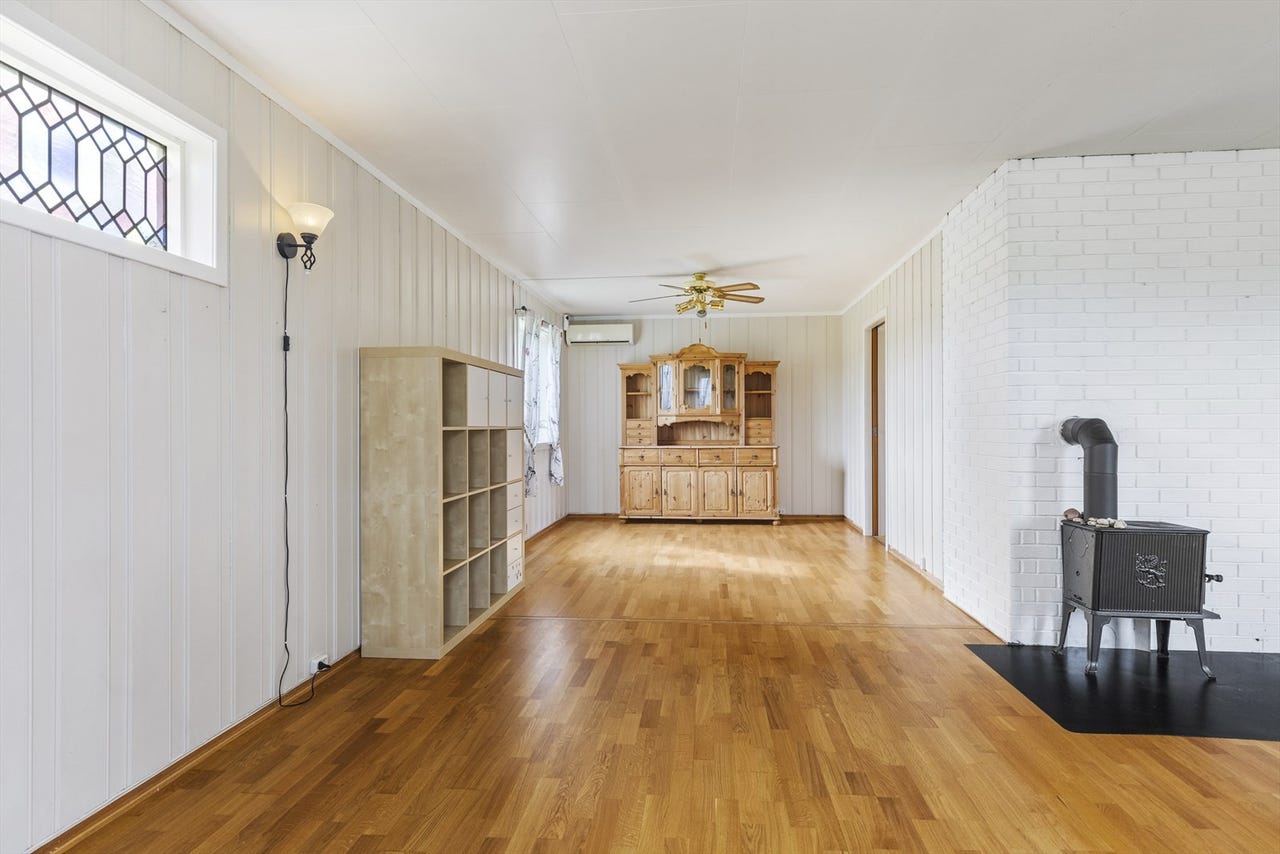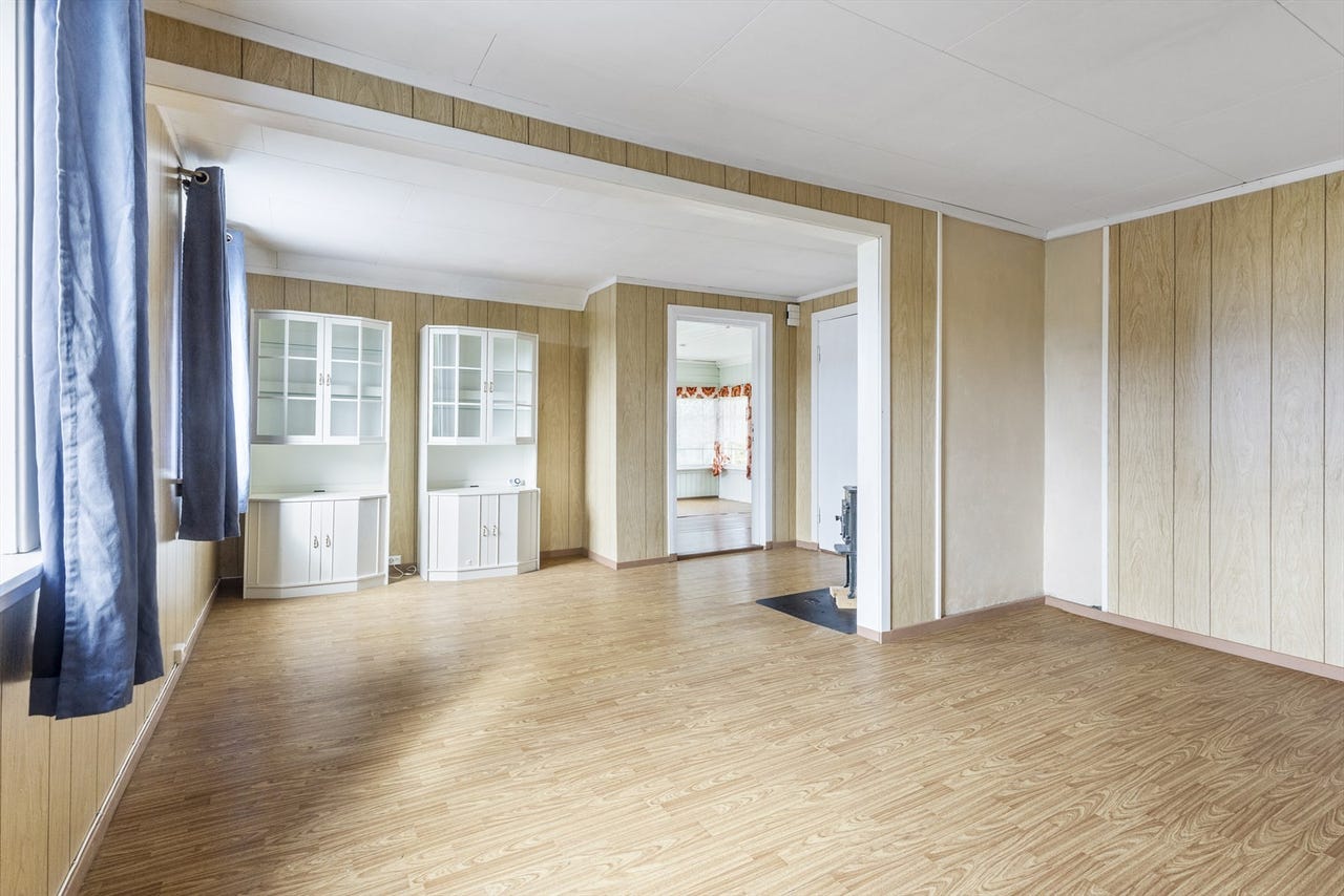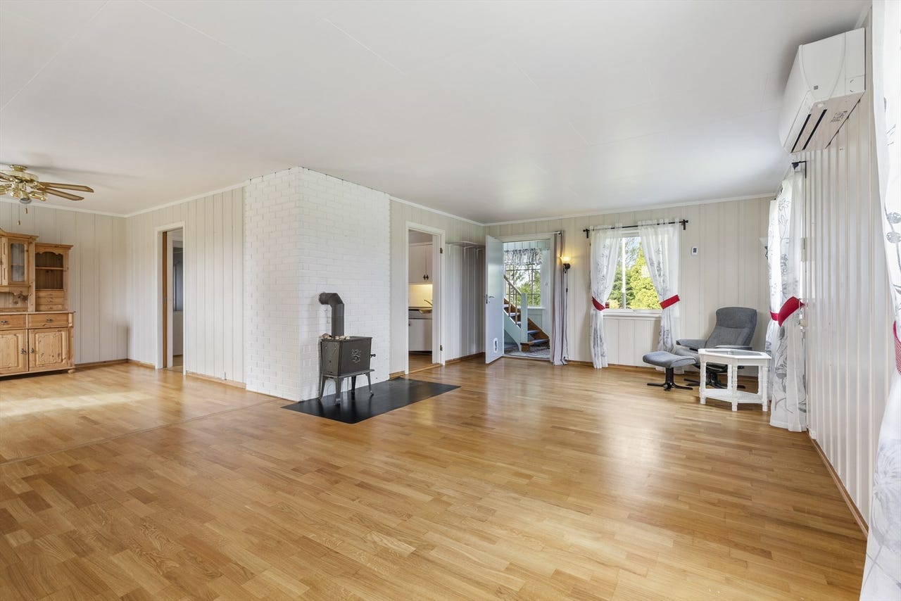 Stuen er lys og romslig med adkomst fra kjøkkenet og tilkomst til trappehus. Stuen sin spisestuedel er i en åpen løsning og har i tillegg også adkomst fra kjøkkenet. Rommet er i en vinkel format med flere vinduer, gode lysforhold med fint utsyn. Det er montert luft-til-luft varmepumpe oppe på vegg og en nyere Jøtul peisovn i hjørnet mot kjøkkenveggen. Det er et vindu oppe på veggen med blyglass. Overflater består av parkett på gulv, malt panel på vegg og plater i himling.