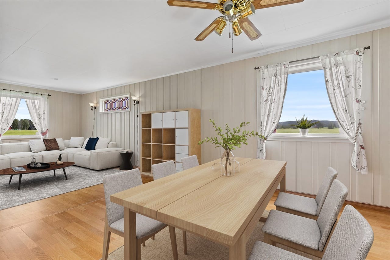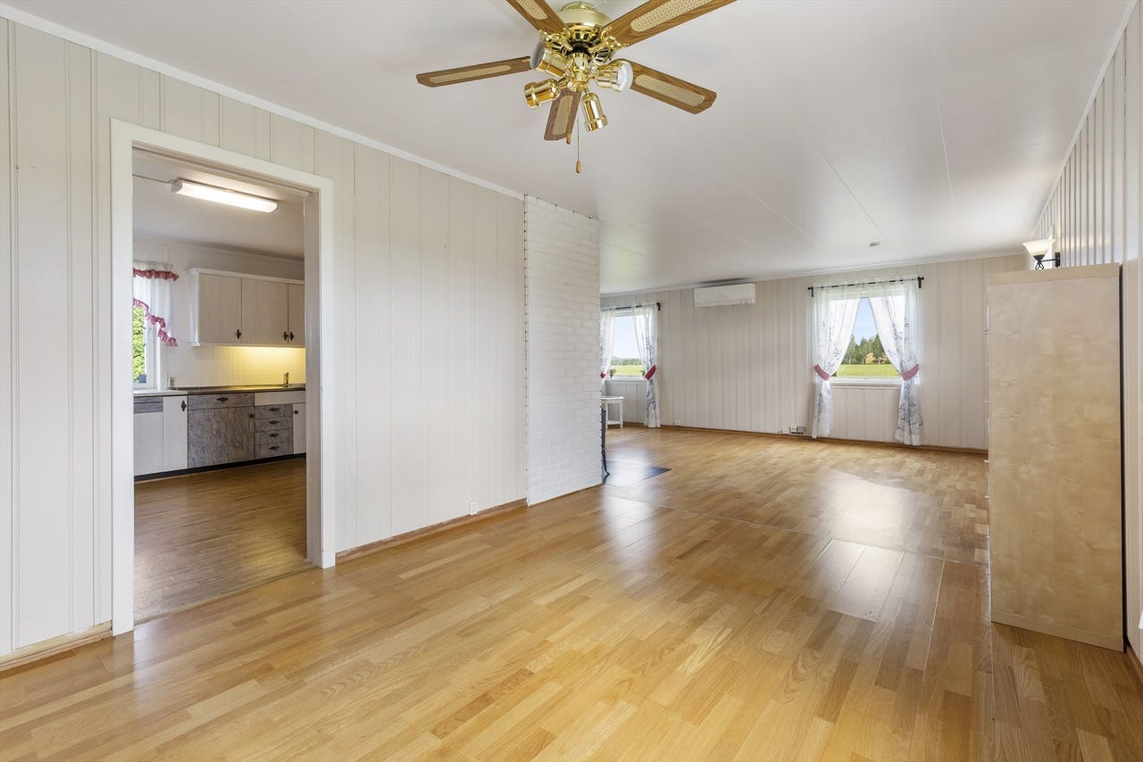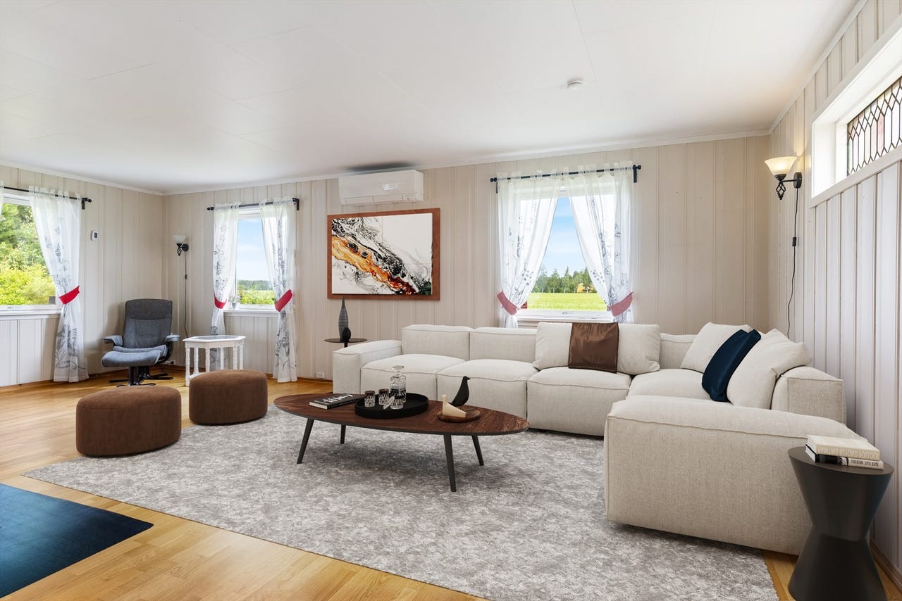 Stuen er lys og romslig med adkomst fra kjøkkenet og tilkomst til trappehus. Stuen sin spisestuedel er i en åpen løsning og har i tillegg også adkomst fra kjøkkenet. Rommet er i en vinkel format med flere vinduer, gode lysforhold med fint utsyn. Det er montert luft-til-luft varmepumpe oppe på vegg og en nyere Jøtul peisovn i hjørnet mot kjøkkenveggen. Det er et vindu oppe på veggen med blyglass. Overflater består av parkett på gulv, malt panel på vegg og plater i himling.