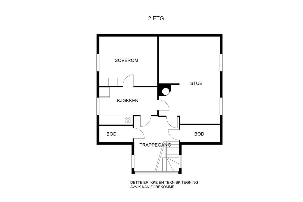 2. etasje: Trappegang, mellomgang/hybelkjøkken og 2 soverom. 2 innvendige boder.