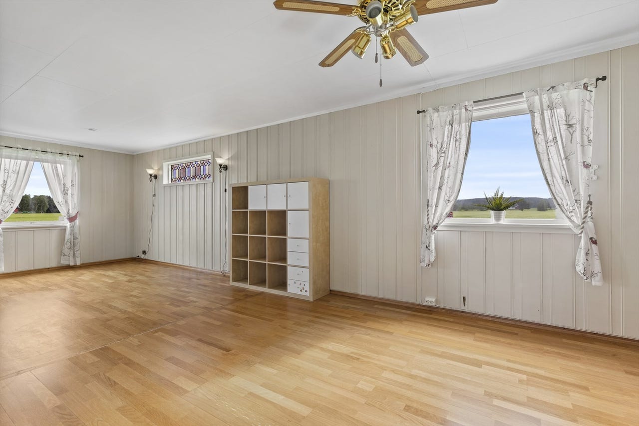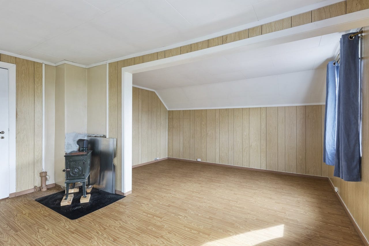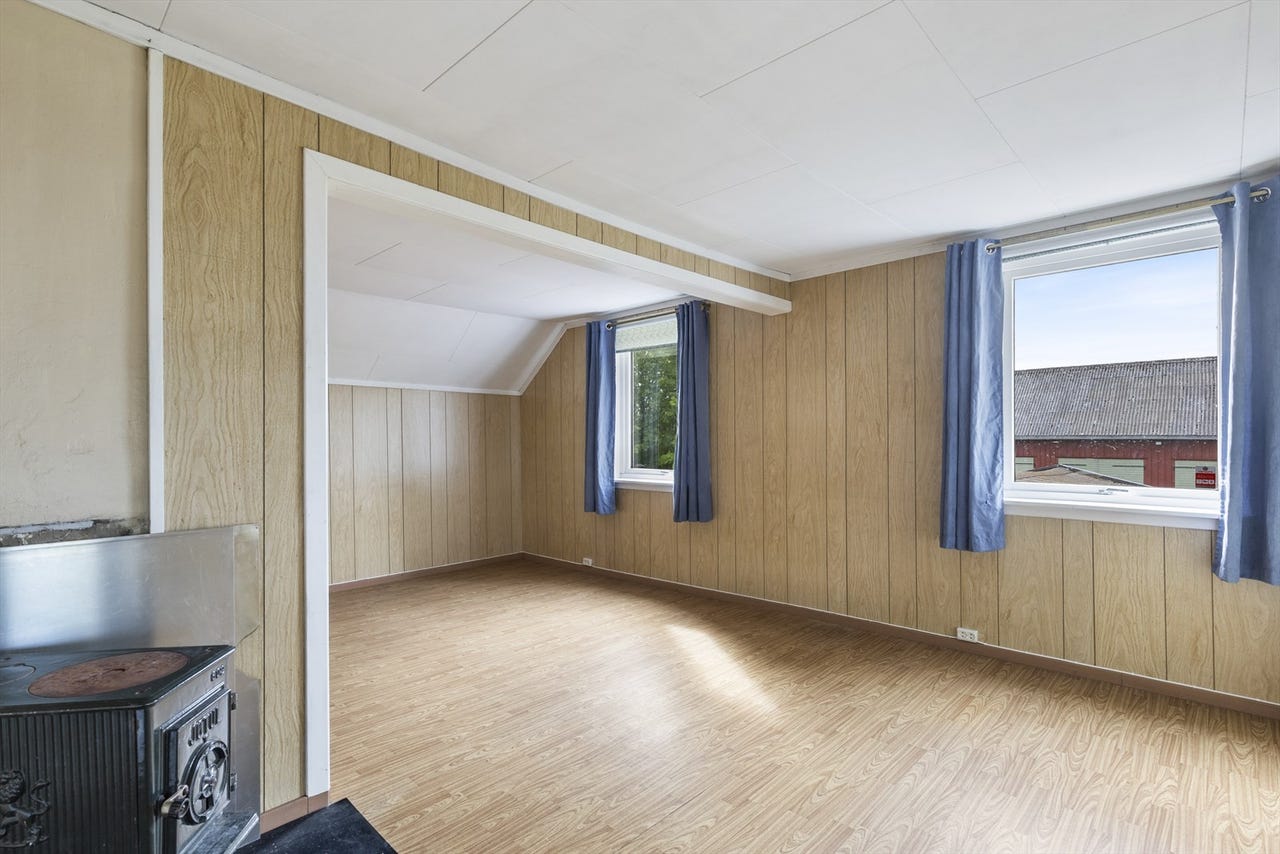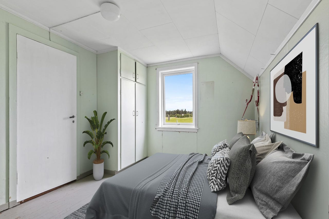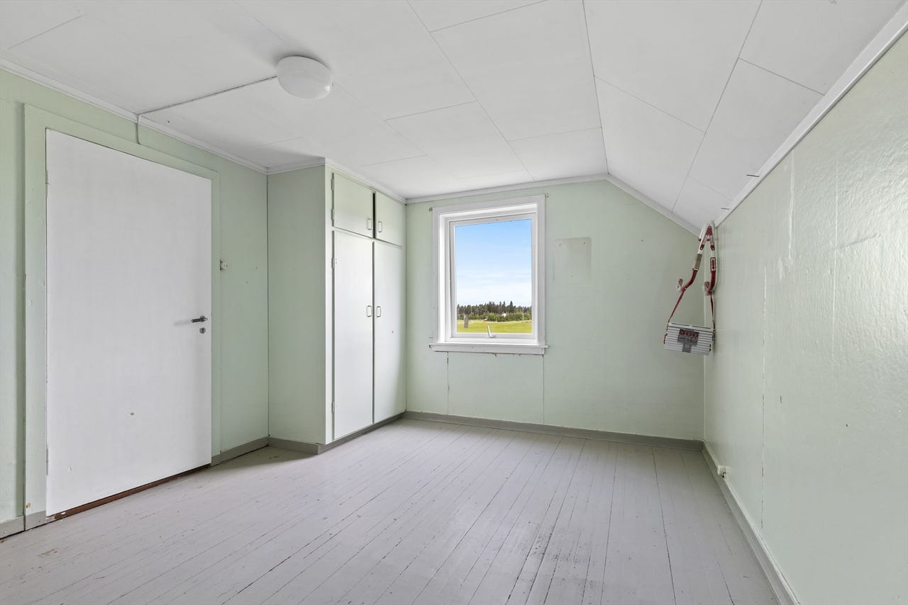 Soverom 4 i 2. etasje med adkomst fra hybelkjøkkenet har plassbygd garderobeskap, vindu med trivelig utsikt mot åker og eng. Det er malt tregulv, malt tapet på vegg og plater i himling.