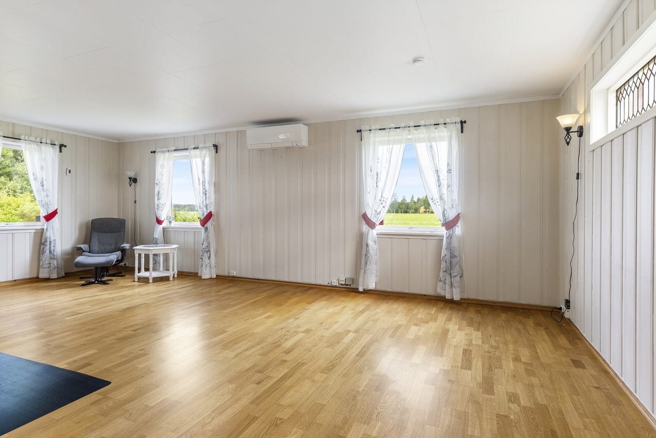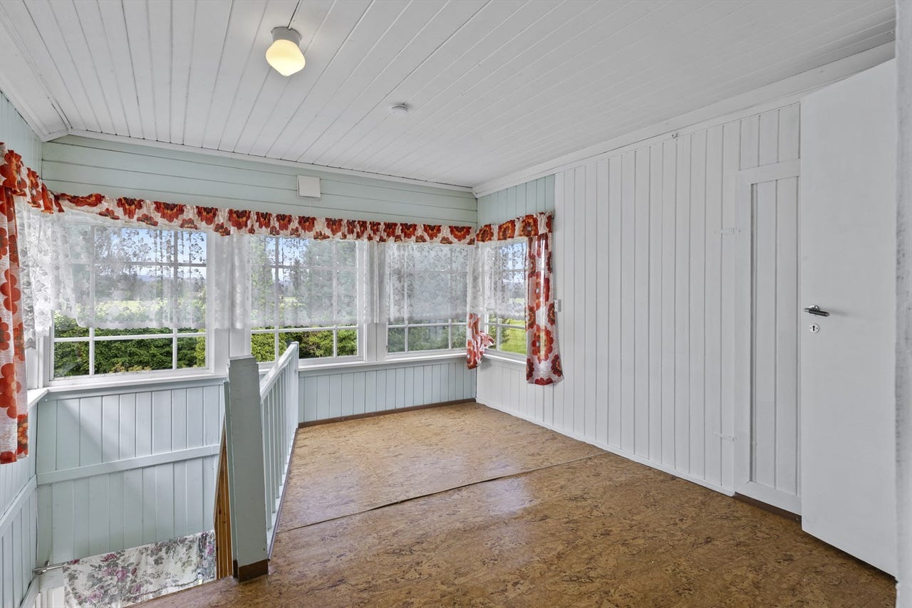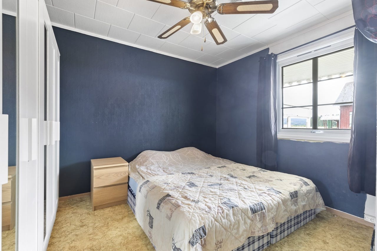 Soverom 1 er romslig, har godt med garderobeplass og er beliggende i den tilbygde delen av boligen med tilkomst fra gangen. Soverommet har installert nytt vindu (2024) med utsyn mot overbygget inngang og markterrasse. Det er belegg på gulv, malte slette vegger og takessplater i himling.