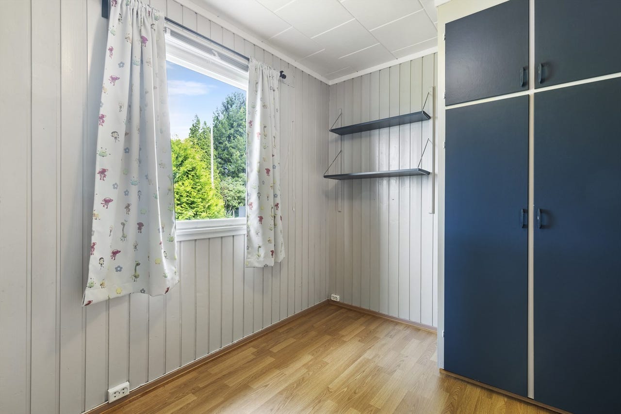 Soverom 2 har plassbygd dobbel garderobe og vindu med et trivelig utsyn mot hagen. Det er laminat på gulv, malt panel på vegg og takessplater i himling.