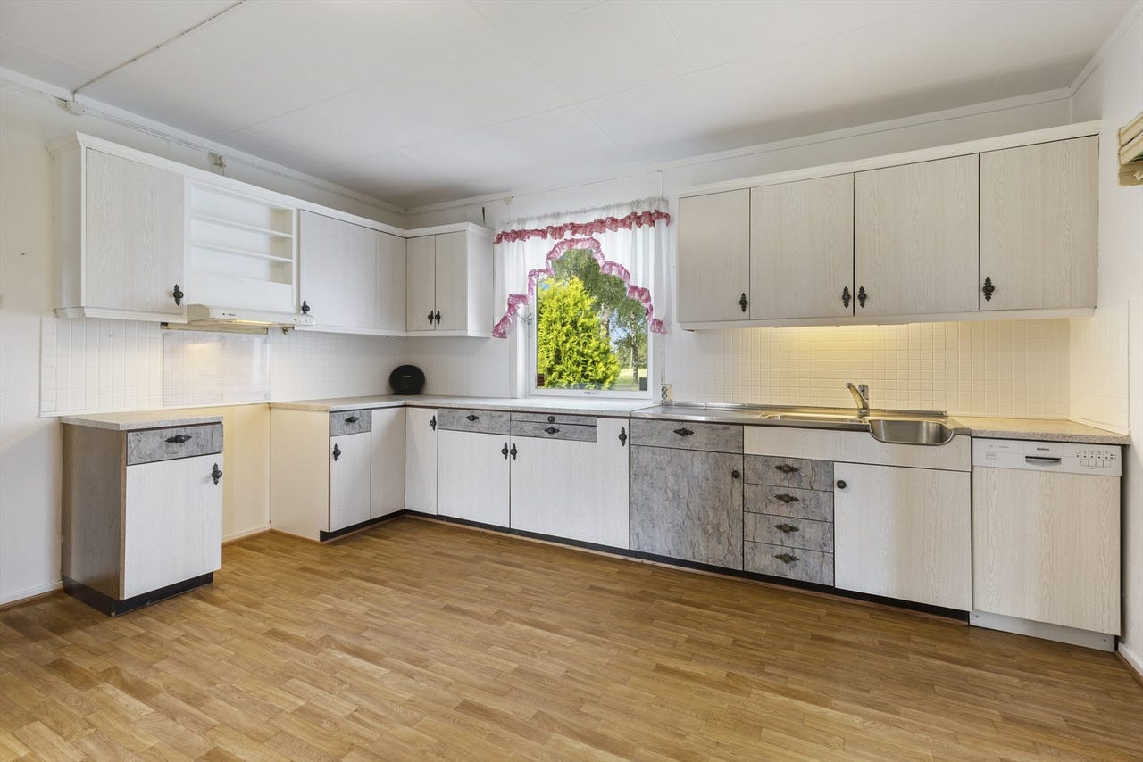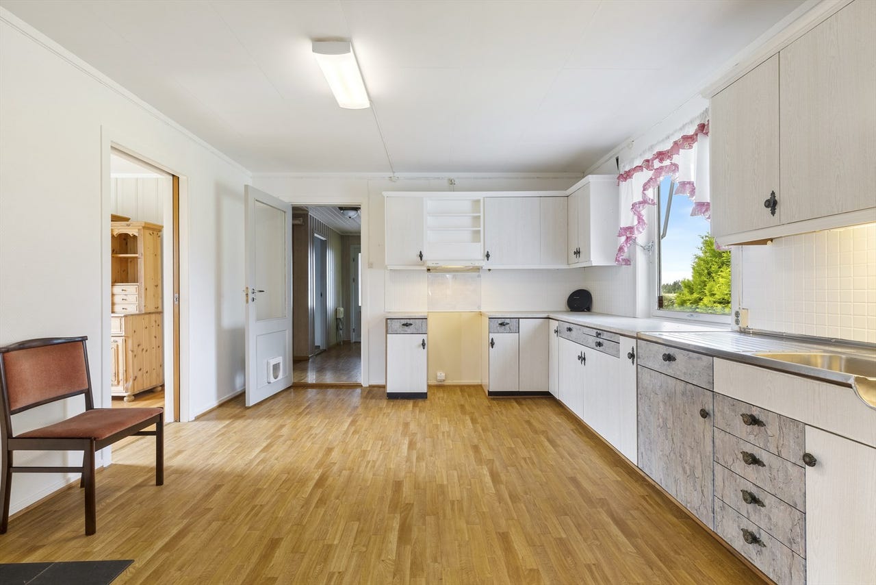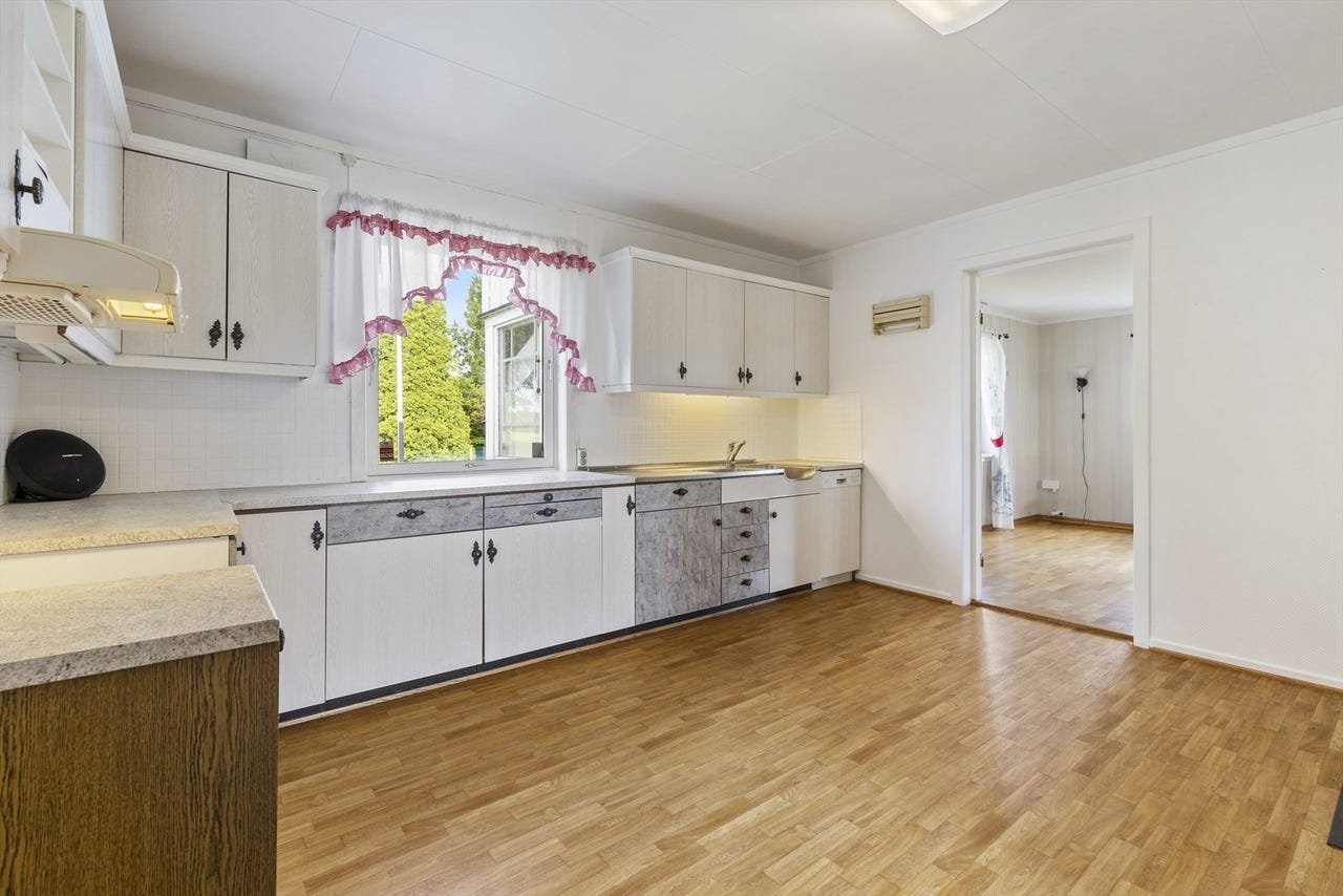 Kjøkkenet er lyst og romslig med adkomst fra gang/entre og har tilkomst til spisestuen og stuen. Eldre kjøkkeninnredning med folierte fronter og laminerte skrog. Laminerte benkeplater med oppvaskkum og utslagsvak i metal. Veggflater over kjøkkenbenker med fliser, overgang med mykfuge. Opplegg for oppvaskmaskin, plass til hvitevarer i kjøkkennisjer. Kullfiltervifte over komfyrplass. Komfyrvakt er montert, lekkasjevakt er ikke montert. Kjøkkenet er av eldre dato med foliering av fronter utført i 2023. Øvrige overflater med laminat på gulv, malt tapet på vegg og malte plater i himling.