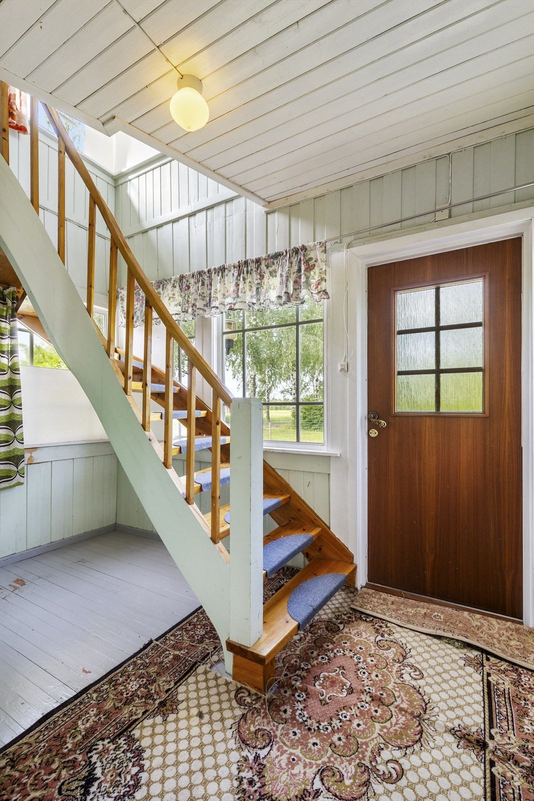Trappehuset har utgang til hagen, tilkomst fra stuen og til 2. etasje. I 2. etasje er det også inngang til to innvendige boder, hvorav sikringsskapet er plassert i den ene boden Det er vinduer på tre sider i hver etasje. Det er malt tregulv, malt panel på vegg og i himling.
