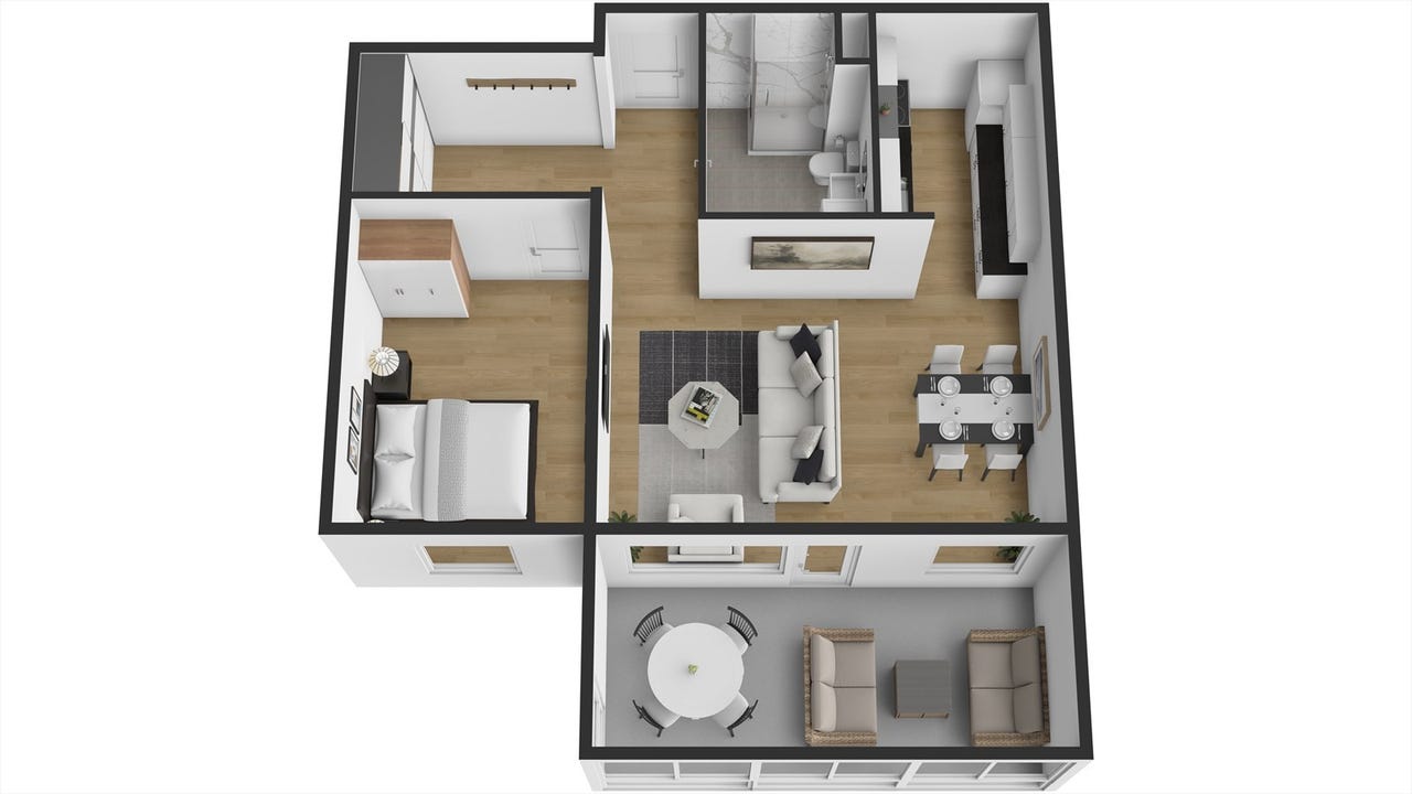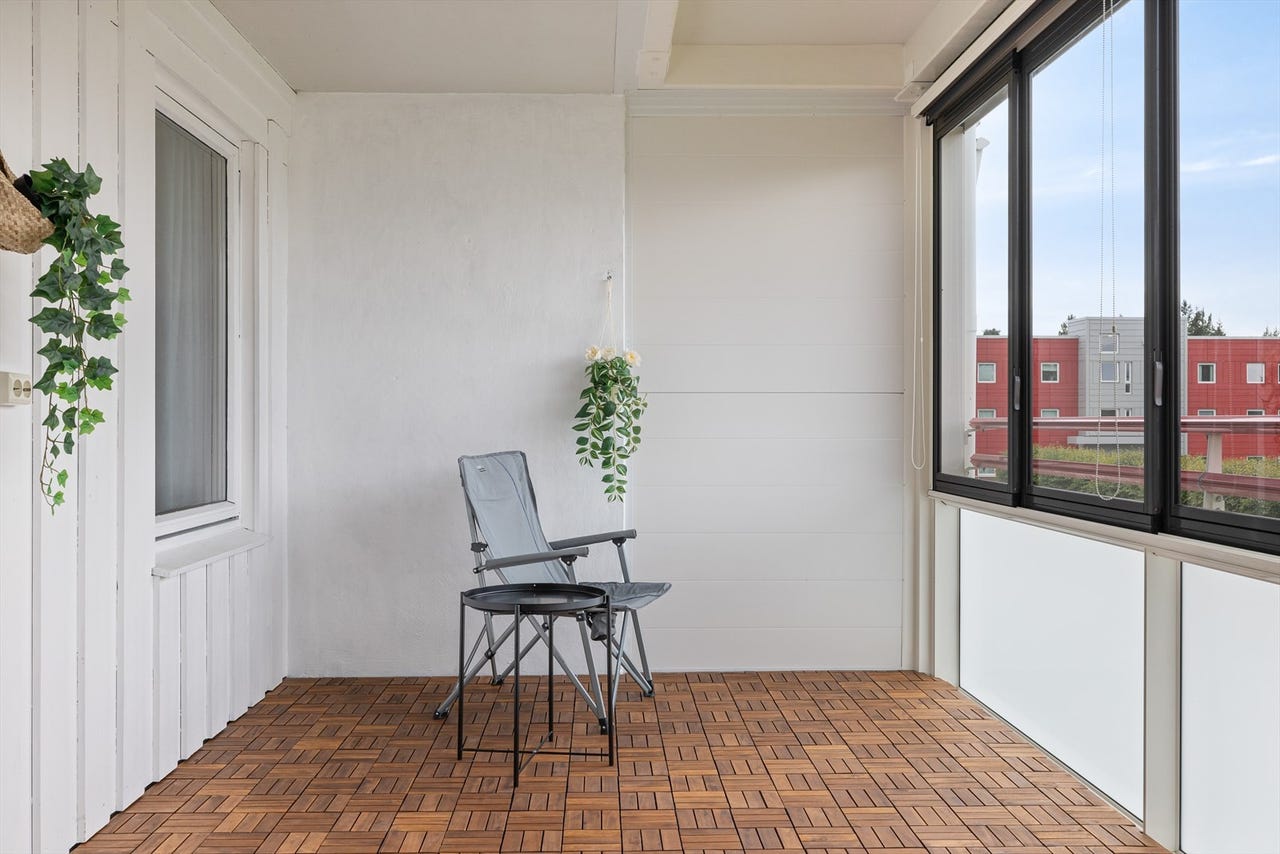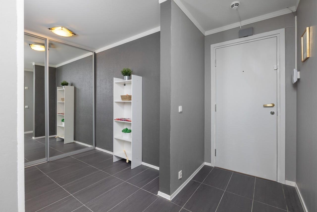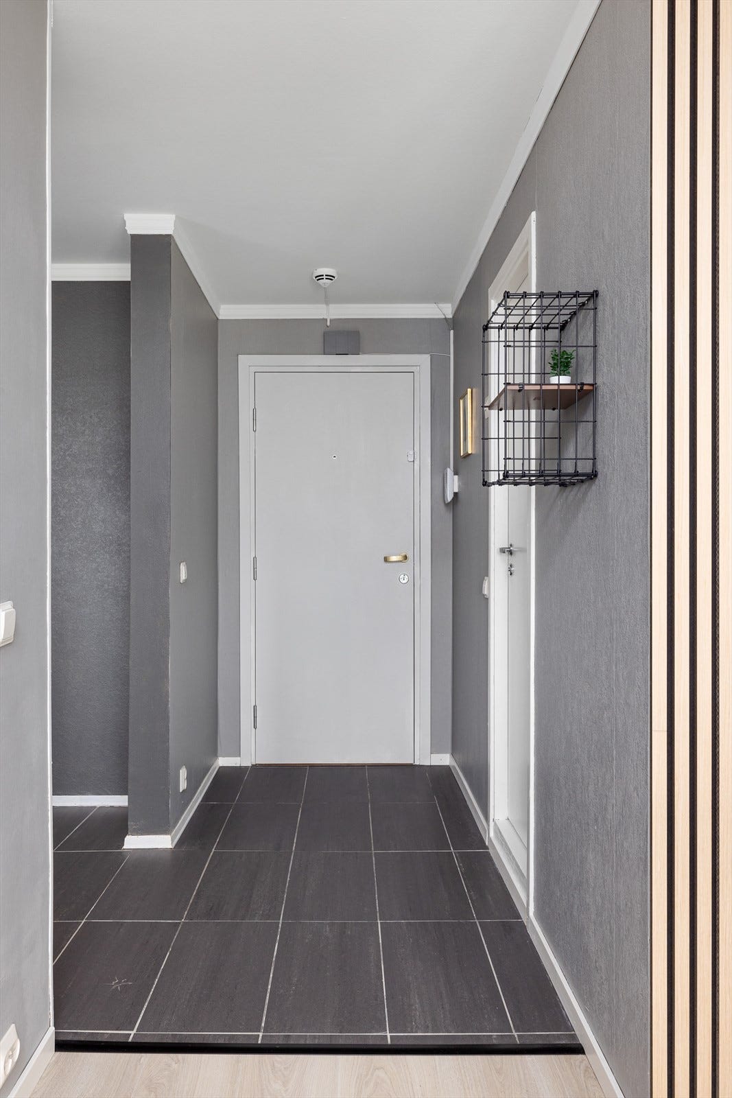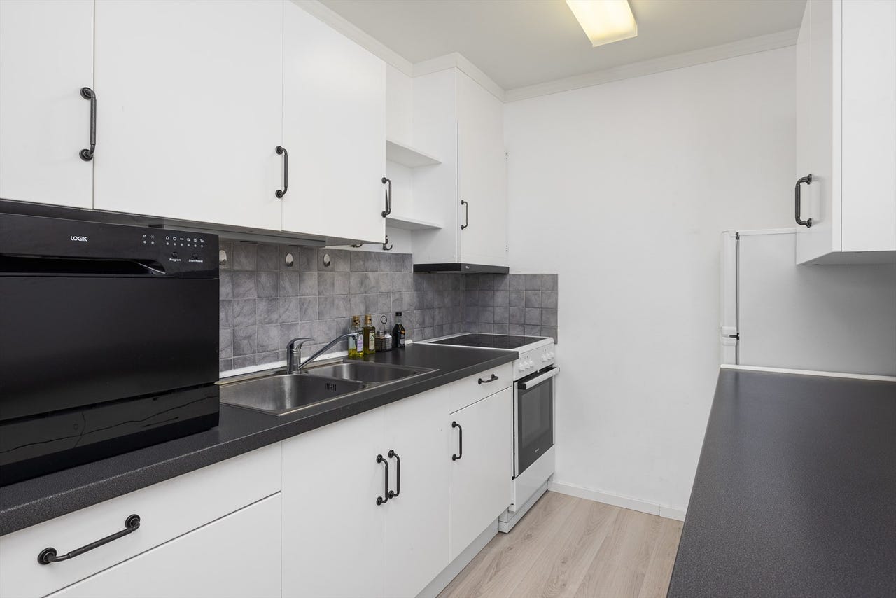 Leiligheten ligger i 1.etasje og har blant annet entre, soverom, stue, kjøkken og bad. Leiligheten er malt i en fin gråfarge, mellom stuen og kjøkkenet finner du en moderne spilevegg. Romslig, innglasset balkong med utsikt over fellesområdet.