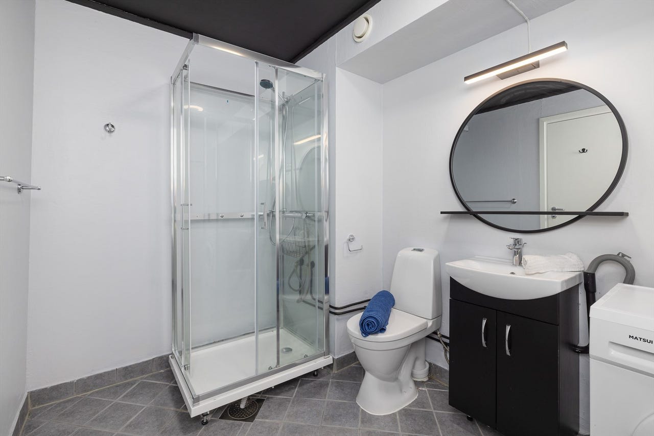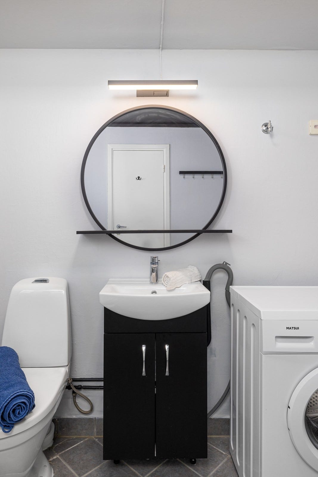 Baderom fremstår fra byggeåret med noen oppgraderinger i årenes løp. Gulv med fliser og flissokel. Vegger behandlet med våtromsmaling. Himling med malt betong. Installasjoner med servant i innredning, gulvmontert WC og dusjkabinett. Opplegg for vaskemaskin. Oppvarming med stråleovn. Sentralavtrekk med ventil på vegg, tilluft med spalte under dørblad.