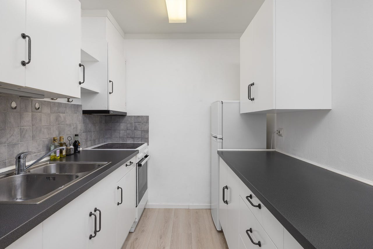 Kjøkkeninnredning med laminerte fronter og skrog, benkeplater av laminat. Benkebeslag med oppvaskkum og utslagsvask. Veggflater med over kjøkkenbenk med fliser og malt gips/betong, overganger benk/vegg med list. Opplegg for oppvaskmaskin.