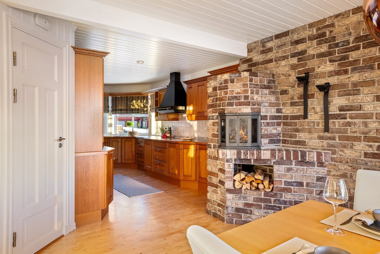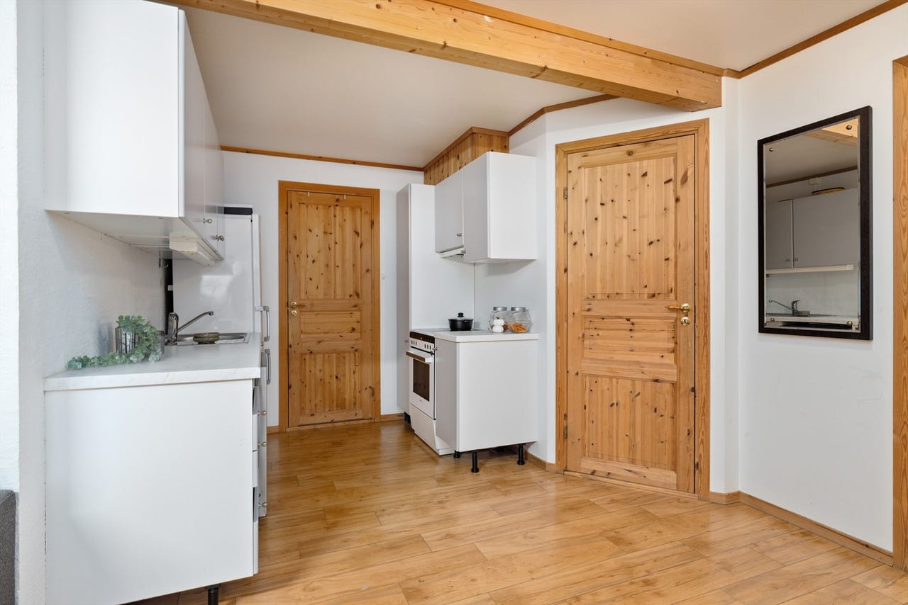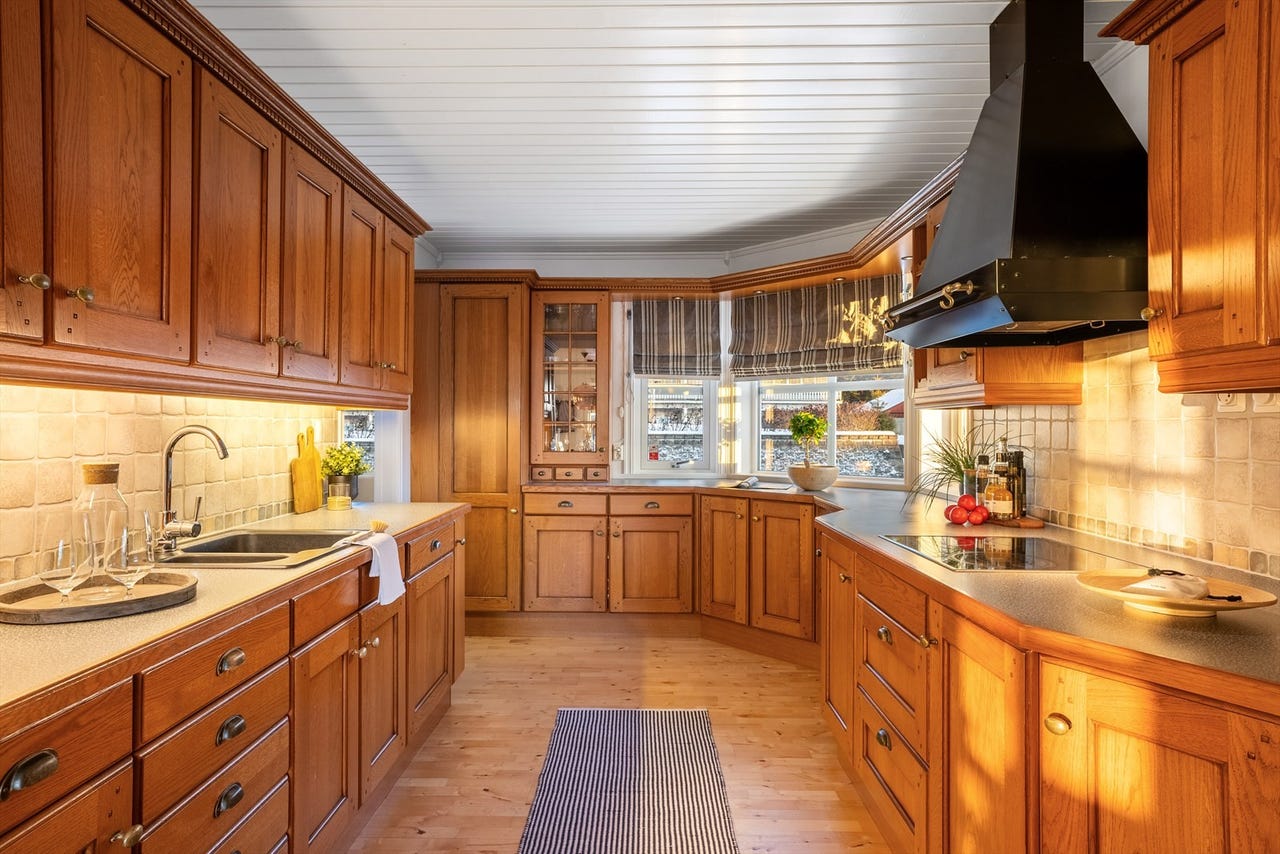 Kjøkken fra opprinnelig byggeår med laminerte fronter og laminerte skrog. Laminerte benkeplater med nedsenket oppvaskkum i metall. Veggoverflater over benker med fliser og malt panel. Fasadestein i spisedelen. Kjøkken med opplegg for oppvaskmaskin, hvitevarer plassert i kjøkkennisjer.