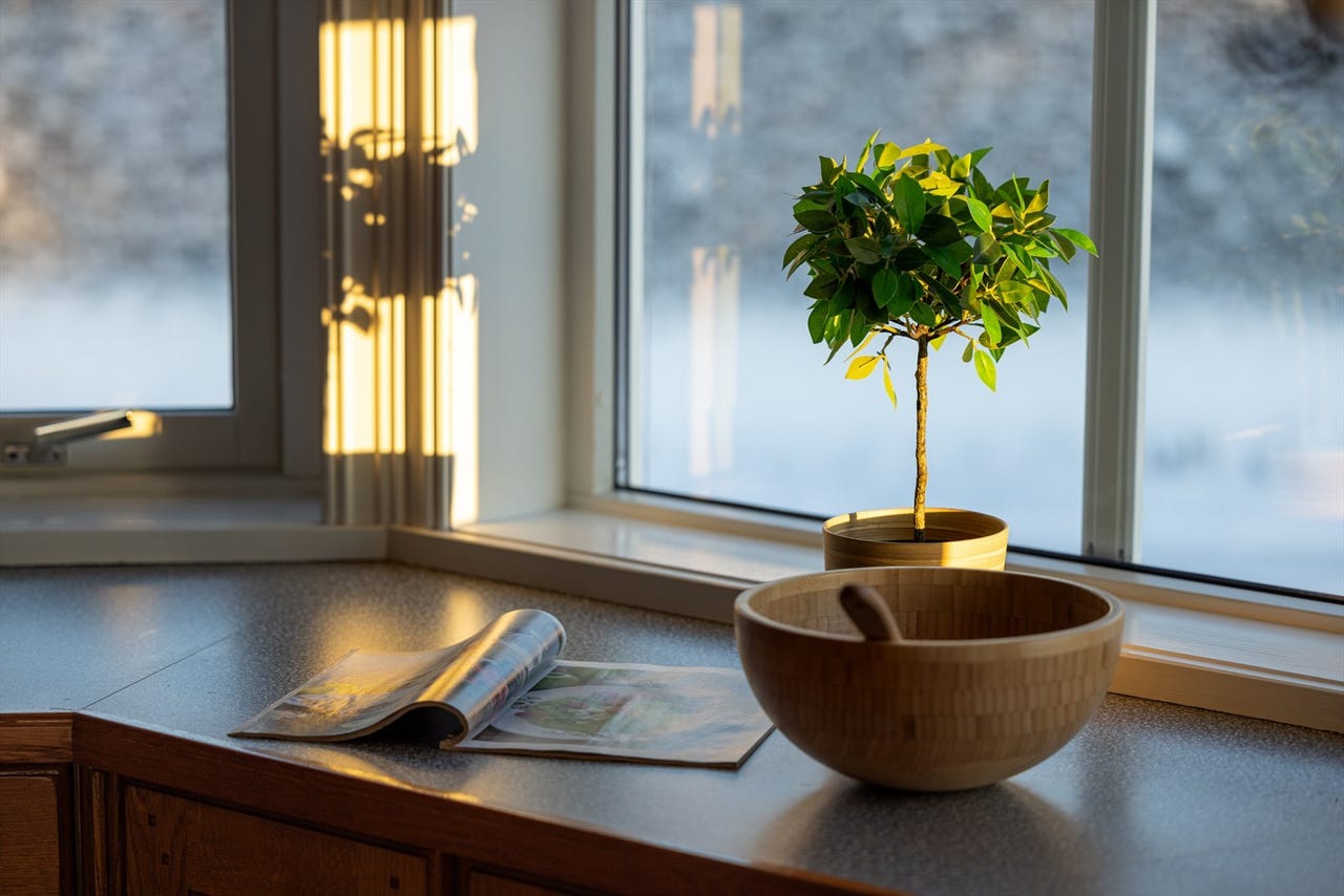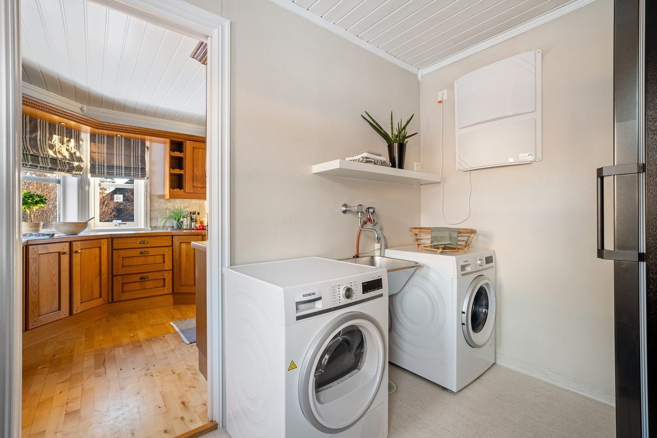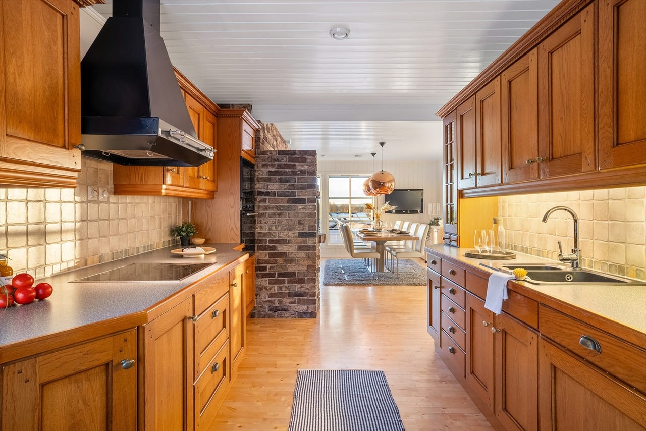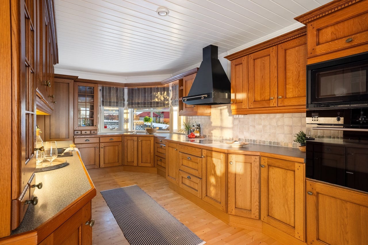 Kjøkken fra opprinnelig byggeår med laminerte fronter og laminerte skrog. Laminerte benkeplater med nedsenket oppvaskkum i metall. Veggoverflater over benker med fliser og malt panel. Fasadestein i spisedelen. Kjøkken med opplegg for oppvaskmaskin, hvitevarer plassert i kjøkkennisjer.