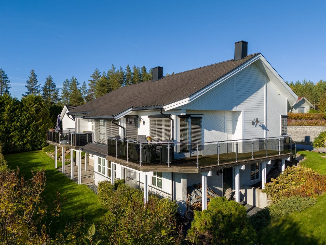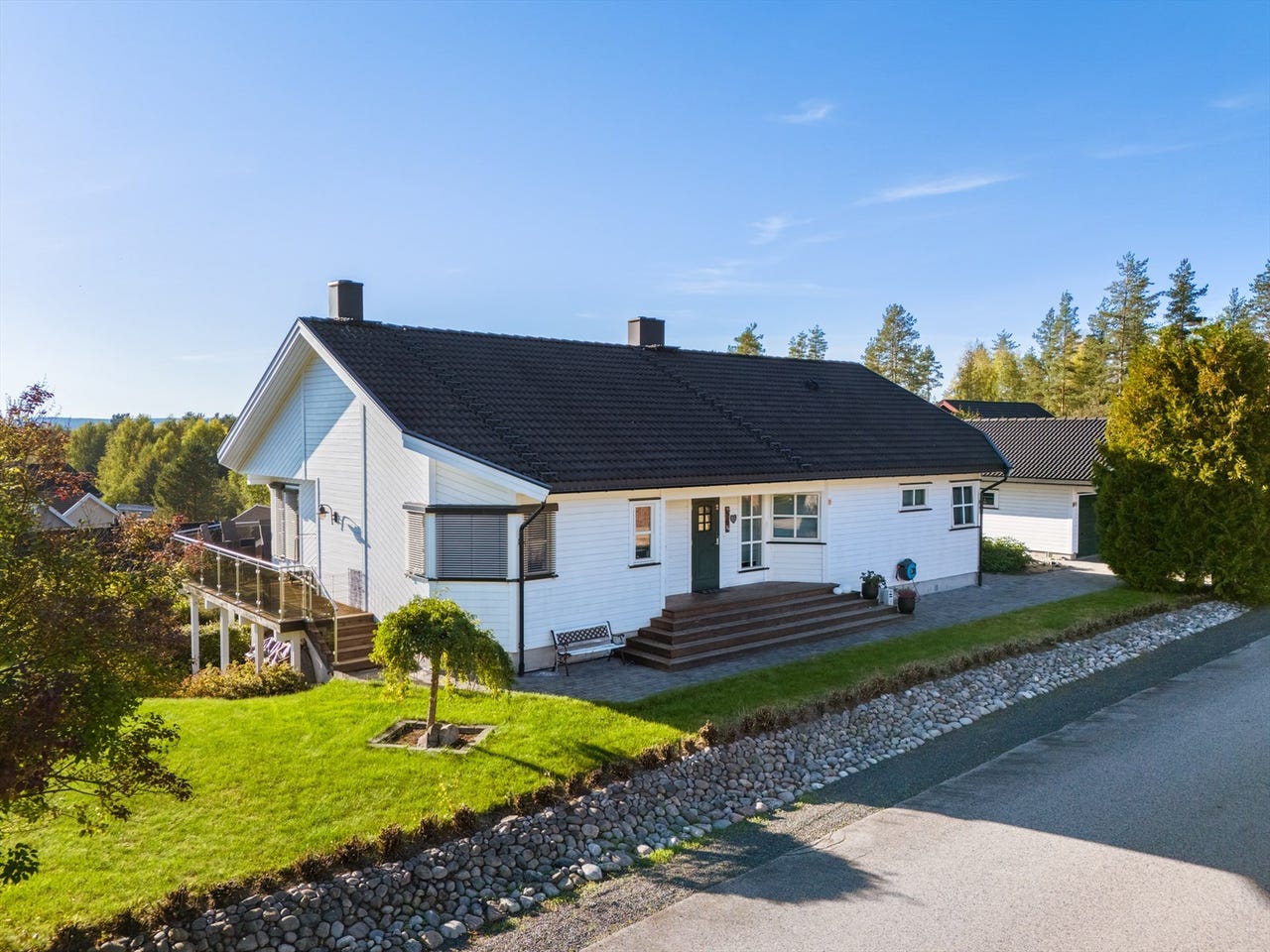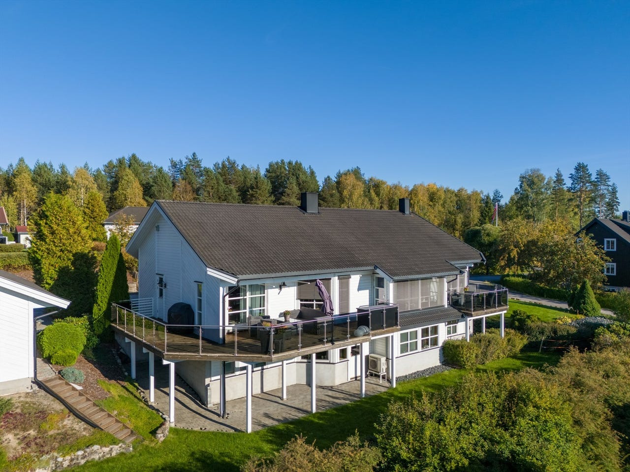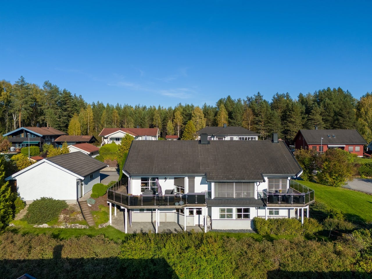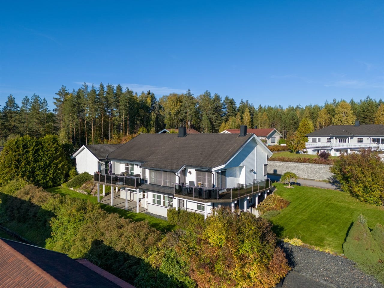 Her kan vi presentere en stor, unik arkitekttegnet enebolig. Fin utsikt og romslig tomt. Boligen er godt vedlikeholdt, og har en god planløsning med blant annet stue, spisestue, TV-stue, kjøkken, bad, vaskerom, toalettrom, kjølerom, 4 soverom og kjellerstue. Utleiedel med egen inngang som gir gode muligheter for leieinntekter. Opparbeidet uteområde brosteinsbelagt innkjøring, og hage med plen og diverse beplantning. Isolert frittstående dobbel garasje med boder.