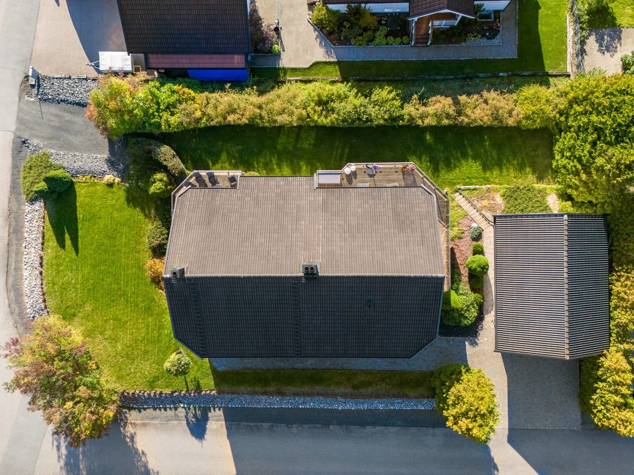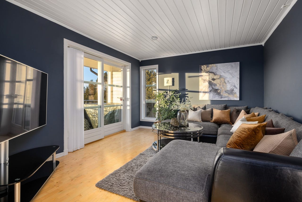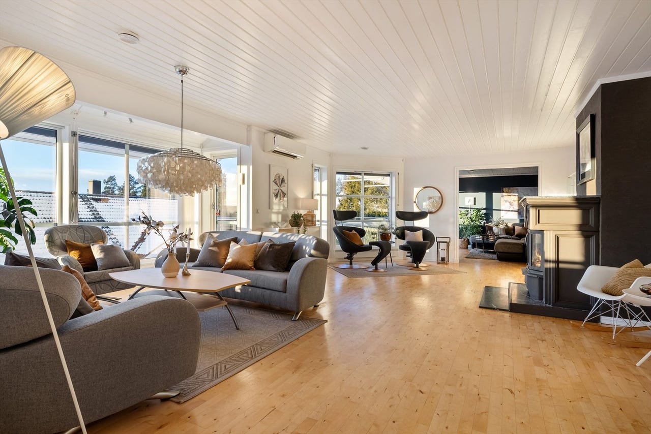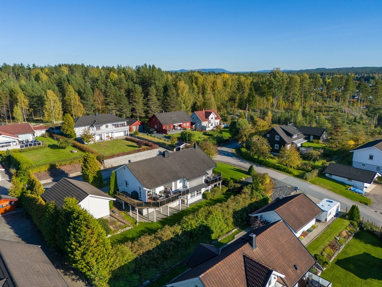 Her kan vi presentere en stor, unik arkitekttegnet enebolig. Fin utsikt og romslig tomt. Boligen er godt vedlikeholdt, og har en god planløsning med blant annet stue, spisestue, TV-stue, kjøkken, bad, vaskerom, toalettrom, kjølerom, 4 soverom og kjellerstue. Utleiedel med egen inngang som gir gode muligheter for leieinntekter. Opparbeidet uteområde brosteinsbelagt innkjøring, og hage med plen og diverse beplantning. Isolert frittstående dobbel garasje med boder.