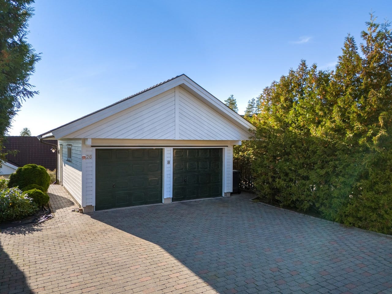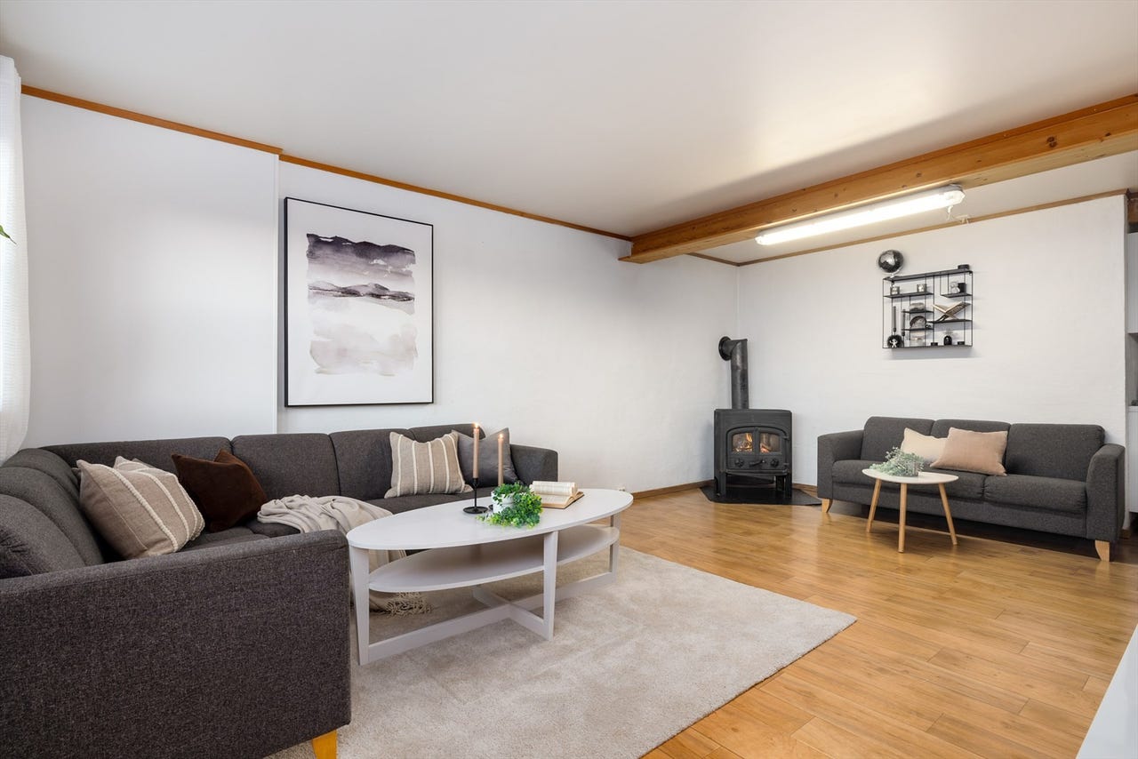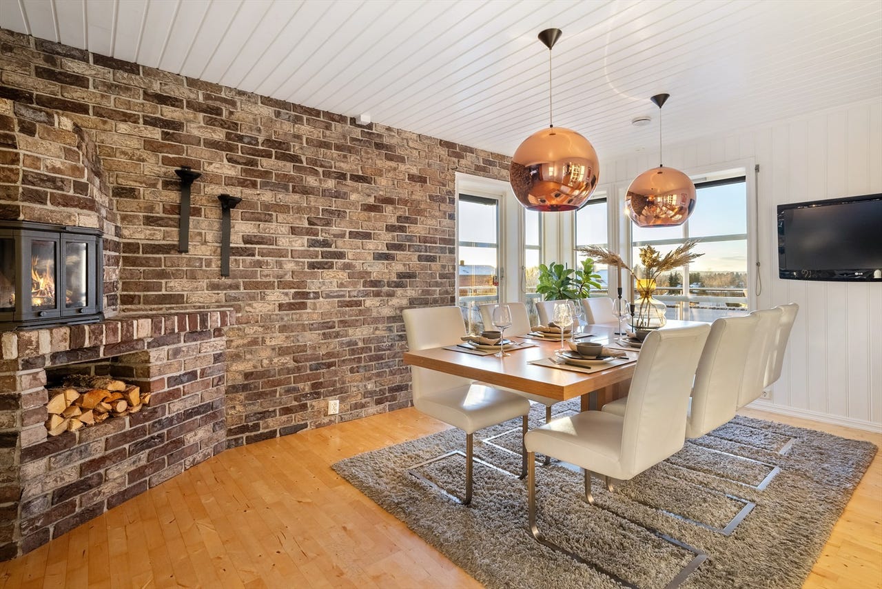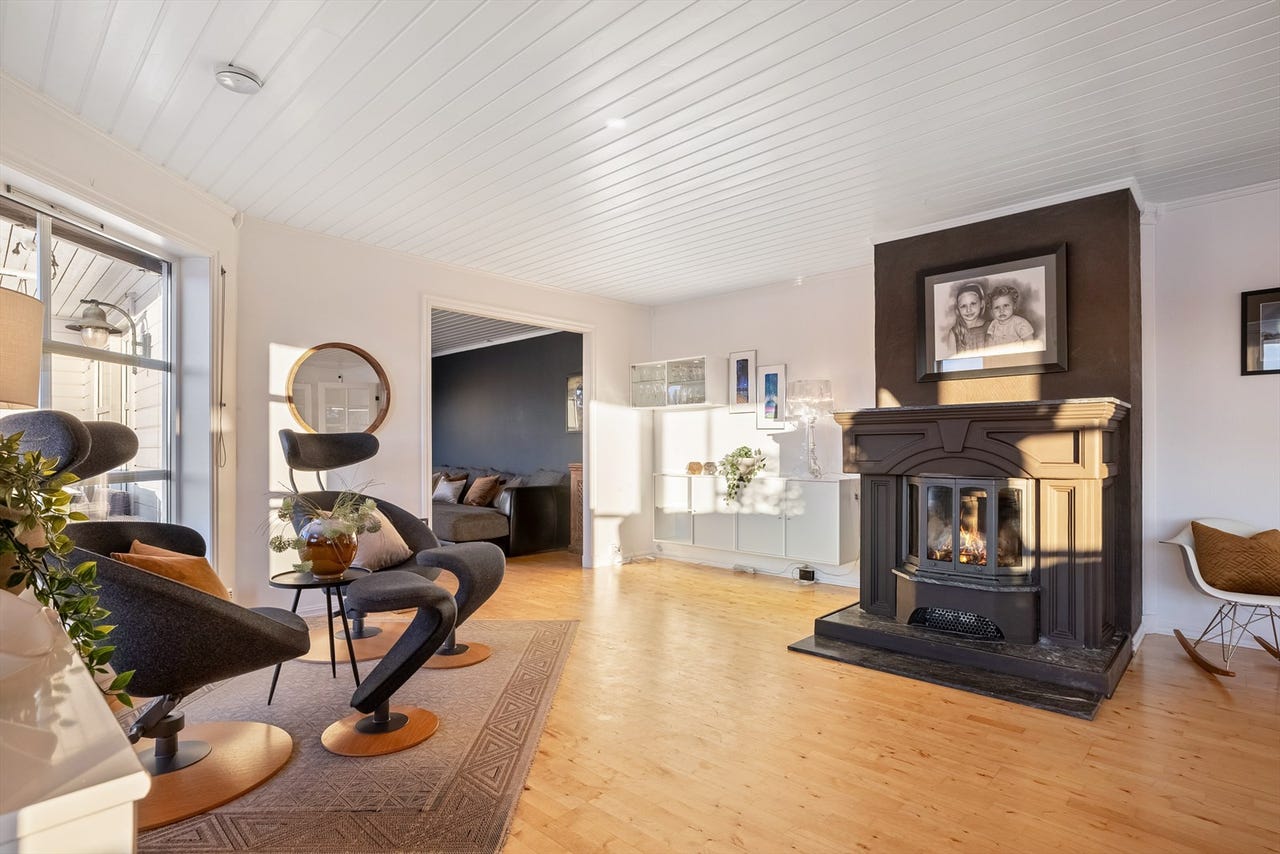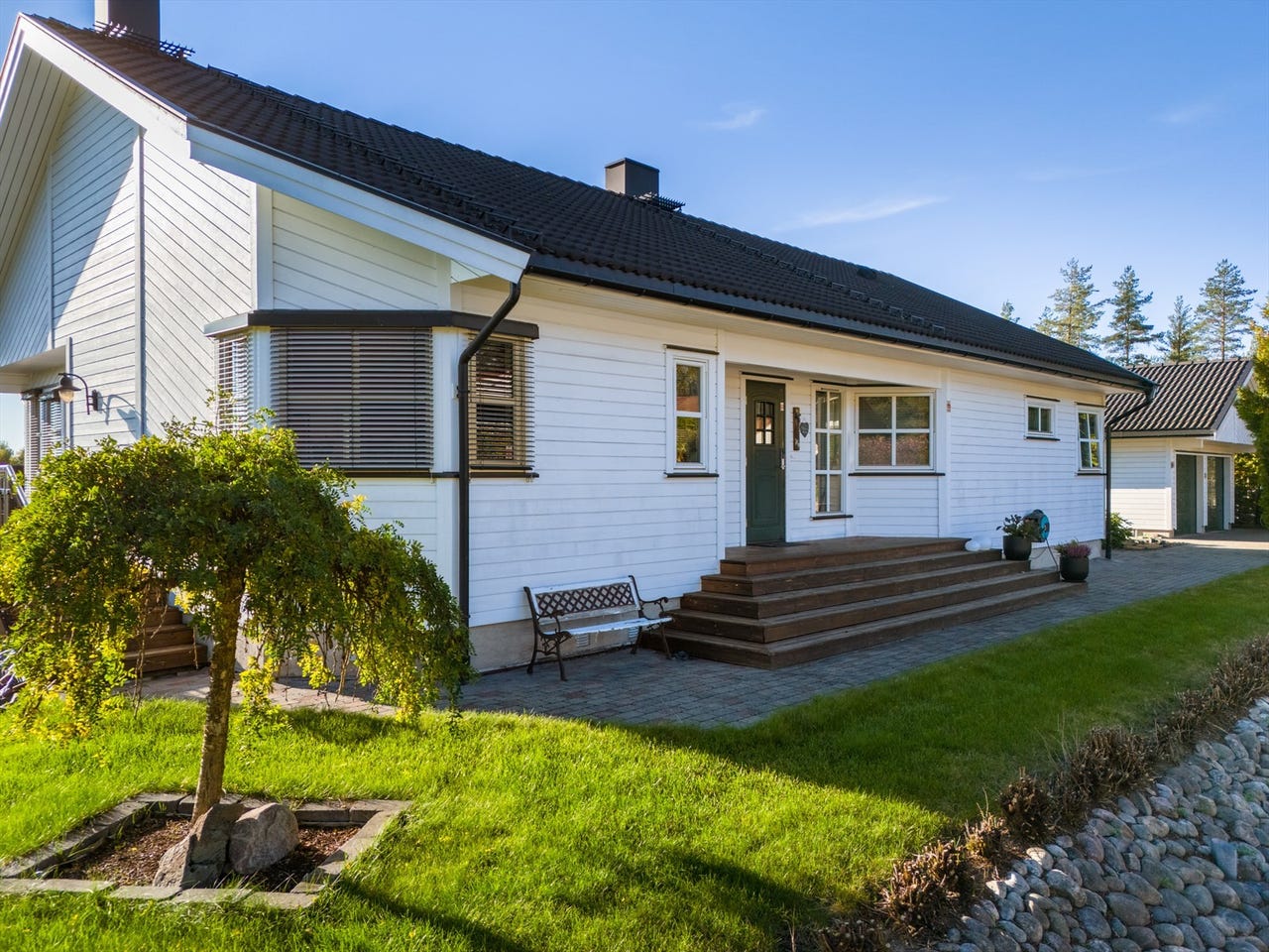 Her kan vi presentere en stor, unik arkitekttegnet enebolig. Fin utsikt og romslig tomt. Boligen er godt vedlikeholdt, og har en god planløsning med blant annet stue, spisestue, TV-stue, kjøkken, bad, vaskerom, toalettrom, kjølerom, 4 soverom og kjellerstue. Utleiedel med egen inngang som gir gode muligheter for leieinntekter. Opparbeidet uteområde brosteinsbelagt innkjøring, og hage med plen og diverse beplantning. Isolert frittstående dobbel garasje med boder.