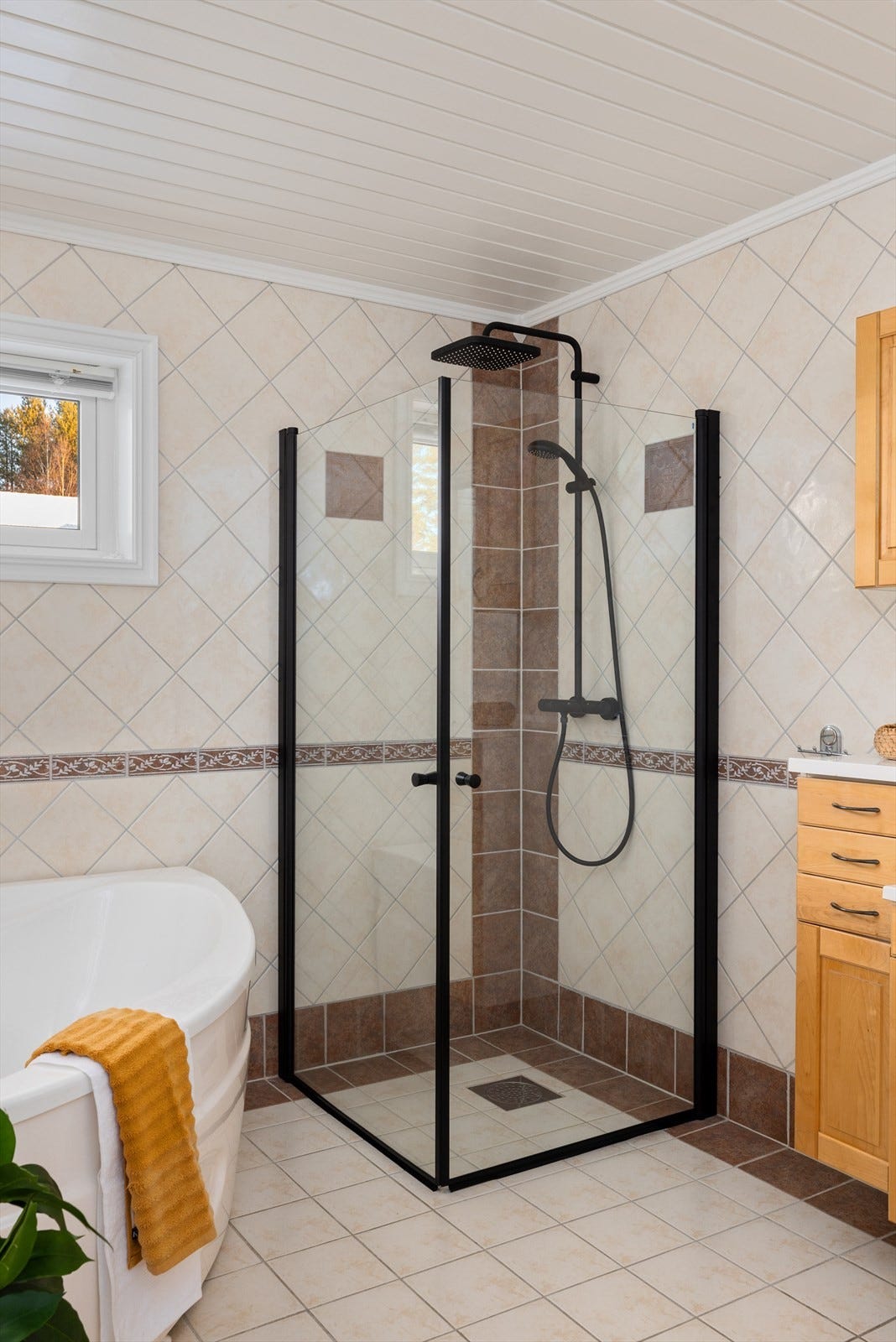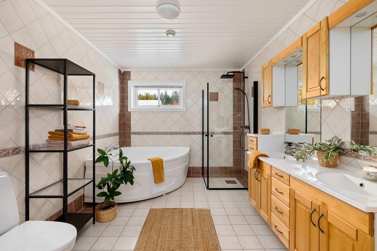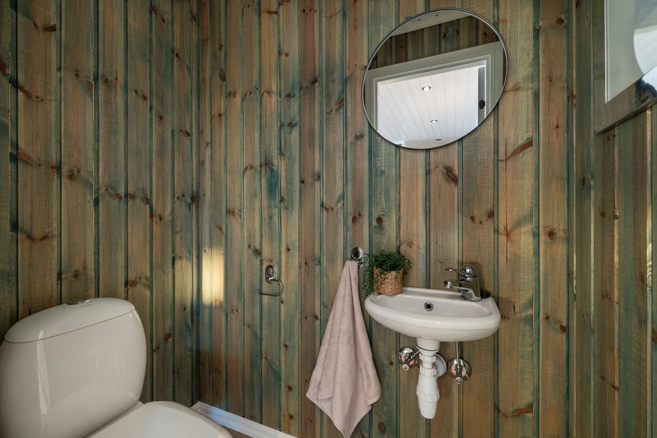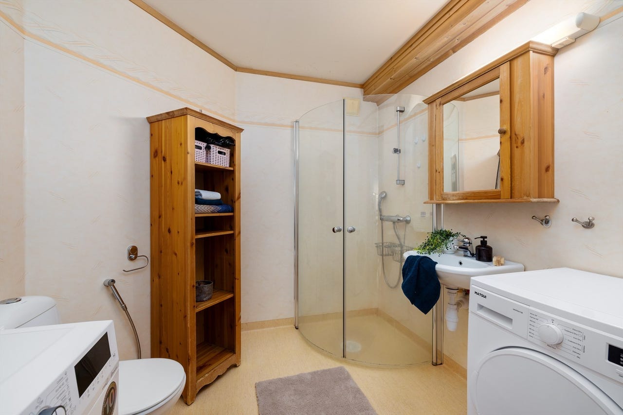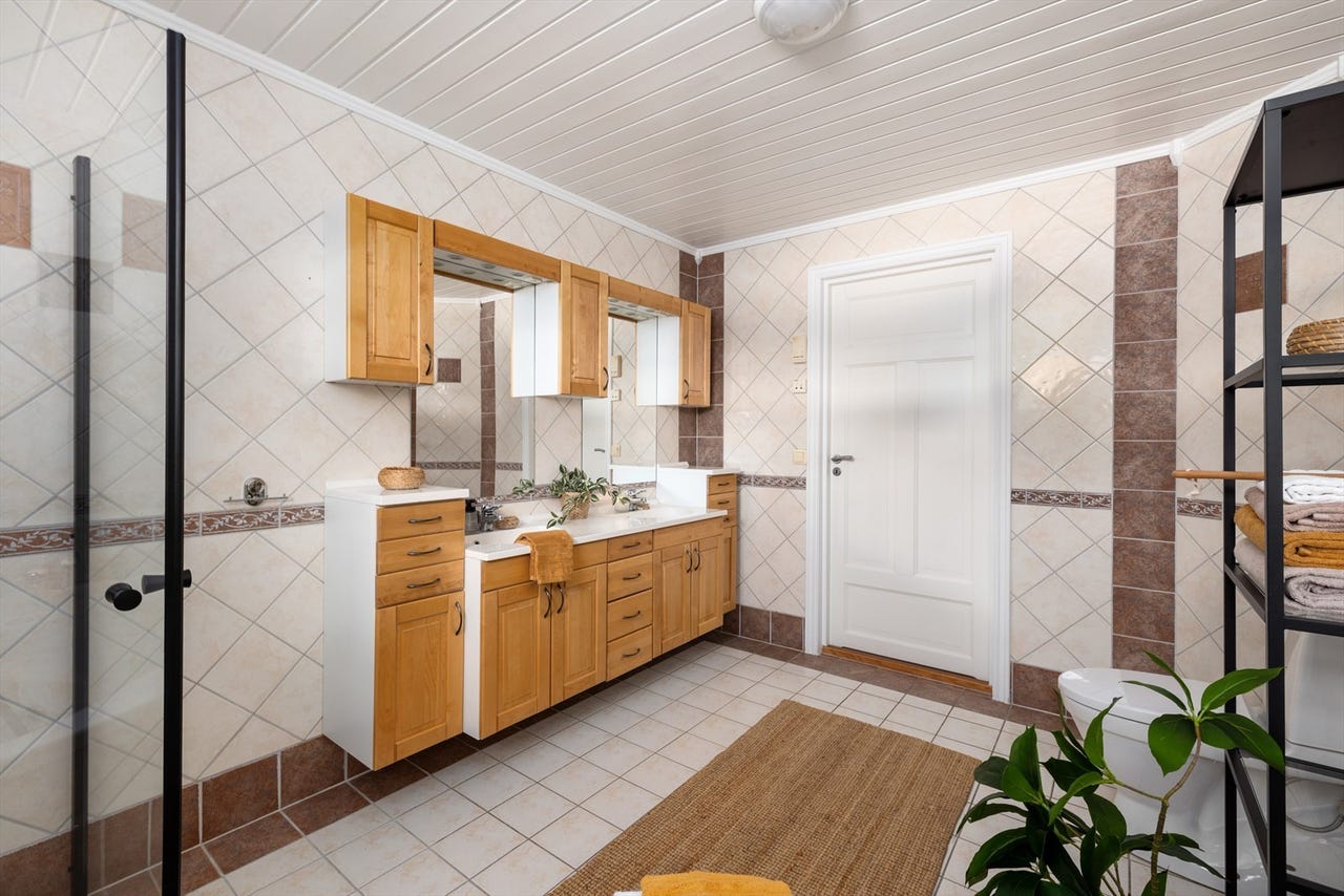 Kjellerleiligheten har ett bad. Hovedboligen har ett bad, ett toalettrom og ett vaskerom. Baderom hovedsakelig fra byggeår, lite brukt slitasje.