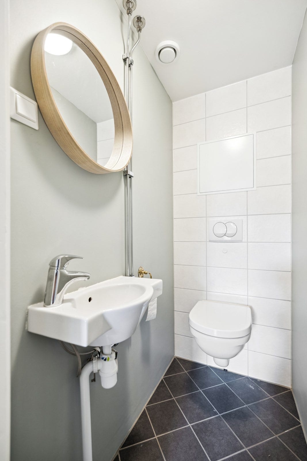 Toalettrom opplyst renovert i regi av borretsslaget i 2017. Gulv med fliser, vegger med fliser og malt pussbehandling. Installasjoner med veggmontert WC og servant på vegg. Oppvarming med elektrisk gulvvarme. Overflater og installasjoner med generelt liten bruksslitasje.