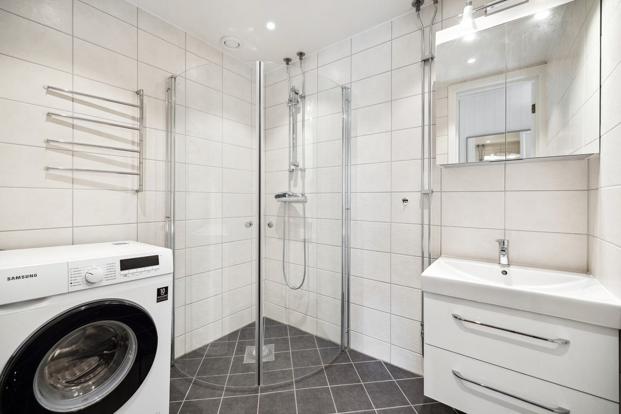 Baderommet opplyst renovert i regi av borettslaget i 2017. Gulv og vegger med fliser, himling med malte plater. Oppvarming med elektrisk gulvvarme. Servant i innredning. dusjvegger og opplegg for vaskemaskin.