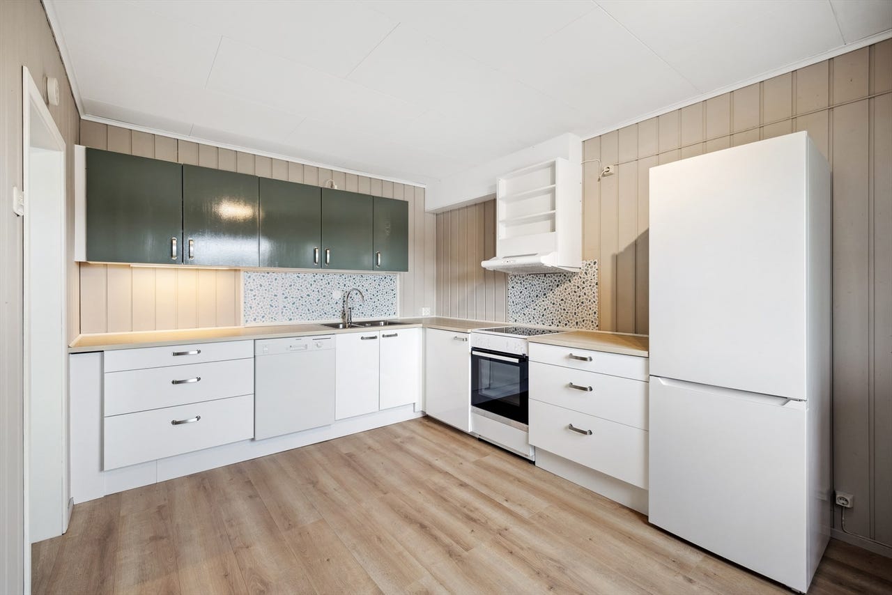 Kjøkkeninnreding med laminerte fronter og laminerte skrog. Benkeplate i laminat med nedsenket oppvaskkummer i metall. Veggflater over benkeplater med behandlet panel. Montert sprutskjold ved oppvaskkum og koketopp med PVC-plater, overgang med trelist. Kjøkken med opplegg for oppvaskmaskin, hvitevarer montert i kjøkkennisjer. Komfyrvakt og lekkasjevakt er ikke montert.