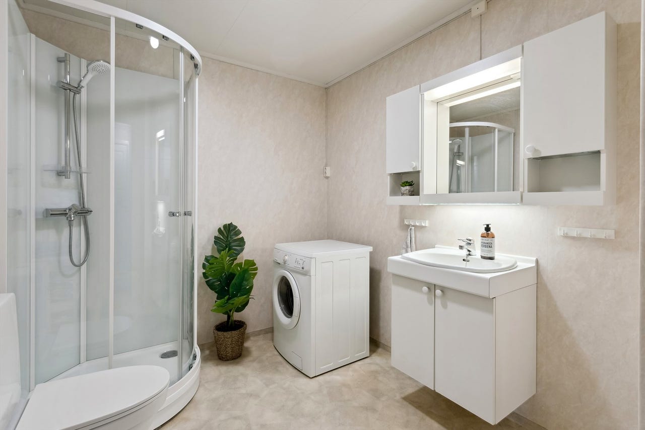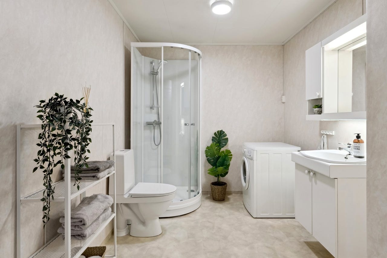 Gulv med belegg, mindre felt under dusjkabinett med fliser. Vegger med beleggsoppbrett og vinyltapet. Oppvarming med elektrisk gulvvarme.