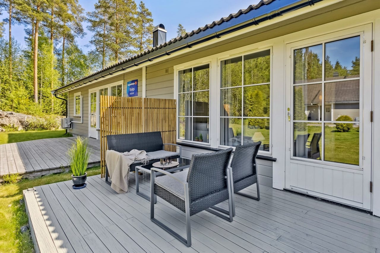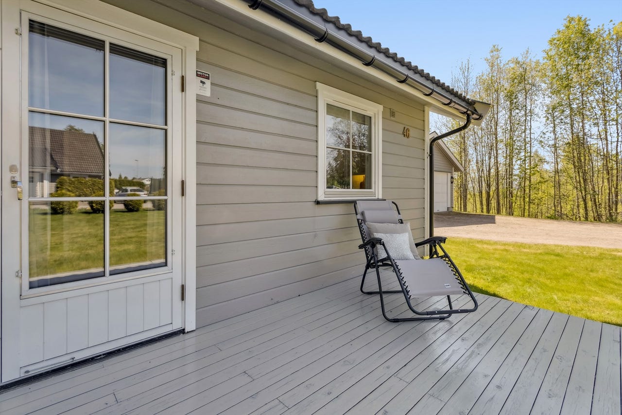 Vinduer med isolerglass, vinduer fra byggeåret. Nedre vannbrett i metall, øvrige med med malt omrammingsbord. Laminert ytterdør med glassfelt, dør med mekanisk åpne- og låsemekanisme. Malt terrassedør med isolerglass, boddør i med malt heltredør. Innerdør mellom gang/stue med skyvefunksjon fra opprinnelig byggeår. Dører og vinduer hovedsakelig fra opprinnelig byggeår. Saltakskonstruksjon med kaldtloft. Adkomst til kaldtloftet via himlingsluke plassert på innvendig bod, luke med fastmontert stige. Lufting av loftet via spalter ved raft, ventiler i gavler samt under mønestein. Undertak utført med trefiberplater. Himling mot kaldtloft isolert med mineralull, isolasjonplater med vindsperrepapp. Synlig gips med brannskille mot naboloft. Aggregat for sentralavtrekk plassert på loft, synlig isolerte kanalføringer.
