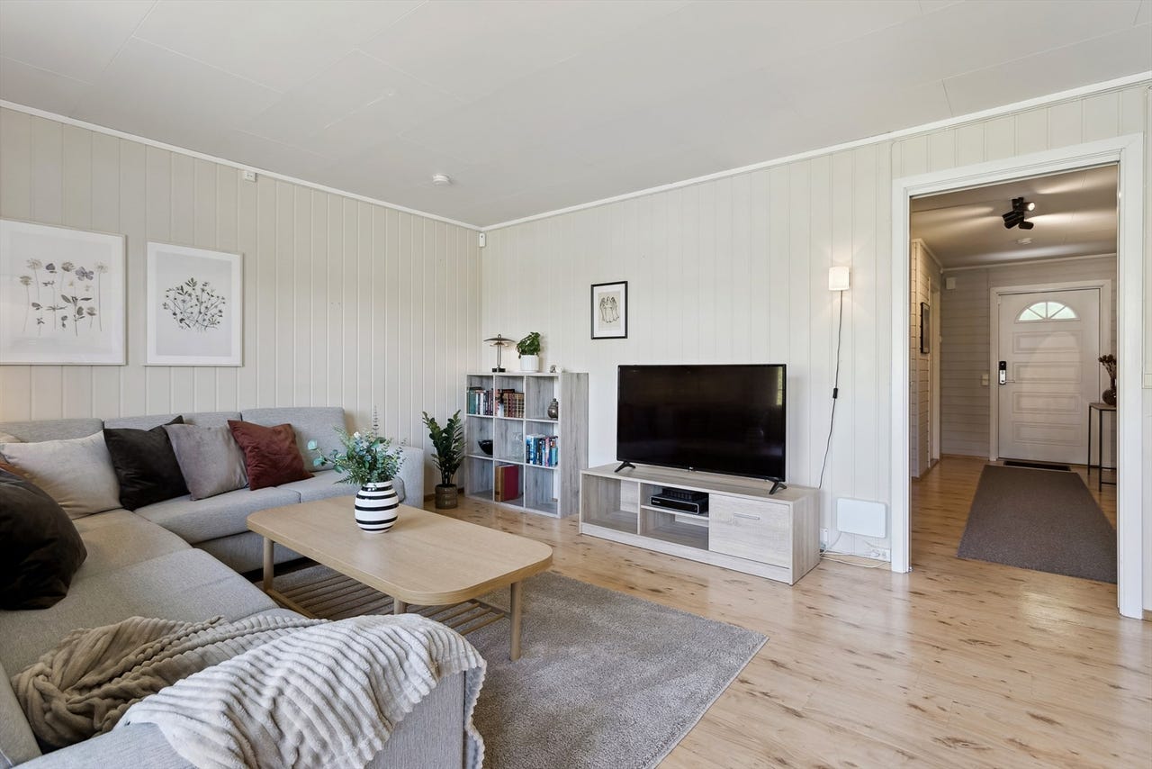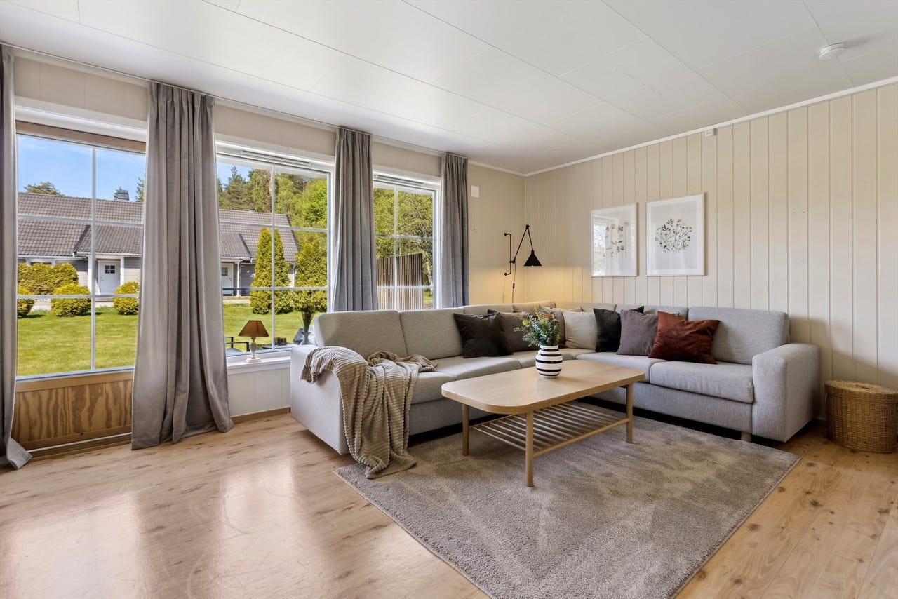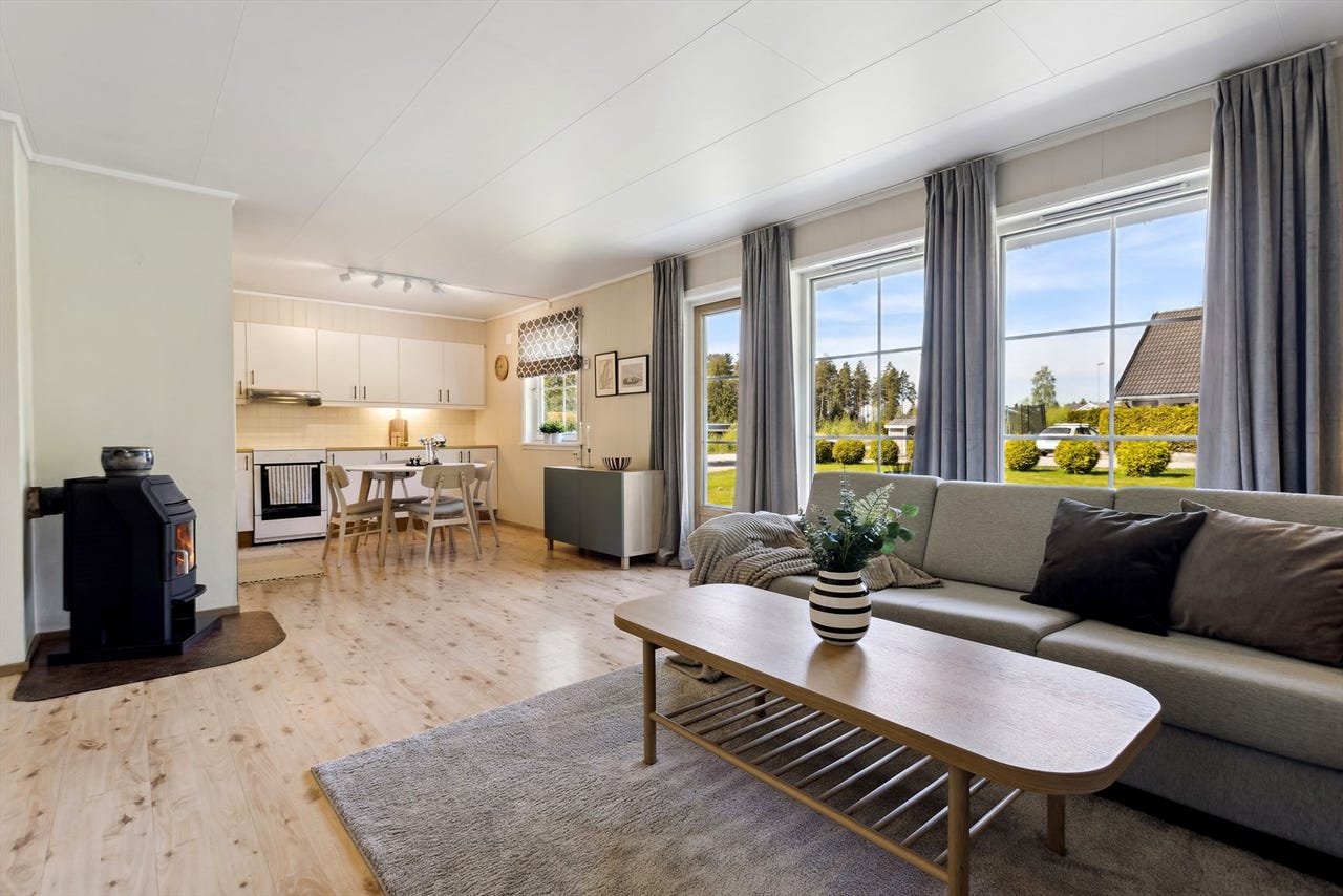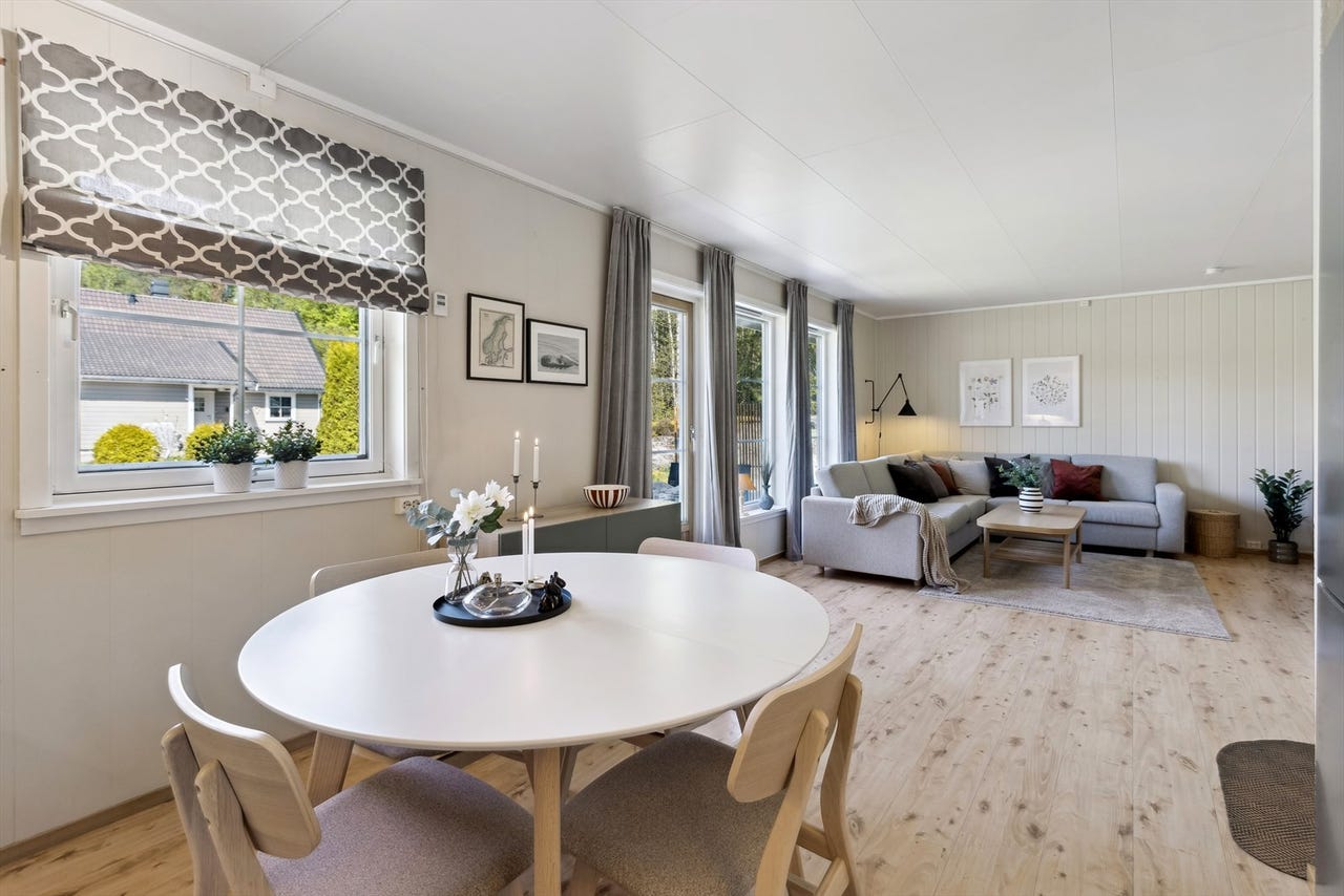 Åpen, lys stue- og kjøkkenløsning. God plass til sofagruppe og spisesgruppe.