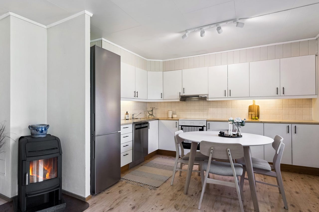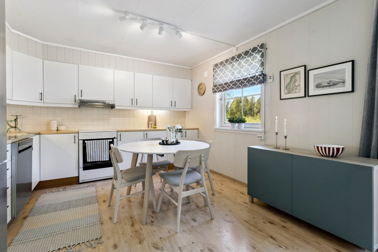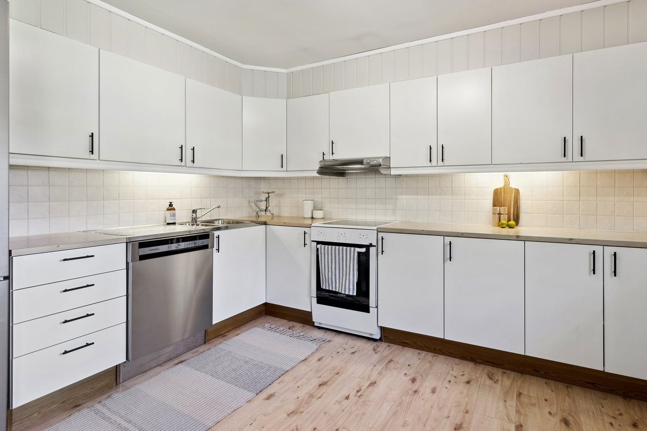 Kjøkkeninnredning fra opprinnelig byggeår med laminerte fronter og laminerte skrog. Benkeplater i laminat med nedsenket oppvaskkum i metall. Veggflater over benkeplater fliser, overgang med mykfug. Kjøkken med opplegg for oppvaskmaskin, hvitevarer montert i kjøkken nisjer. Lekkasjevakt og komfyrvakt er ikke montert.