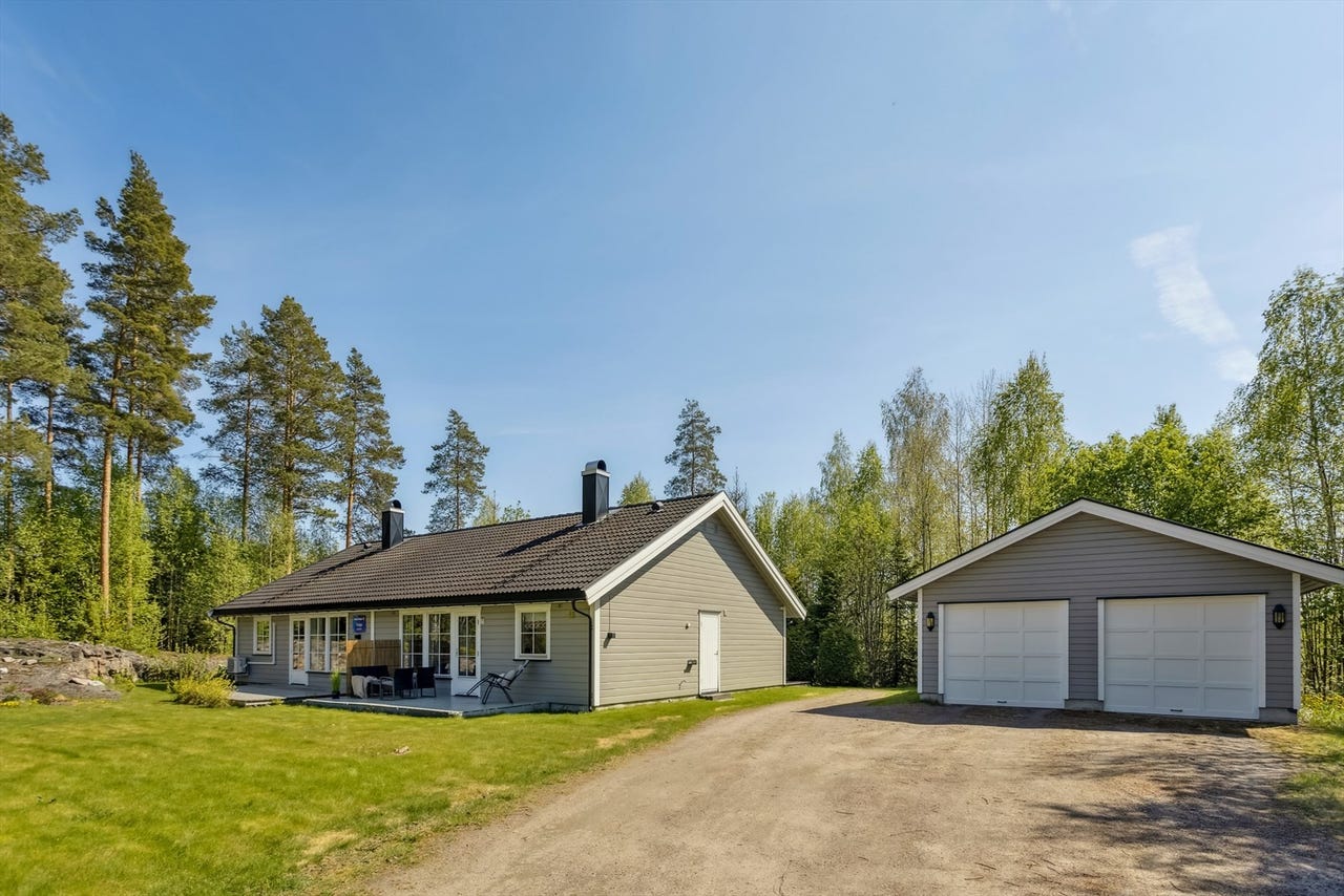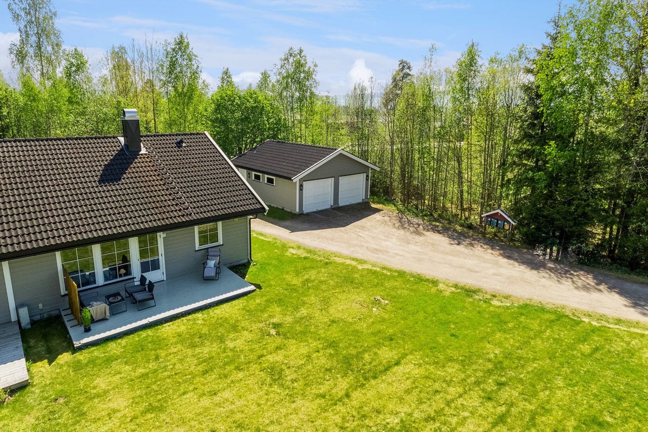 Halvpart av dobbelgarasje som deles av nabo, deler av garasjeareal etablert som bod. Opplyst byggeår ca 1998. Gulvkonstruksjon med støpt plate på mark, Lecasokler under yttervegger. Yttervegger i bindingsverk med utvendig liggende kledningsbord, utvendige overflatebehandlinger fra 2023. Boddør og leddport i malt treverk. Saltak tekket med betongtakstein. Renner og nedløp i metall. Innlagt strøm.