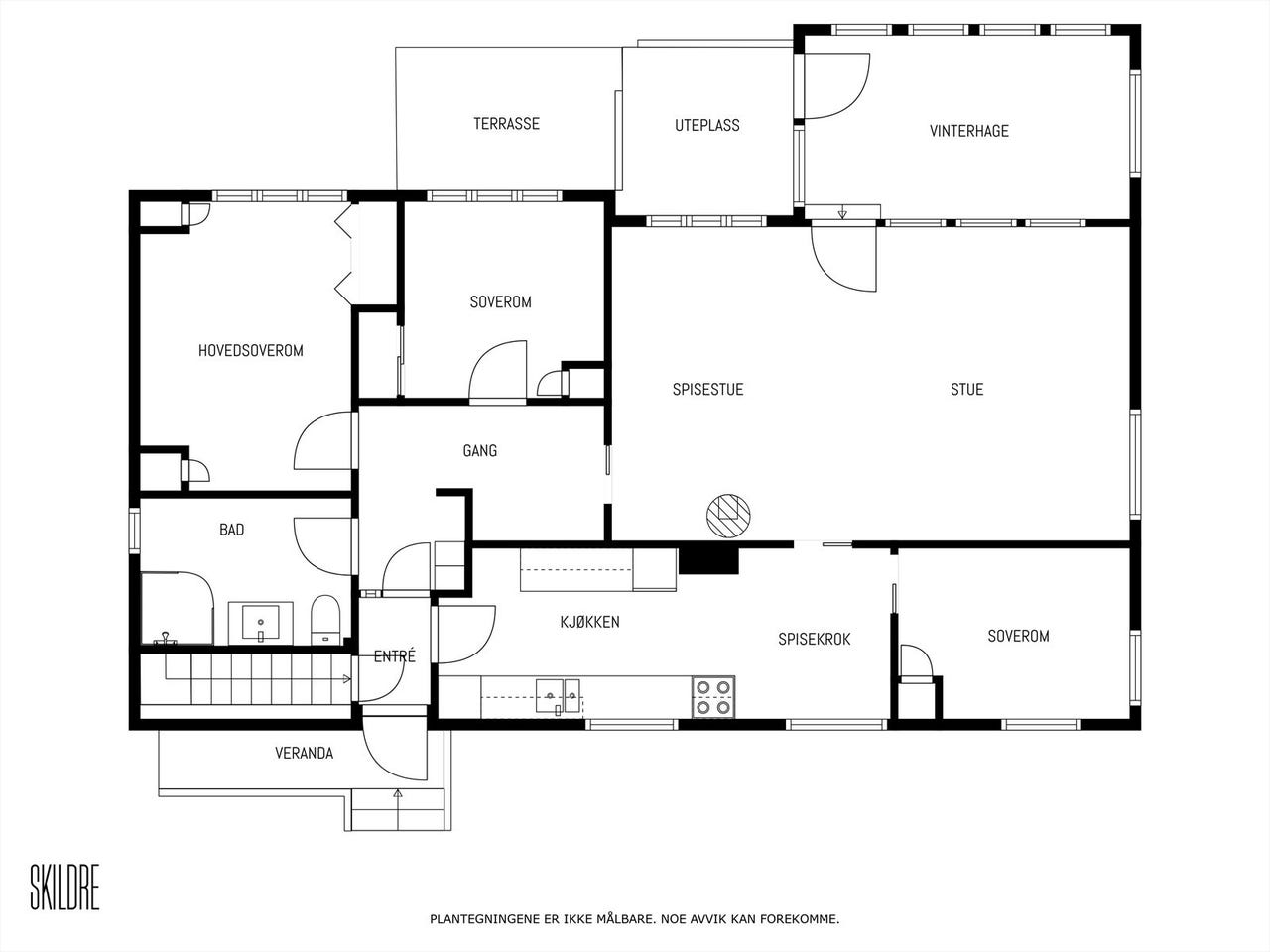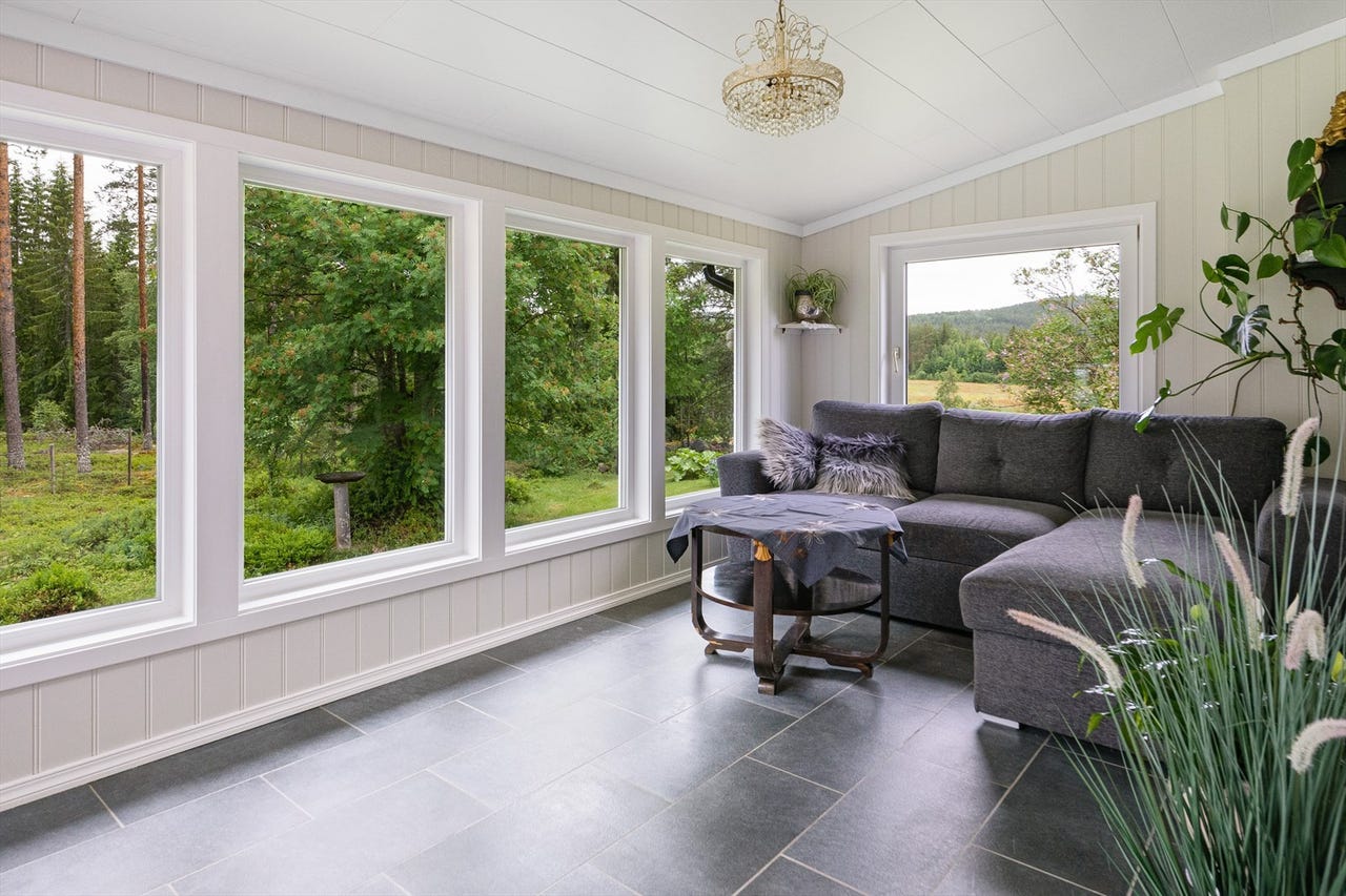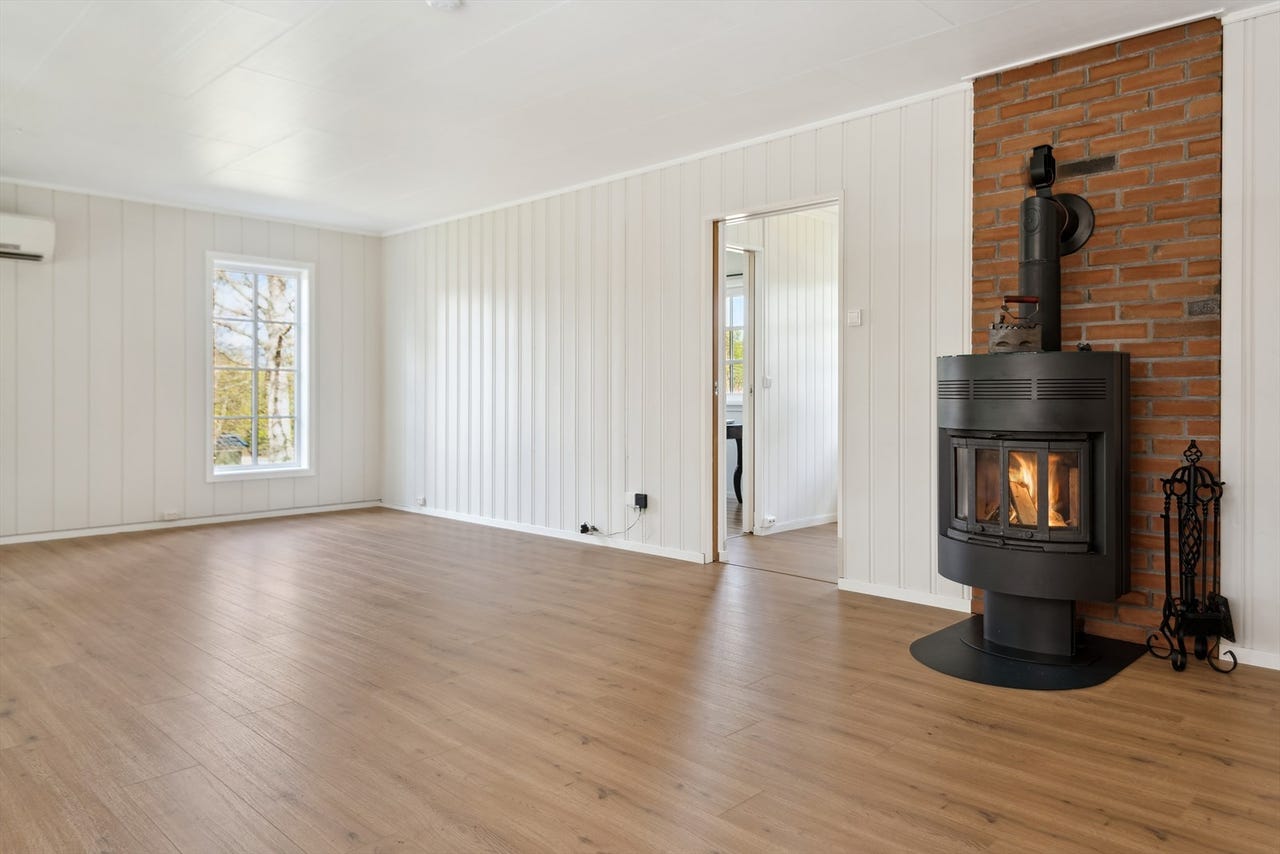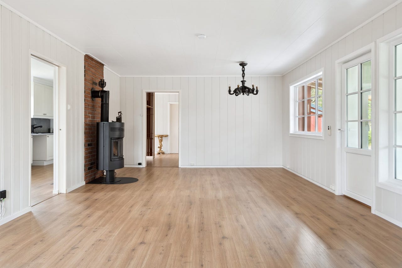 Koselig stue med god plass til sofakrok og spisestue. Adkomst til innglasset veranda. Oppvarming med blant annet vedfyring og varmepumpe. Nye gulv på kjøkken og stue.