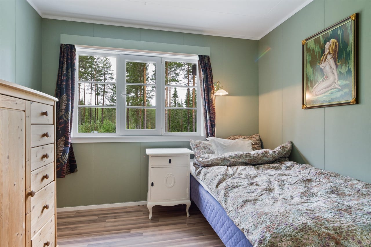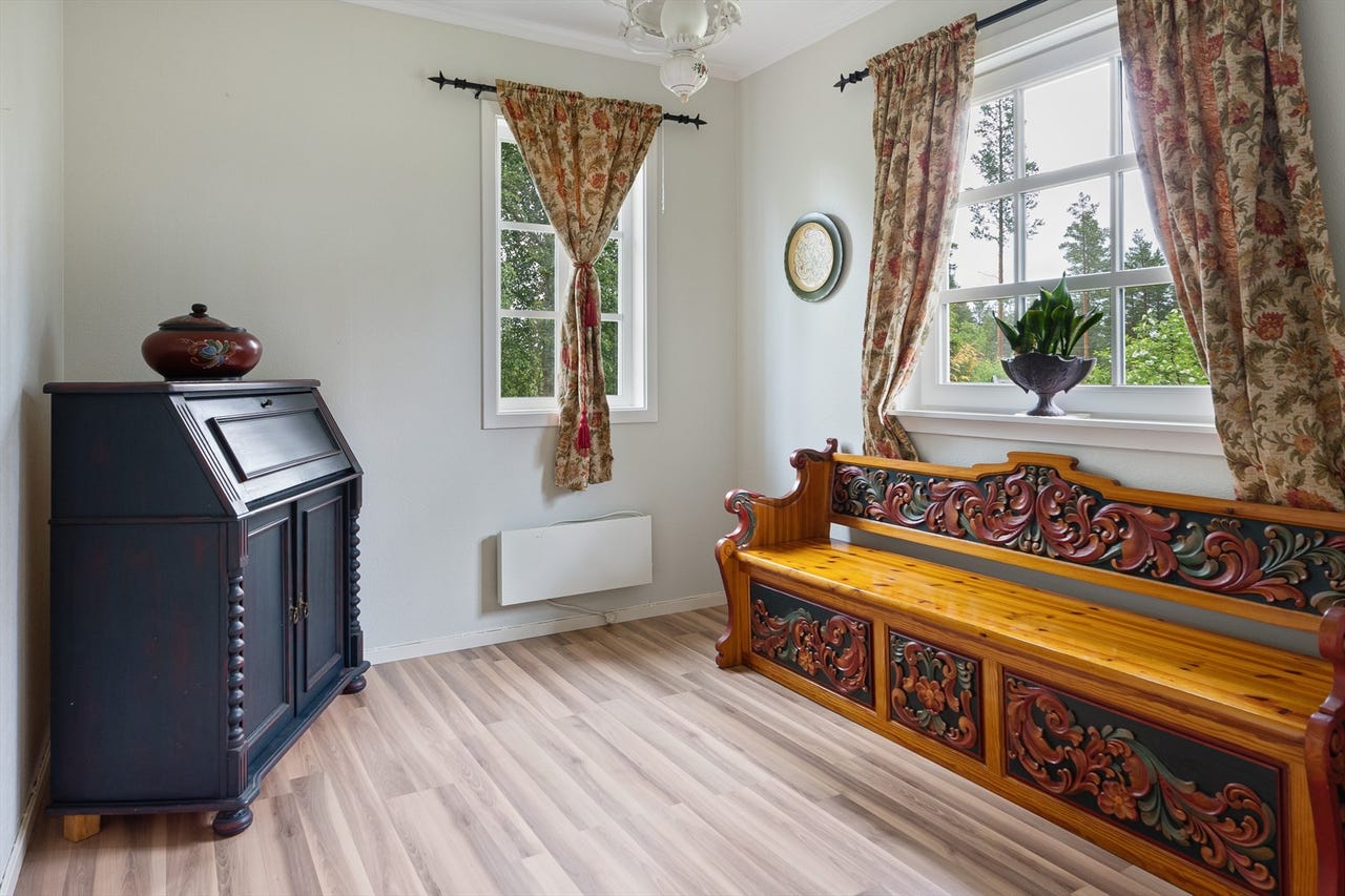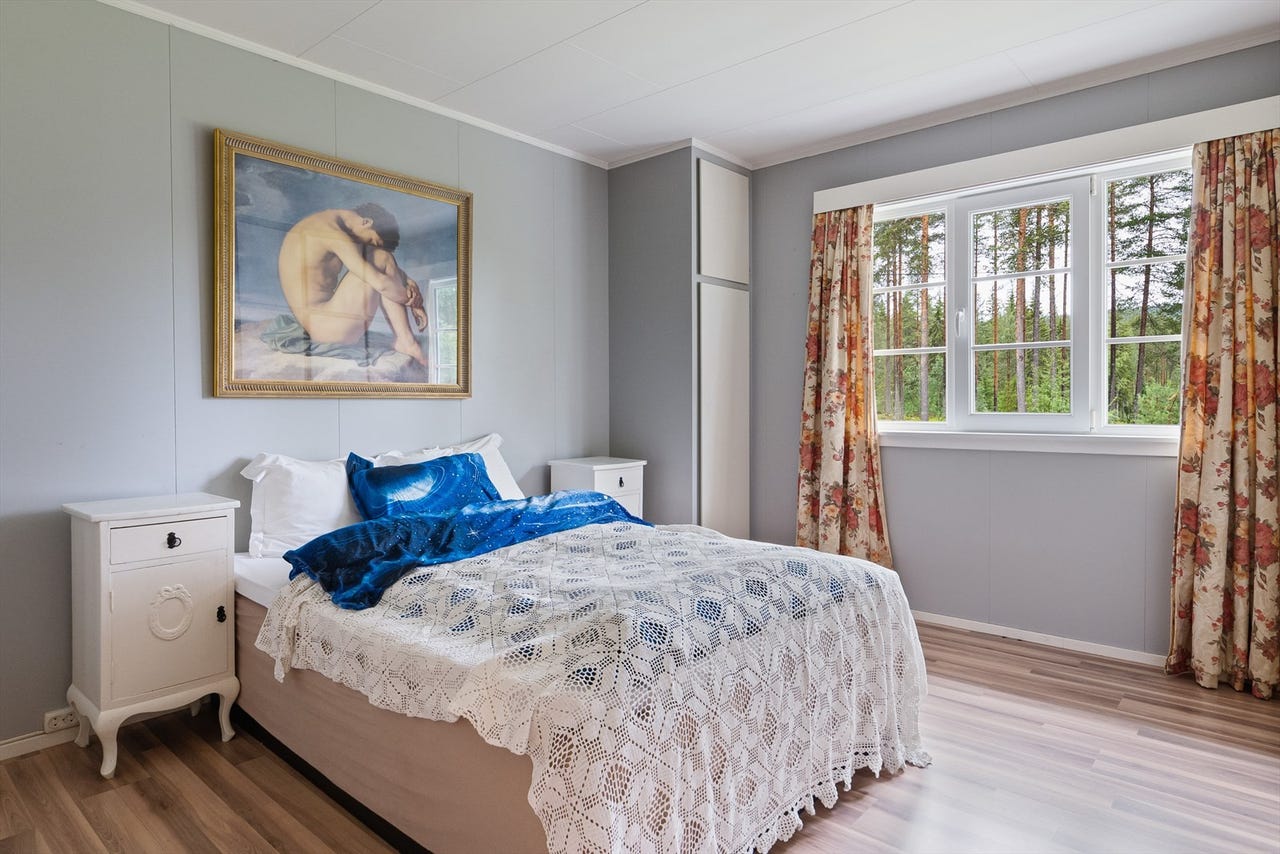 Boligen har til sammen tre soverom, alle med god størrelse og plass til det en måtte ønske av møblement. Soverom også i garasjen/annekset.