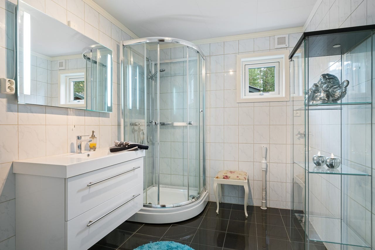 Overflater vegger og himling bad, vindu i våtsonen, dusjkabinett hindrer direkte vannsprut på vindu.