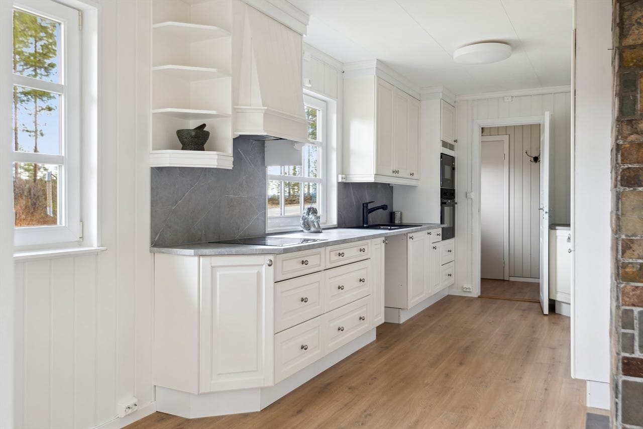 Kjøkkeninnredning montert i 2025, ukjent alder. Kjøkkeninnredning med laminert benkeplate, over og underskap, speil fronter, del med glassdører, kitchenboard over kjøkkenbenk, opplegg for oppvaskmaskin, ettgreps blandebatteri og to plast kummer. Integrert koketopp, micro, stekeovn, kjøl og frys. Tidligere vannlekkasje på kjøkken. Skaden er utbedret a forsikringsselskap i 2024.