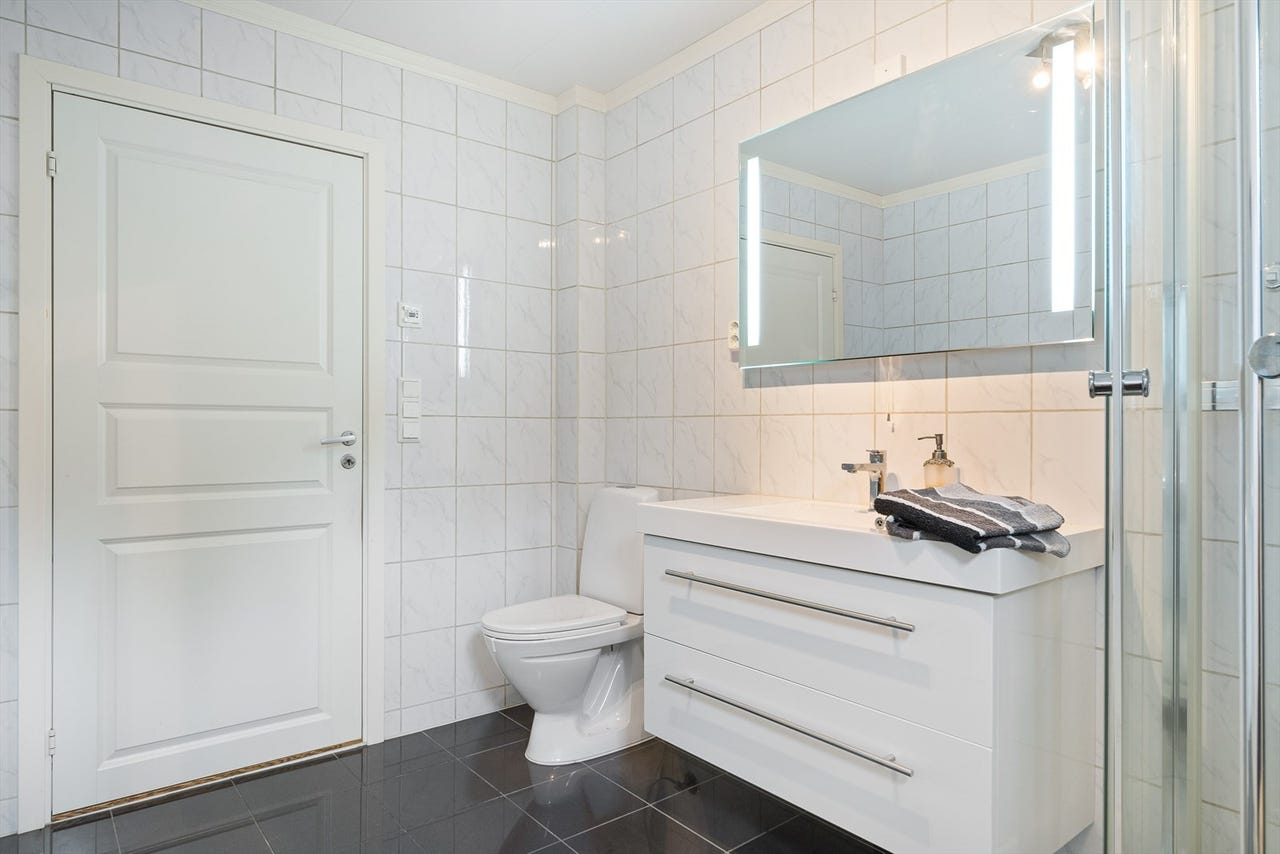 Bad/vaskerom i 1.etasje med overflater, installasjoner ogkomponenter fra 2014. Utført av: firma. Kilde: eiers opplysning. Gulvflater med fliser og membran utført som egeninnsats. Overflater med fliser. Dusjkabinett hindrer direkte vannsprut på overflatene. Himling med folierte takessplater. Gulvflater med fliser. Fallforhold er ikke fullstendig kontrollert på grunn av dusjkabinett. Varmekabler i baderomsgulv. Plastsluk. Smøremembran med ukjent utførelse. Bad/vaskerom med servant, dusjkabinett, toalett, ettgreps