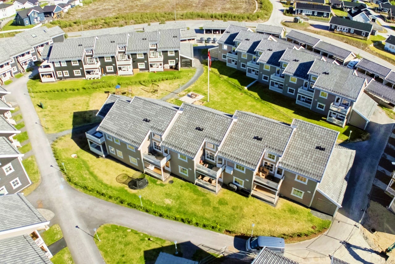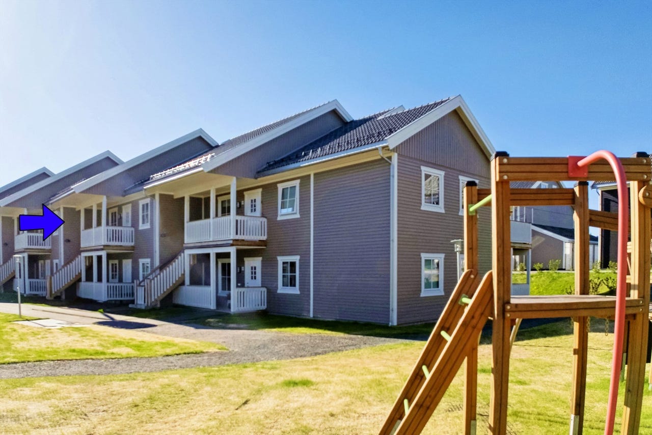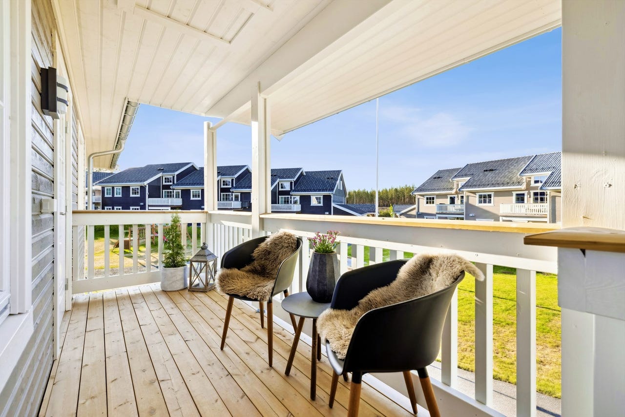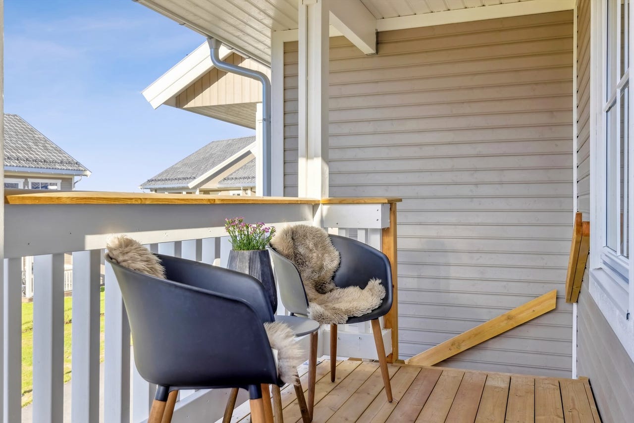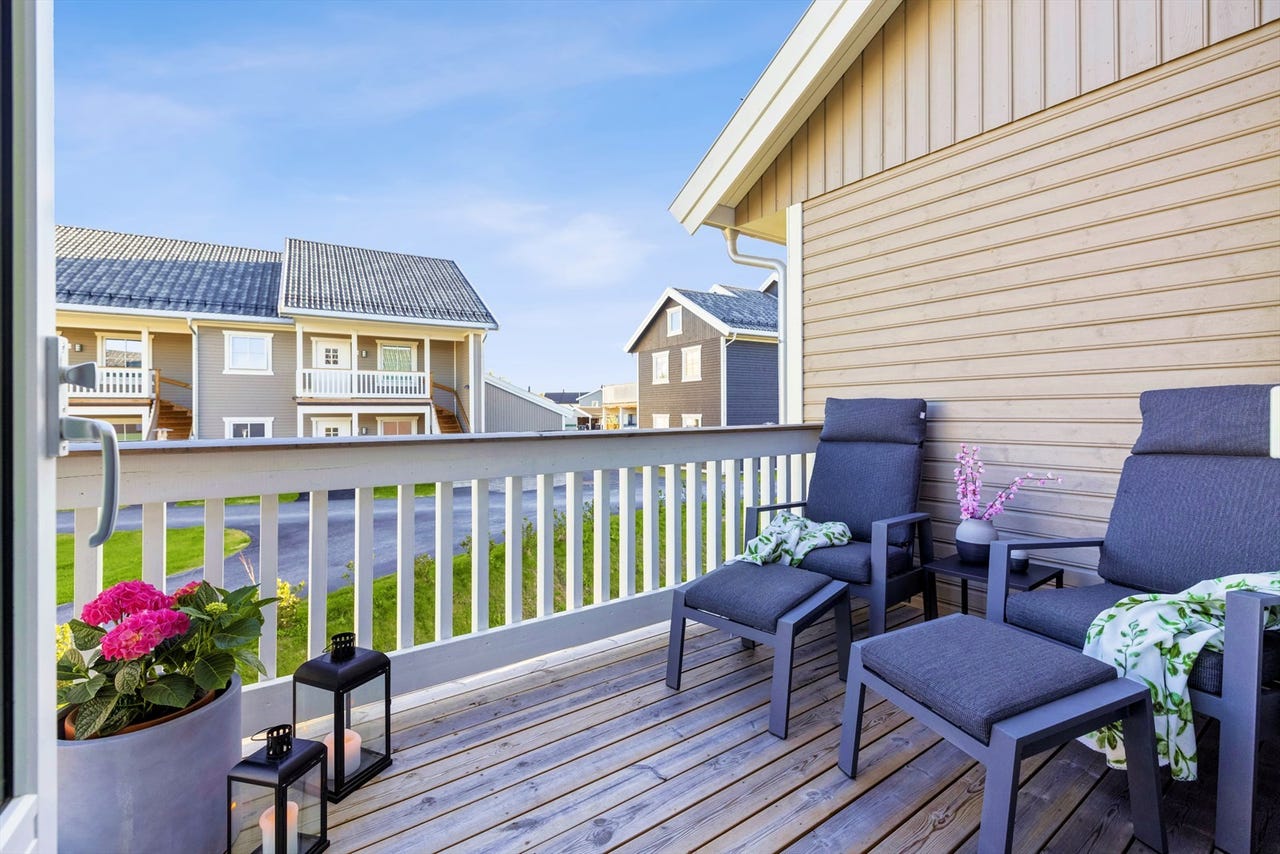 Det er adkomst til leiligheten via utvendig impregnert tretrapp med rekkverk og håndløper, opp til svalgang med overbygget terrasse ved inngang.
