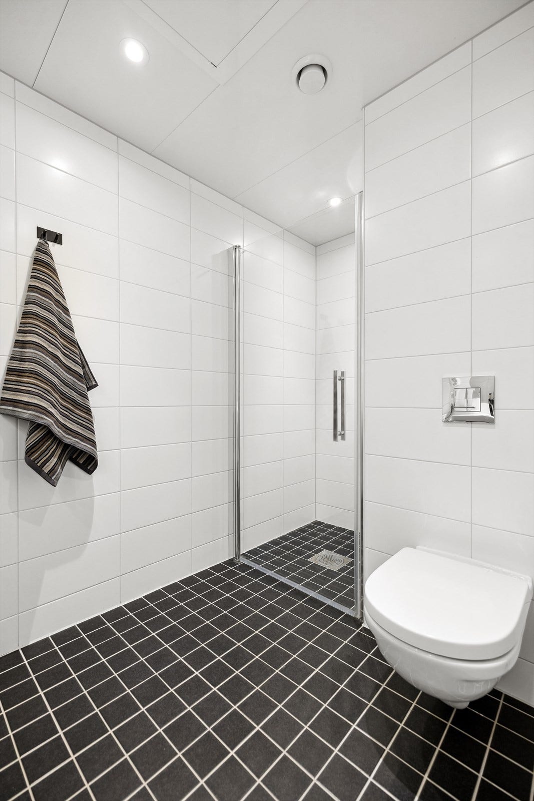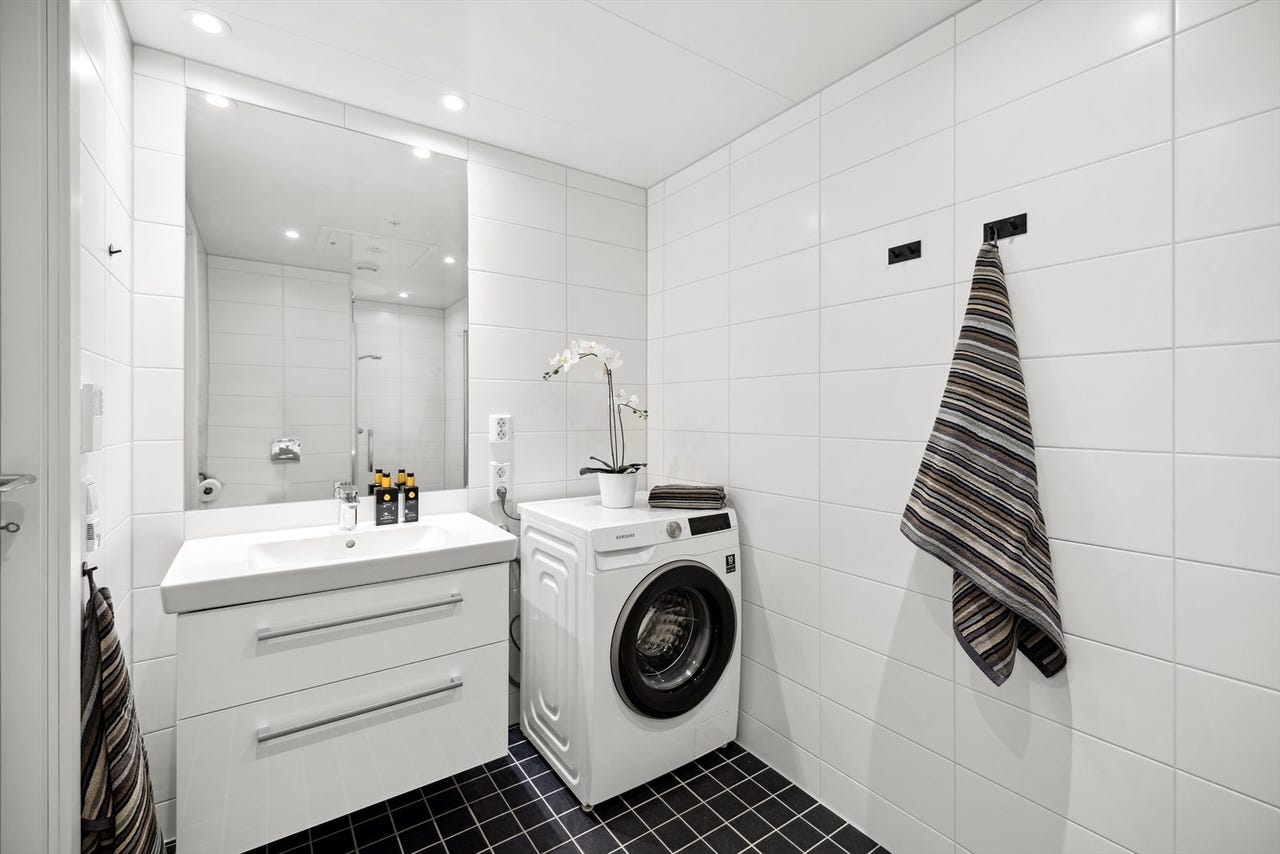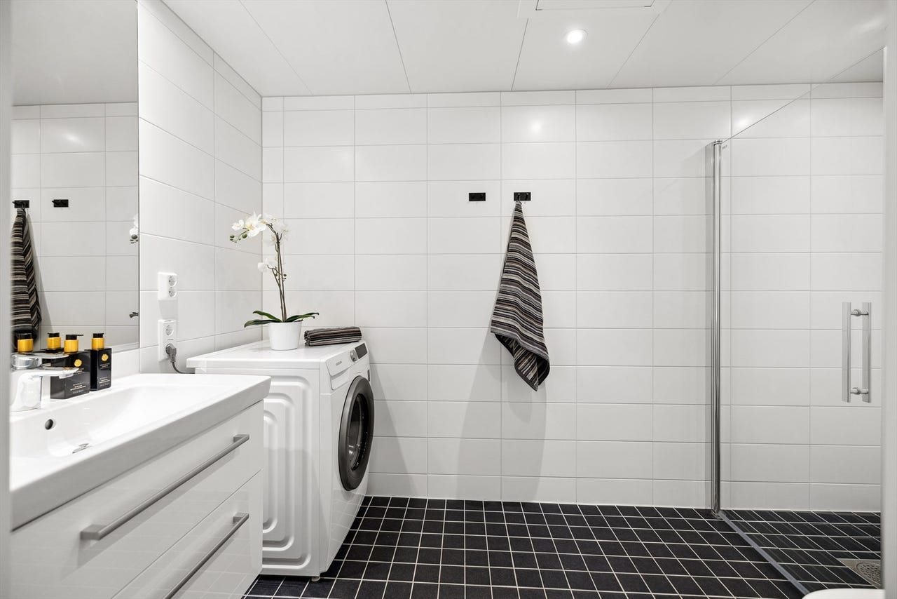 Delikat, lyst og flislagt bad med lettstelte overflater, beliggende mellom soverom 2 og bod/teknisk rom. Baderommet har innredning bestående av heldekkende servant i underskap med skuffer med demping og ett-greps armatur. Stort speil montert over innredning. Dushjørne er adskilt med dør i glass og har dusgarnityr med ett-greps armatur. Veggmontert toalett med toalettsisterne plassert i åpen løsning mot bakomforliggende teknisk rom med sluk i gulv. Opplegg for vaskemaskin og tørketrommel ved siden av servantskap. Det er sort flis på gulv med termostatstyrt elektrisk varme, vegger med sokkelflis og hvite fliser på vegg. Nedsenket himling med laminerte plater og installasjoner med downlights. Oppvarming med elektrisk gulvvarme. Innvendig fordelerskap (rør-i-rør) og hovedstoppekran er plassert i himling inne på baderommet.