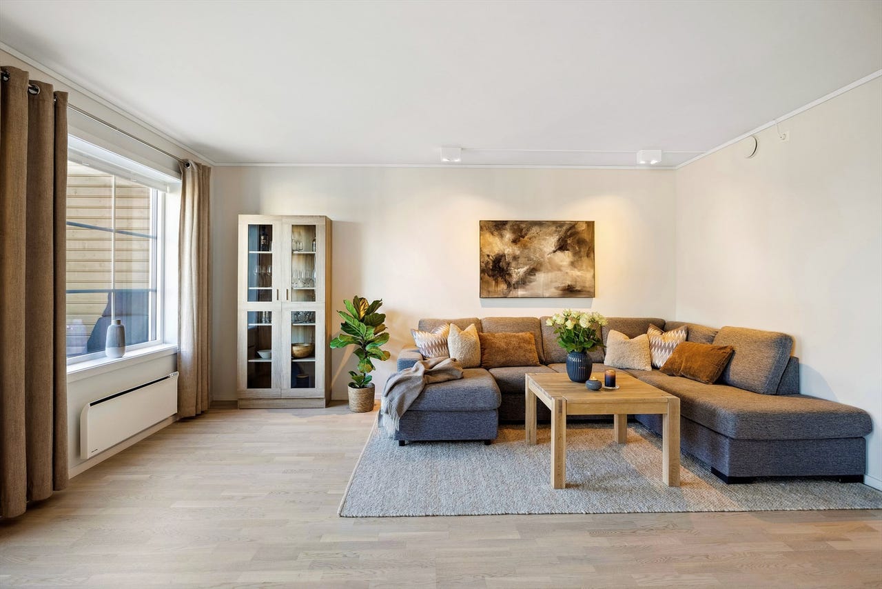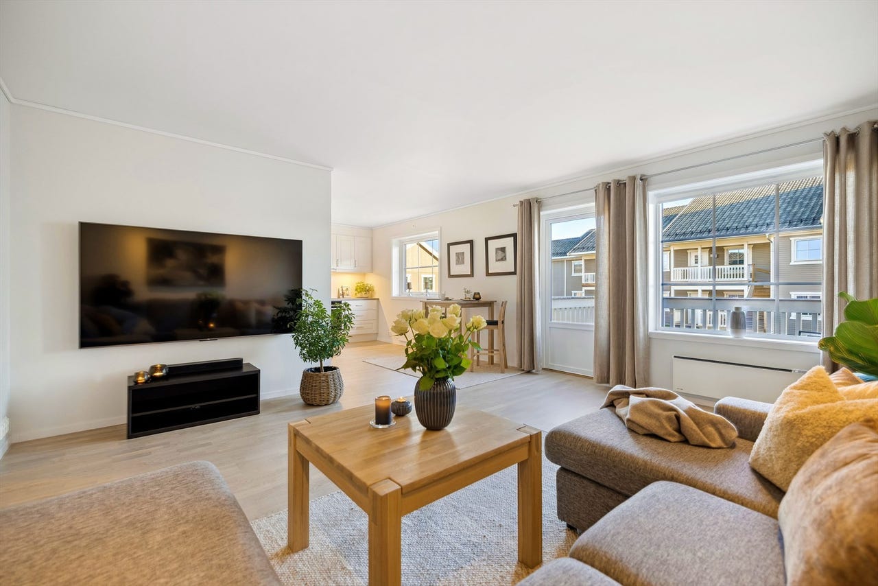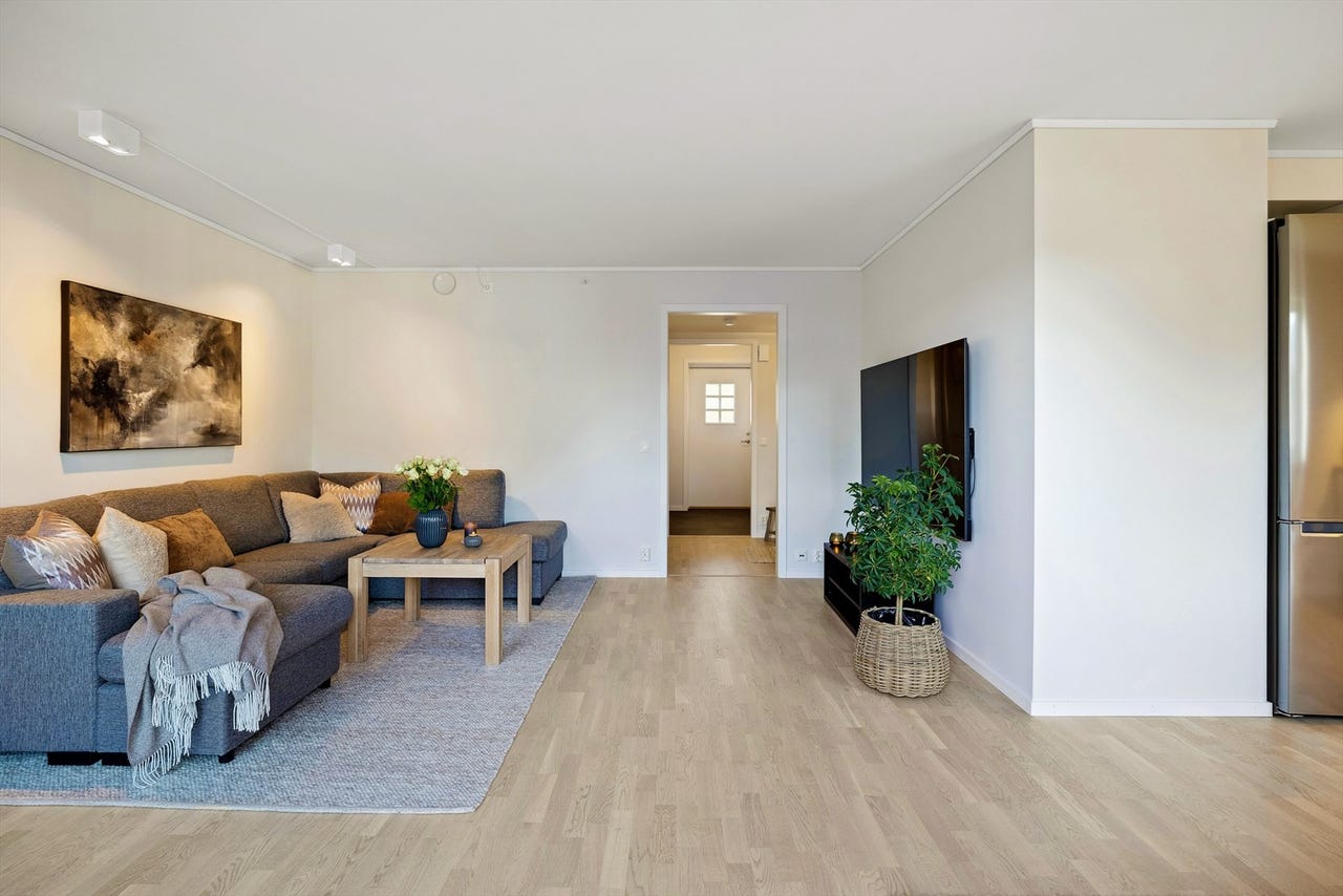 Stuen er lys og fresh med store vindusflater og har utgang til en lun, solrik og sørvendt terrasse med et fint utsyn til nærområdet og delvis skjermet innsyn. I stuen er det opplegg for kabel-TV/internett og det godt med strømuttak. Stuen er i en åpen løsning til spiseplassen og kjøkkenet, som gir en god og åpen romfølelse. Her er det god plass til et variert stuemøblement etter ønske og stil. Det er parkett på gulv, malte slette vegger i fargen Refleksjon og hvitmalt slett i himling, som også har 2 justerbare spotlights.