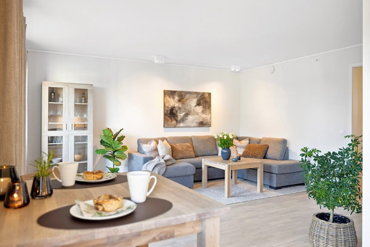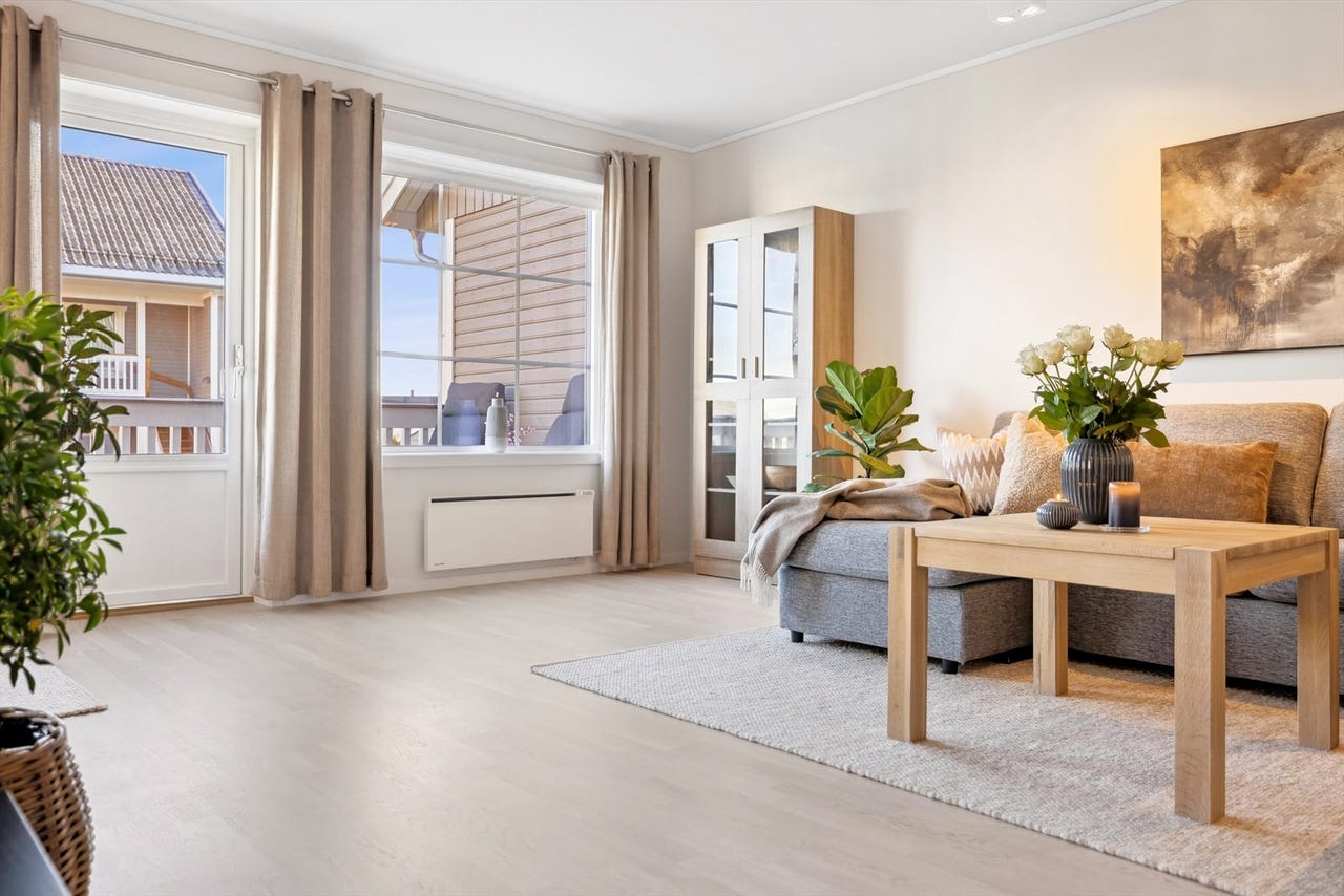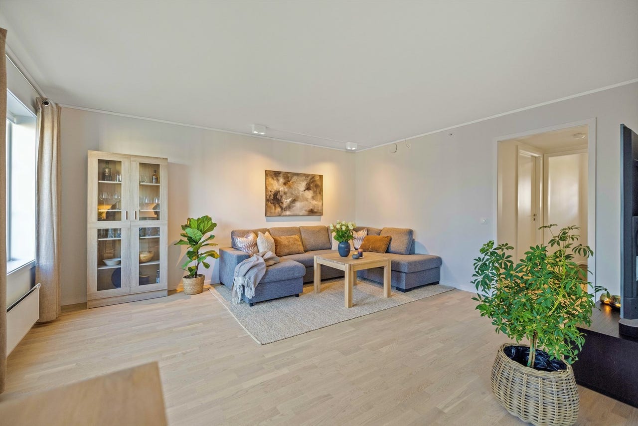 Stuen er lys og fresh med store vindusflater og har utgang til en lun, solrik og sørvendt terrasse med et fint utsyn til nærområdet og delvis skjermet innsyn. I stuen er det opplegg for kabel-TV/internett og det godt med strømuttak. Stuen er i en åpen løsning til spiseplassen og kjøkkenet, som gir en god og åpen romfølelse. Her er det god plass til et variert stuemøblement etter ønske og stil. Det er parkett på gulv, malte slette vegger i fargen Refleksjon og hvitmalt slett i himling, som også har 2 justerbare spotlights.